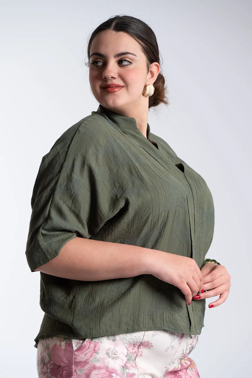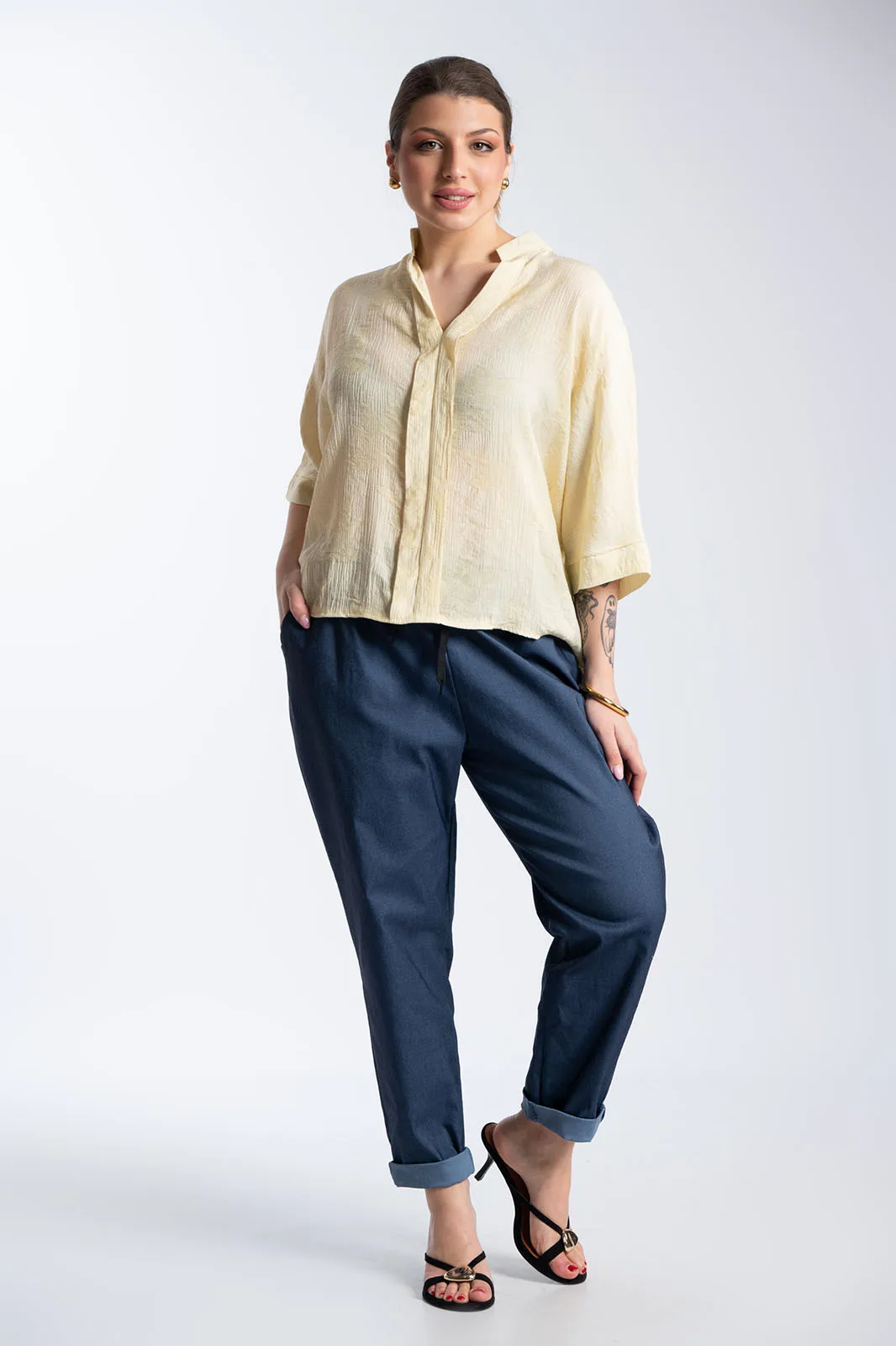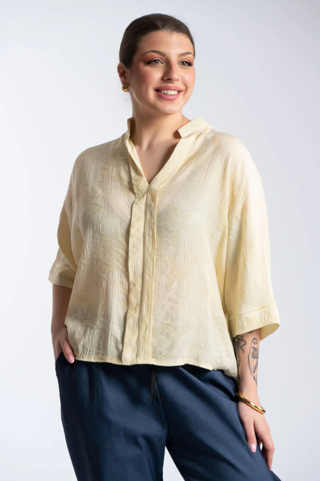A breezy blouse with a minimalist aesthetic that stands out for its effortless elegance. The loose fit and wide sleeves create a relaxed yet polished silhouette, perfect for stylish everyday looks. The subtle V-neckline at the front adds a feminine touch, while the fabric’s texture lends depth and interest without being over the top. A versatile piece that can be worn from morning to night, easily adapting to any style.