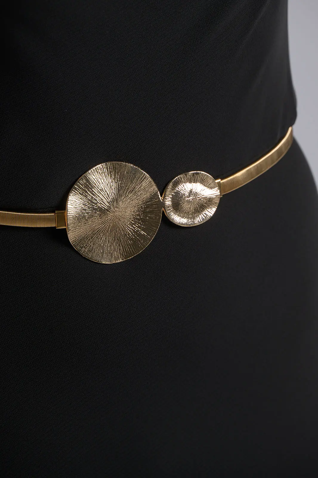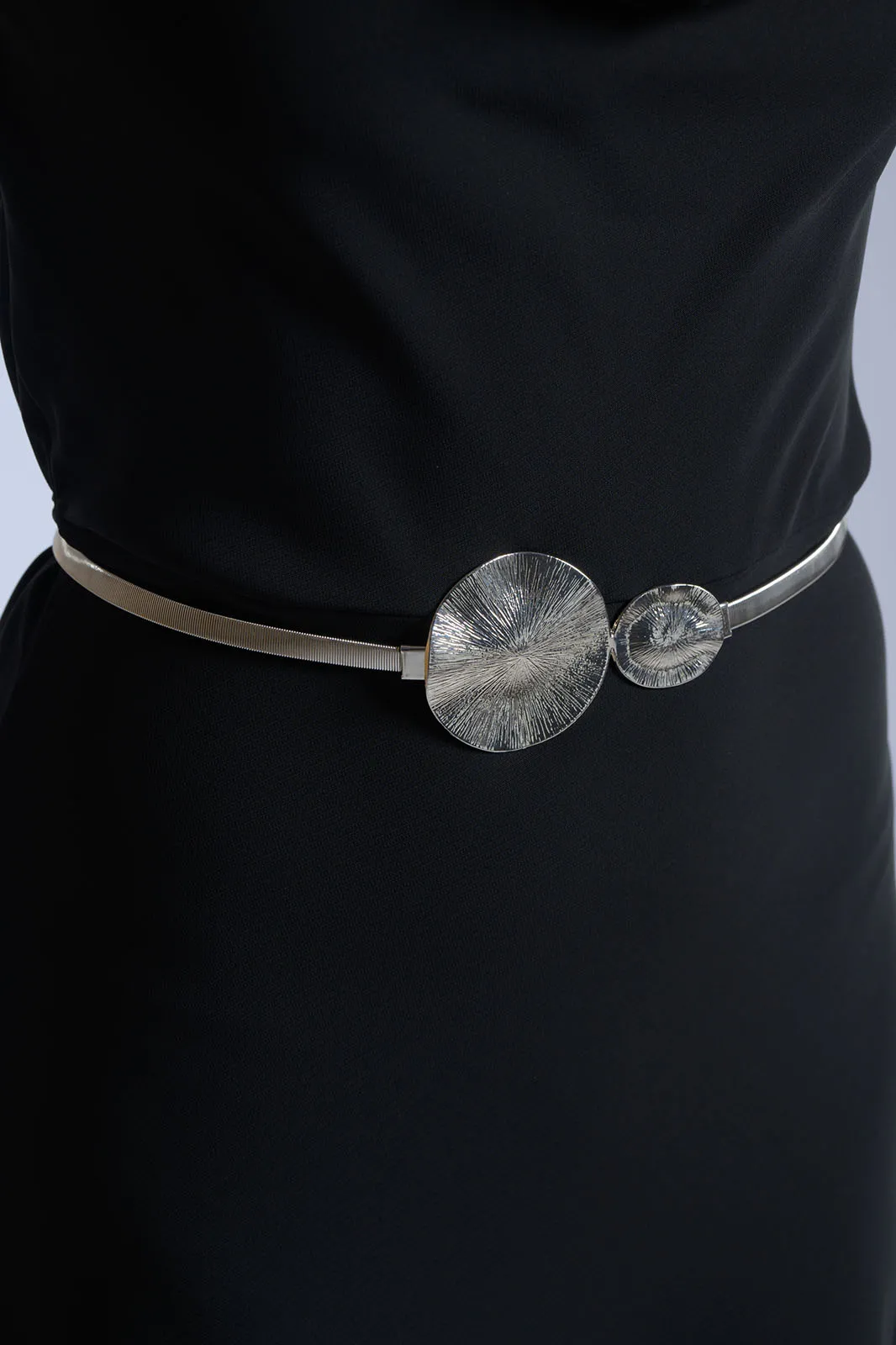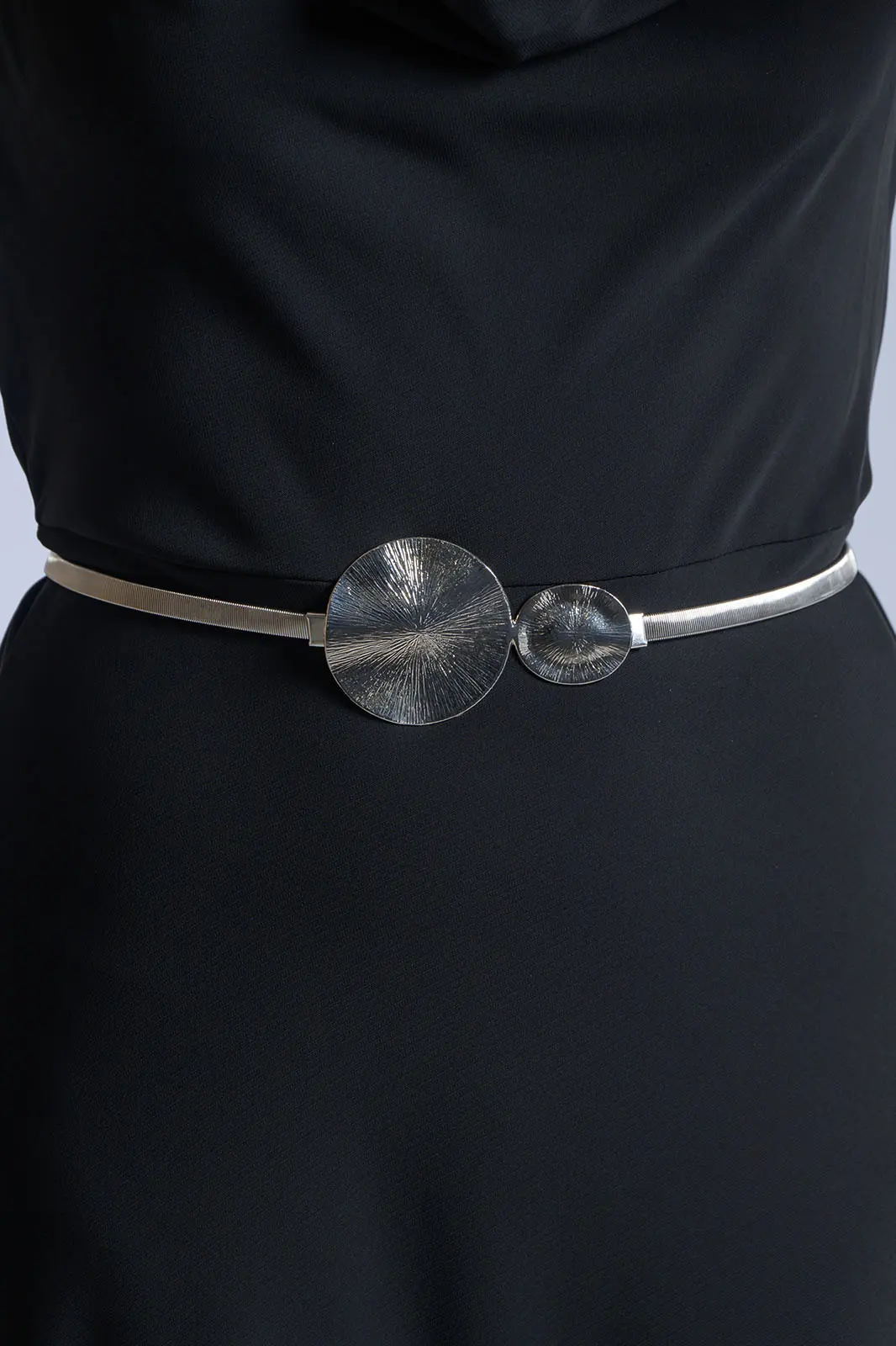 Γυναικεία μεταλλική ζώνη, με εύκαμπτο snake chain σχεδιασμό. Το κούμπωμα έχει στρογγυλά ανάγλυφα στοιχεία στο μπροστινό μέρος και κλείνει με γάντζο. Ιδανική για να φορεθεί πάνω από φορέματα ή σακάκια, προσθέτοντας λάμψη και statement χαρακτήρα σε κάθε εμφάνιση. Το ελάχιστο μήκος της είναι 69cm και μέγιστο 120cm.