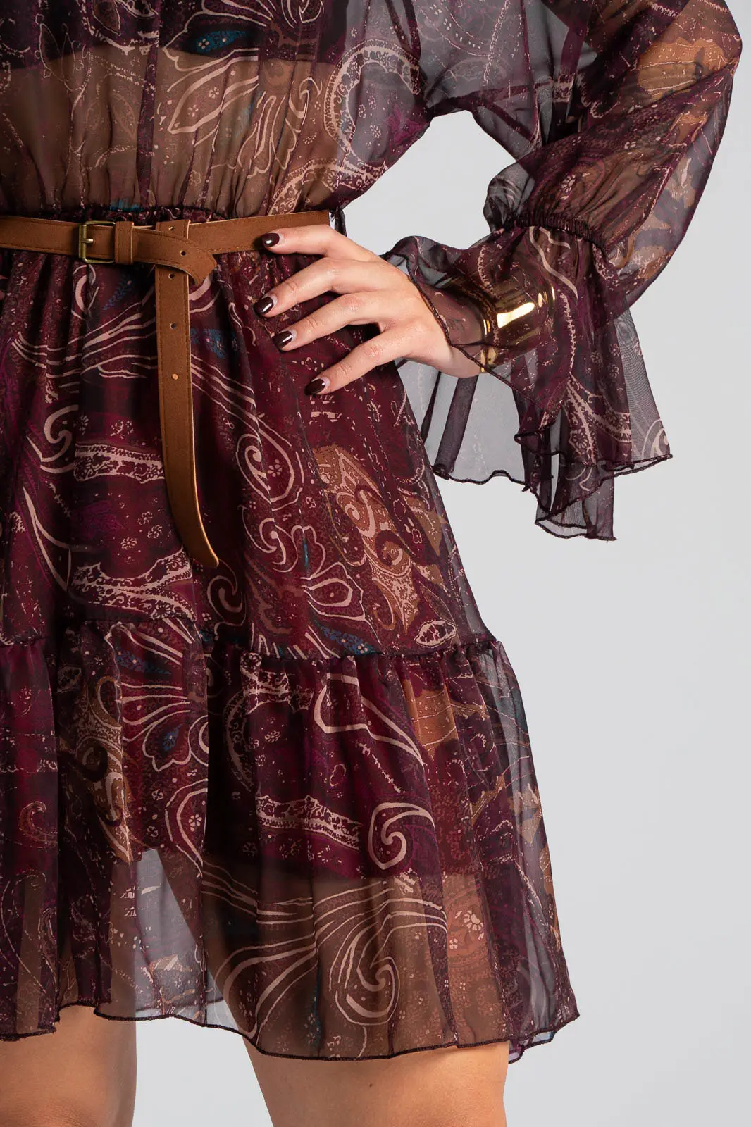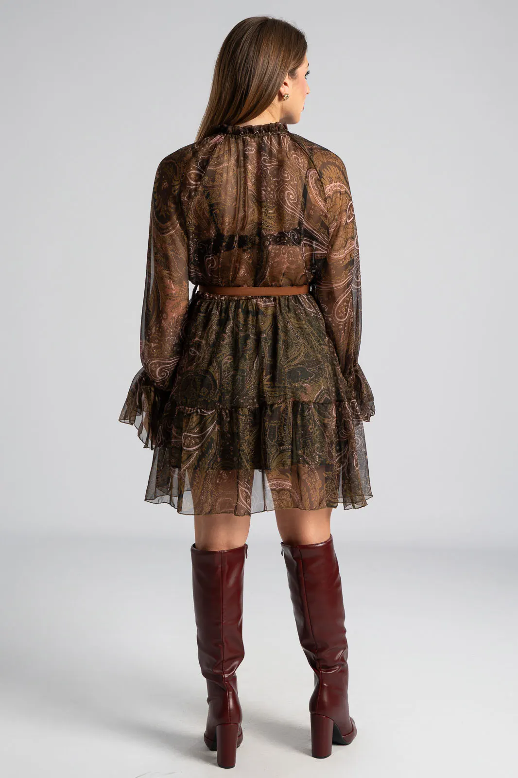 Mini dress with a lahour design. It is slightly see-through and lined at the bottom. It has elastic at the waist for a better fit and comes with its own belt. It has a V-neckline and ties with strings, with ruffles around the neckline. It has long sleeves with elastic at the cuffs. It has ruffles at the hem. The measurements in the table are representative of each product. Dress: 100% viscose, Lining: 95% polyester, 5% elastane.