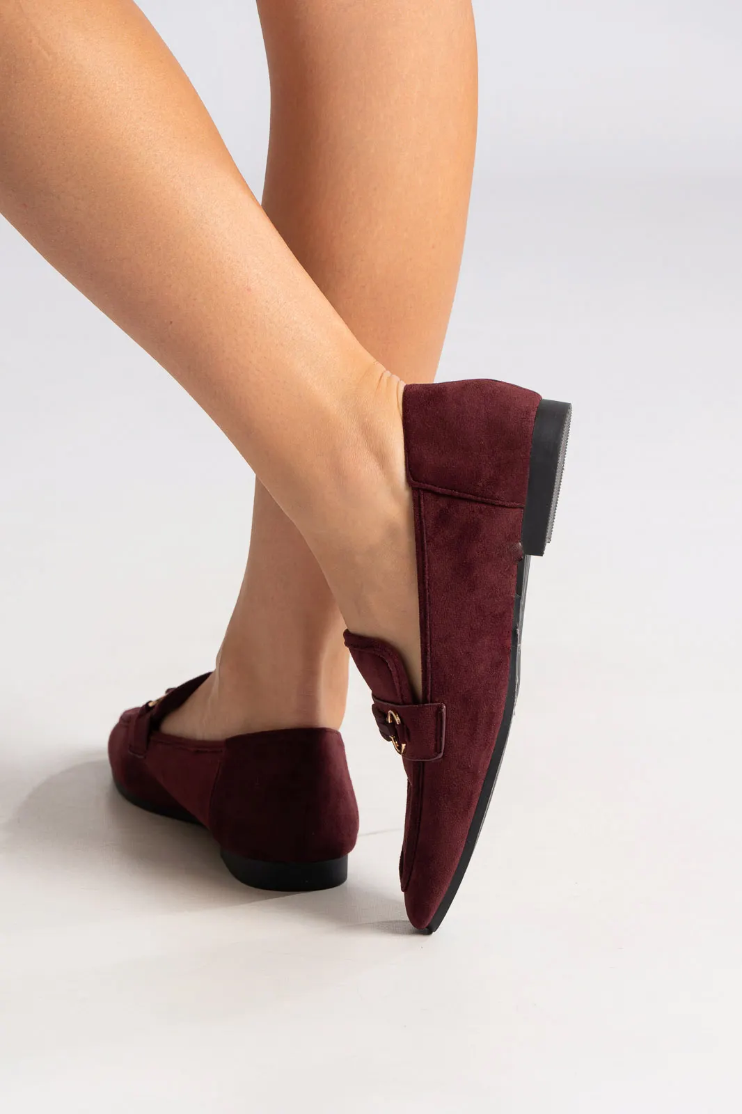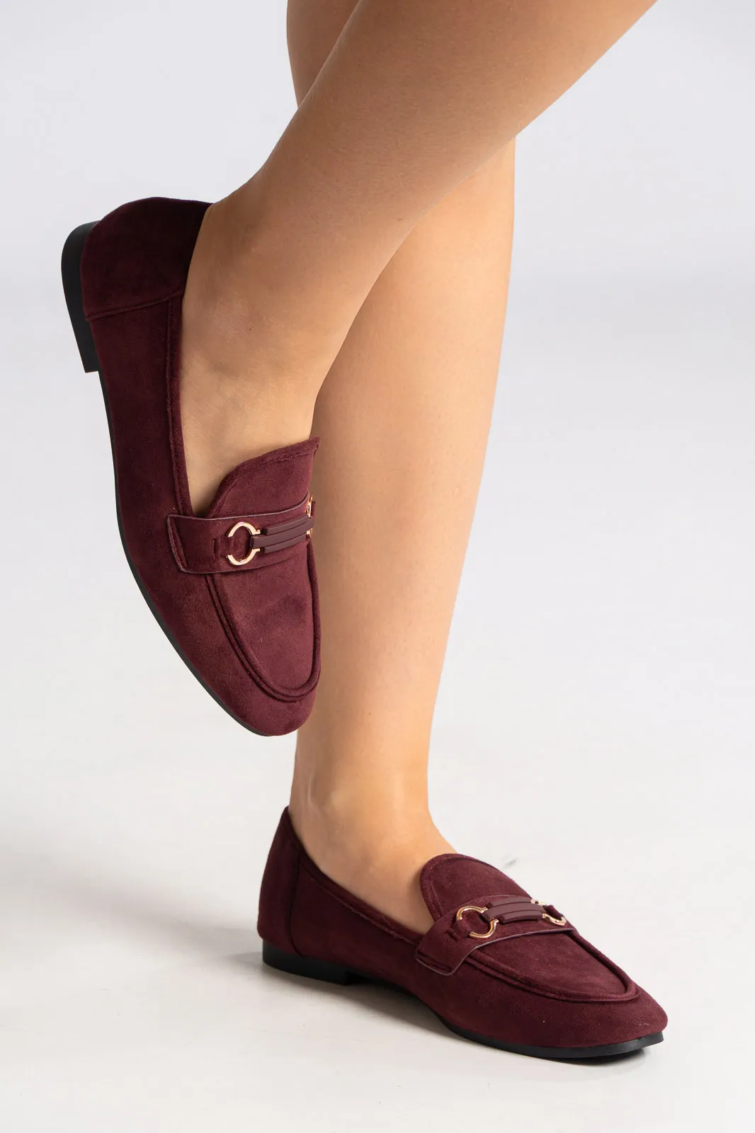 Flat moccasins with suede texture. They have a rounded toe. They feature a decorative metal buckle with leatherette detail on the instep.