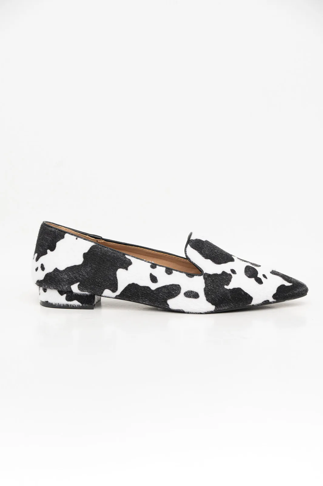 Ballet shoes with a pony skin texture. They are flat and have a pointed toe. They are an ideal choice for any occasion.