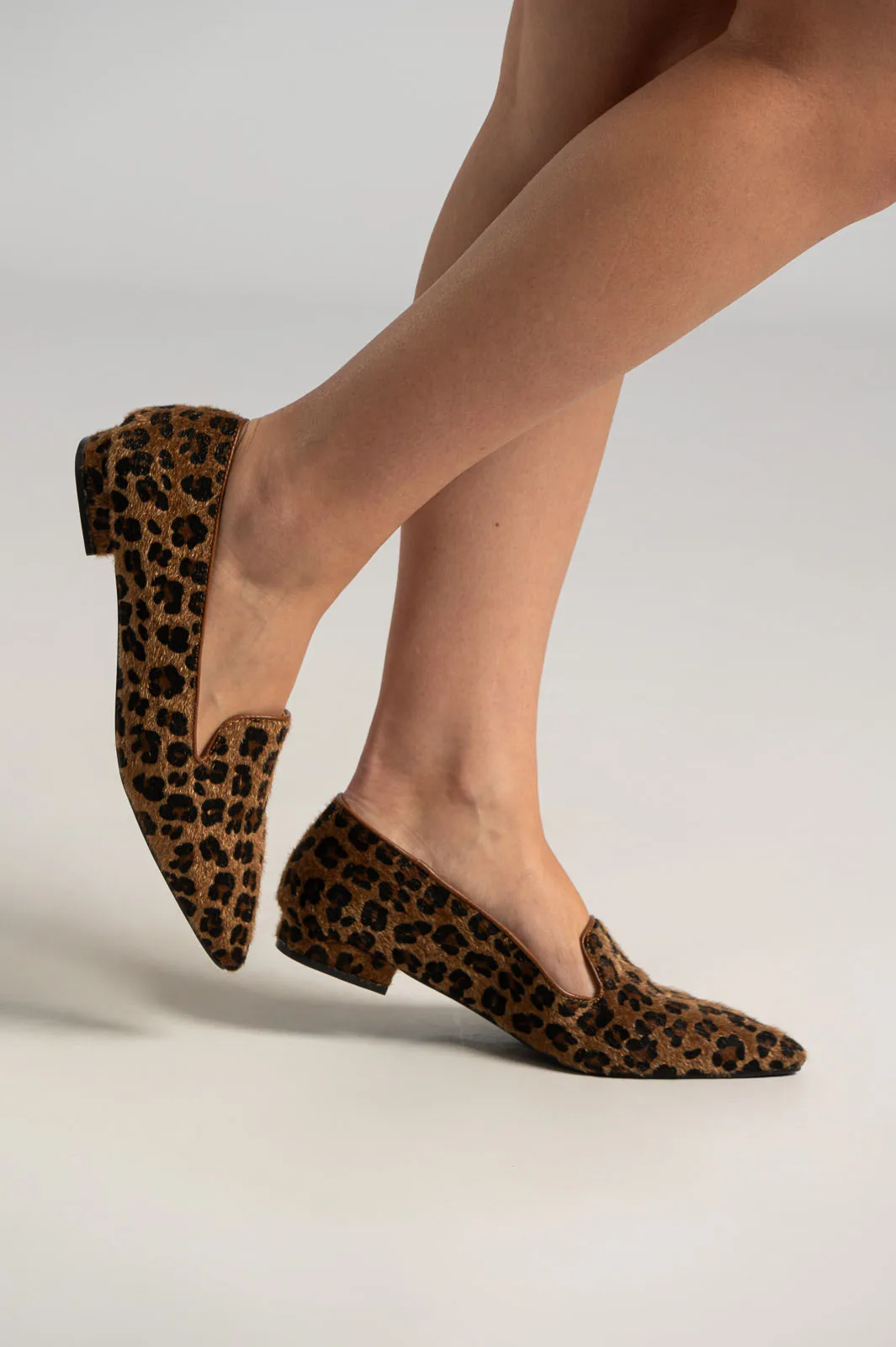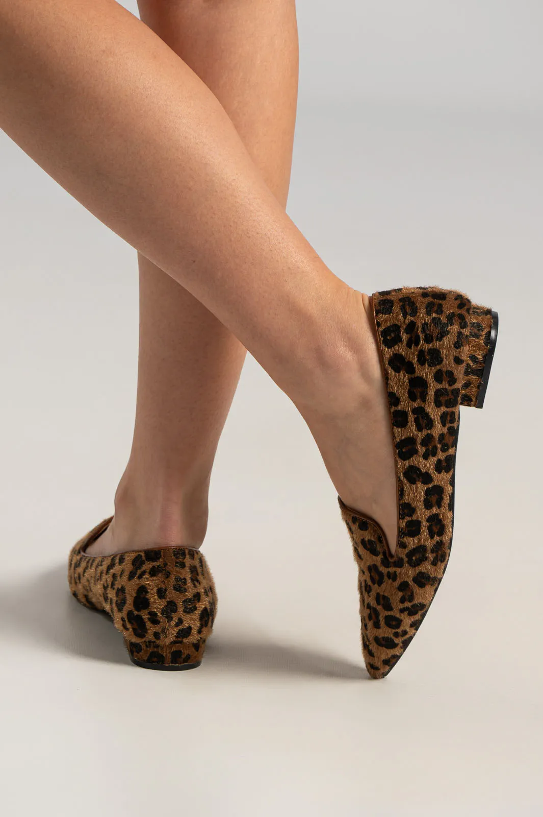 Ballet shoes with a pony skin texture. They are flat and have a pointed toe. They are an ideal choice for any occasion.