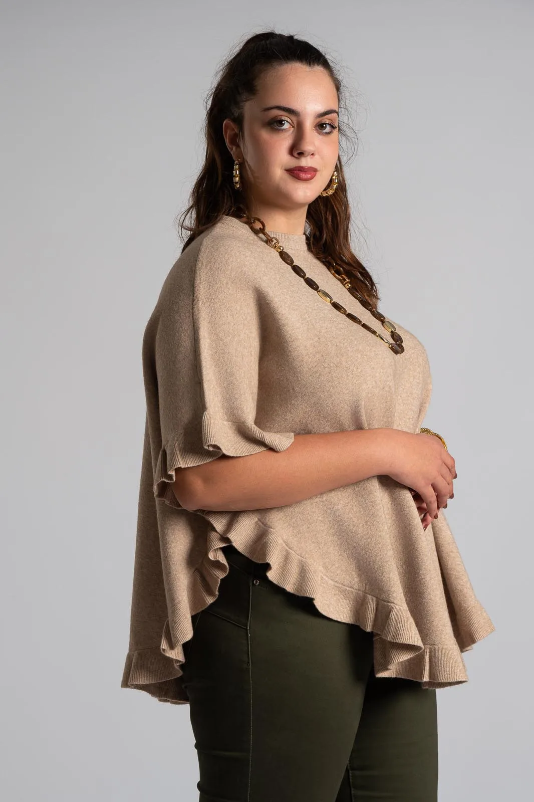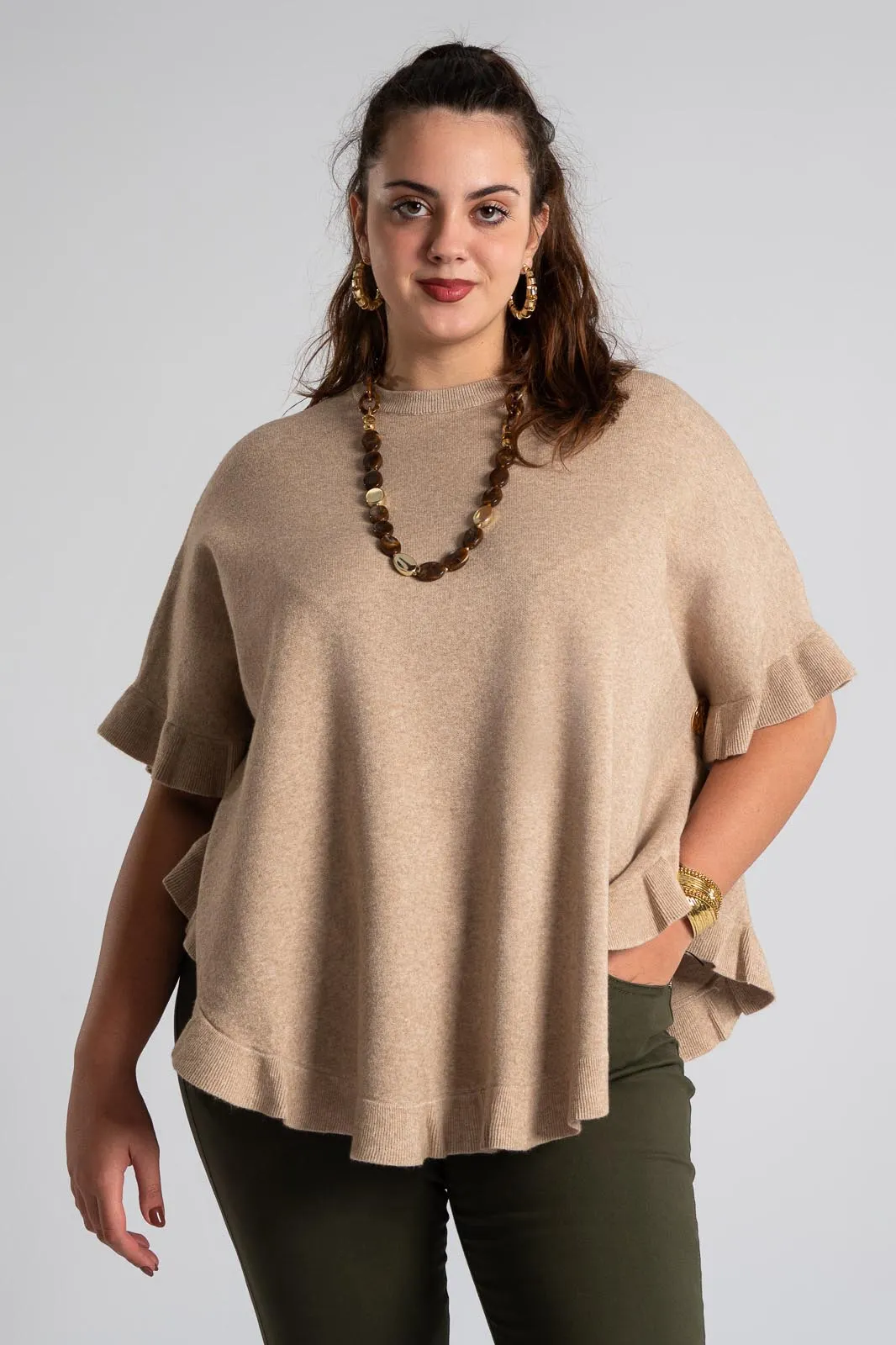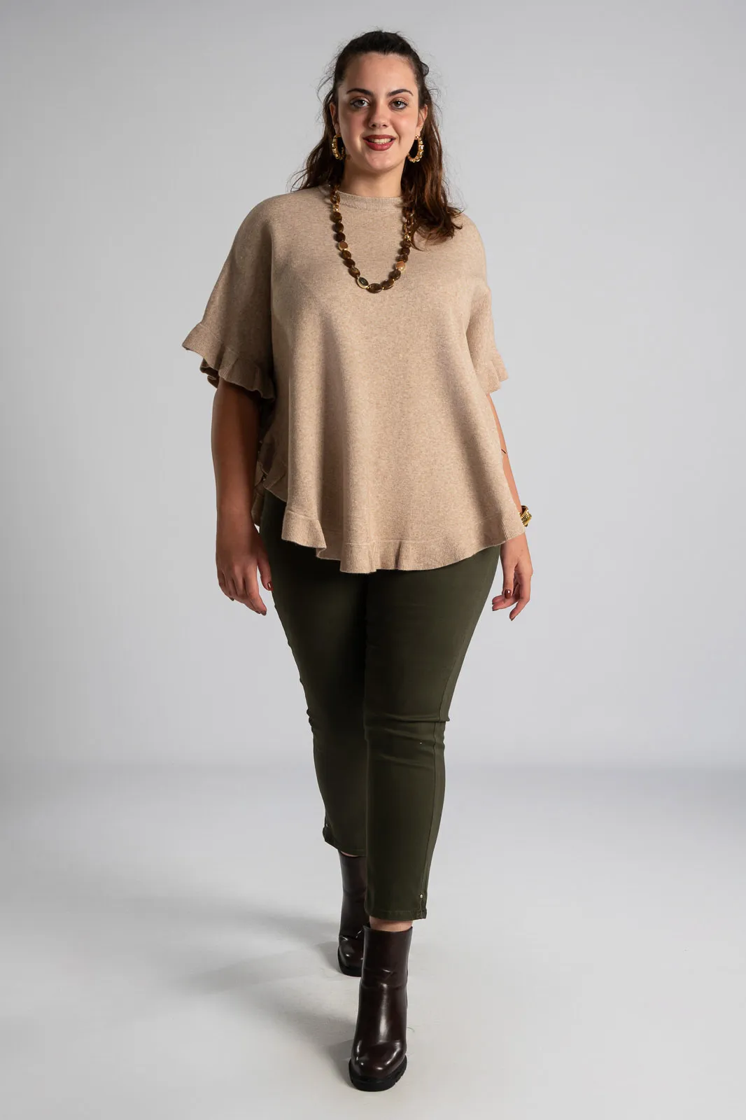 Μπλούζα με στρογγυλή λαιμόκοψη. Έχει 3/4 μανίκια και καταλήγει στο κάτω μέρος με διακοσμητικό μεταλλικό κουμπί. Έχει ασύμμετρο τελείωμα με βολάν σε όλη την επιφάνεια. Οι μετρήσεις του πίνακα είναι αντιπροσωπευτικές για κάθε προϊόν. 35% viscose, 35% polyamide, 20% acrylic, 10% elastan.
