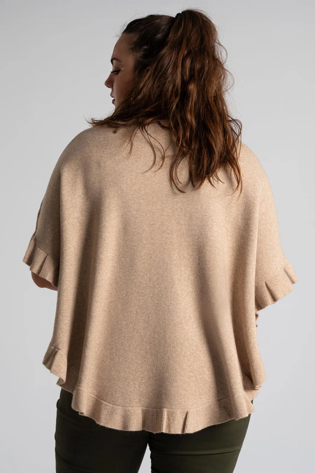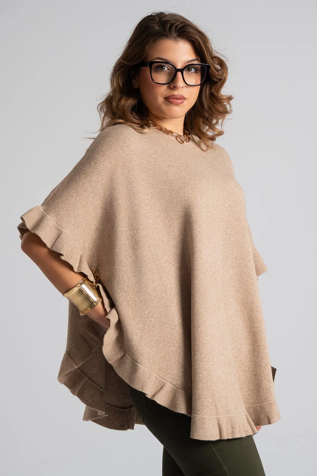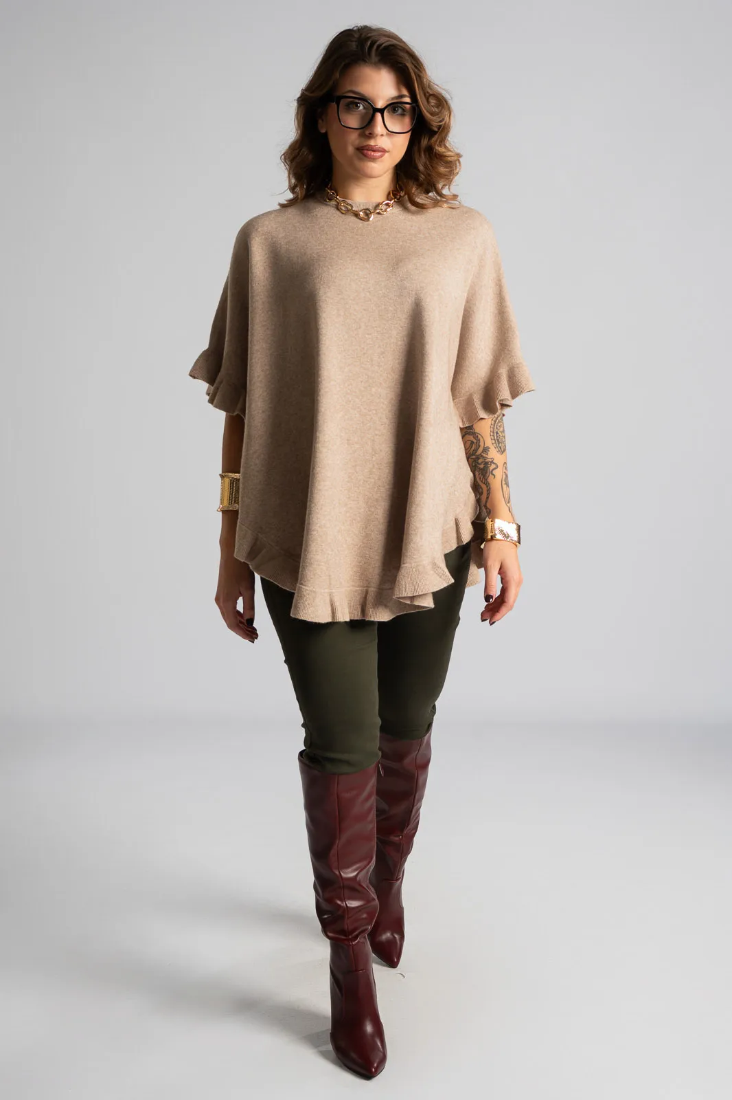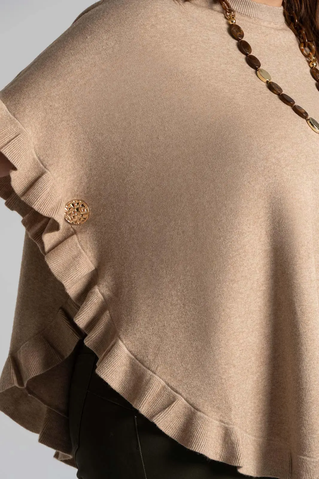 Μπλούζα με στρογγυλή λαιμόκοψη. Έχει 3/4 μανίκια και καταλήγει στο κάτω μέρος με διακοσμητικό μεταλλικό κουμπί. Έχει ασύμμετρο τελείωμα με βολάν σε όλη την επιφάνεια. Οι μετρήσεις του πίνακα είναι αντιπροσωπευτικές για κάθε προϊόν. 35% viscose, 35% polyamide, 20% acrylic, 10% elastan.