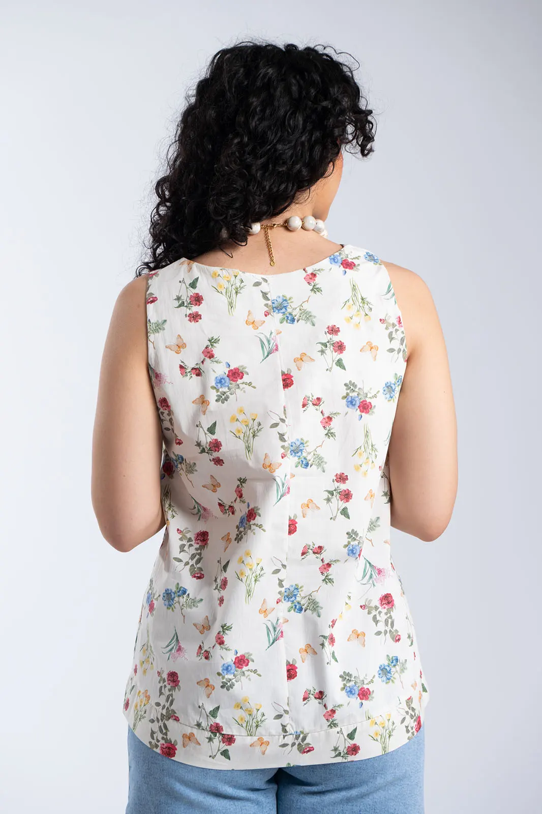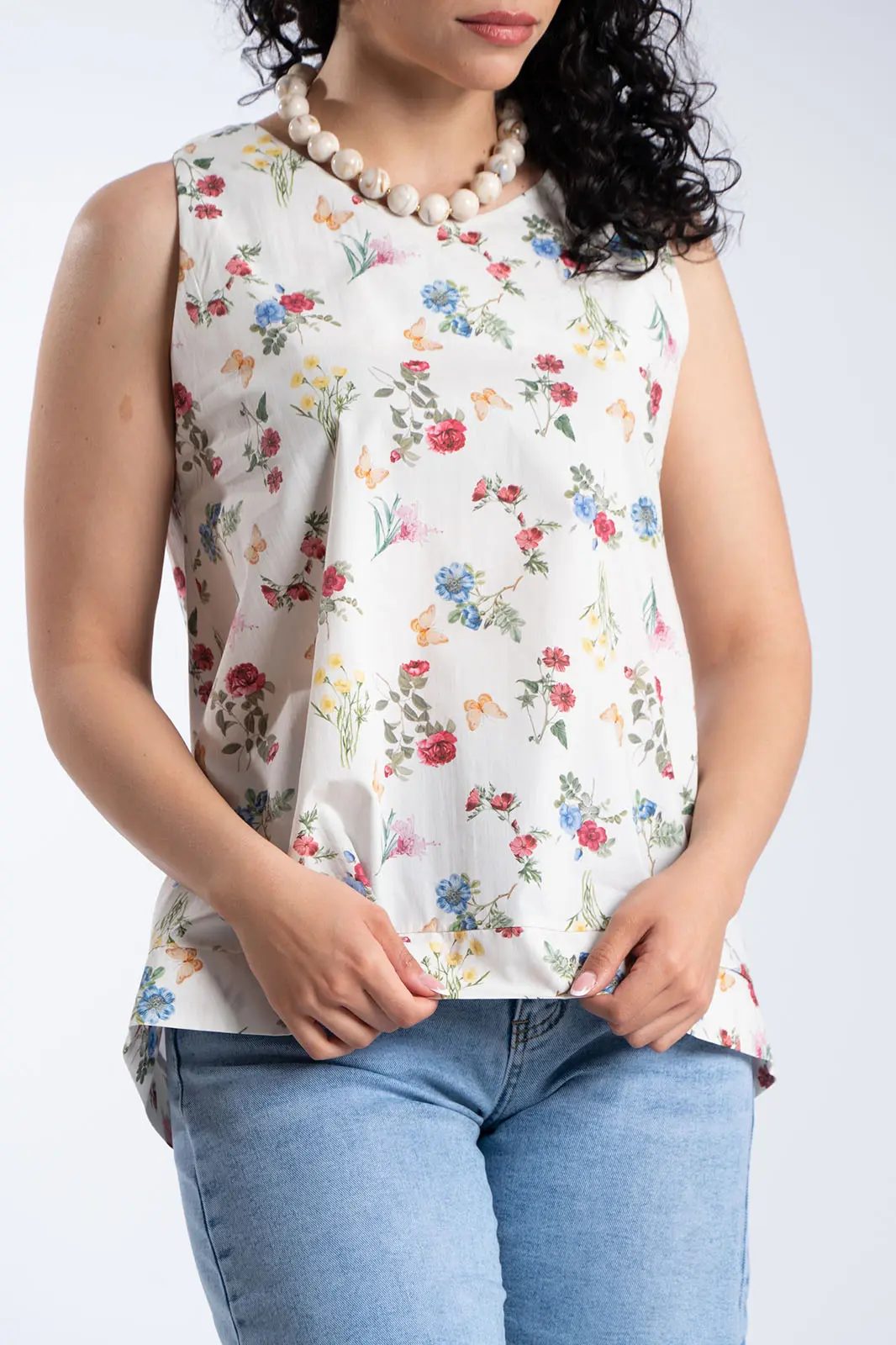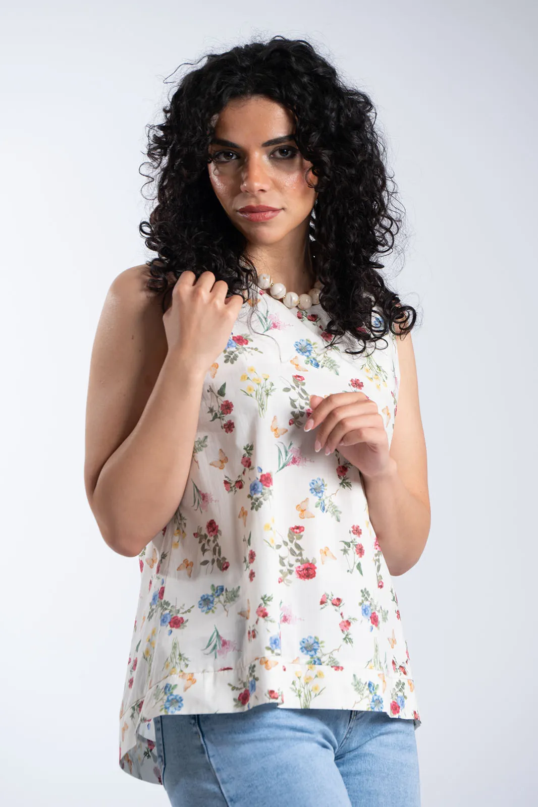 Αέρινη και ρομαντική αμάνικη μπλούζα με φίνο floral print σε λευκή βάση, που αποπνέει φρεσκάδα και θηλυκότητα. Τα μικρά λουλούδια σε αρμονικούς χρωματικούς συνδυασμούς δημιουργούν ένα κομψό και διαχρονικό αποτέλεσμα, ιδανικό για καθημερινές αλλά και πιο προσεγμένες εμφανίσεις.