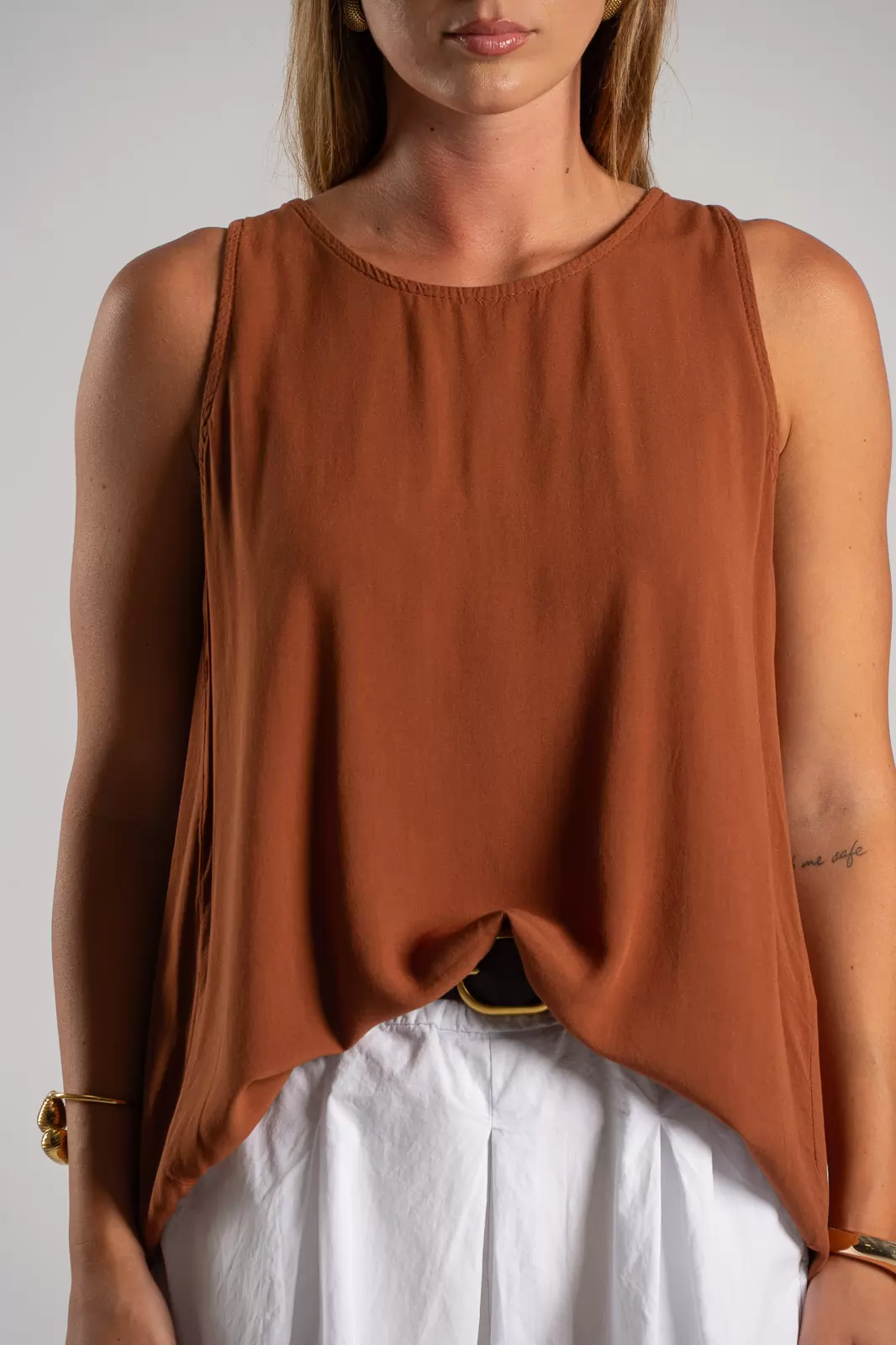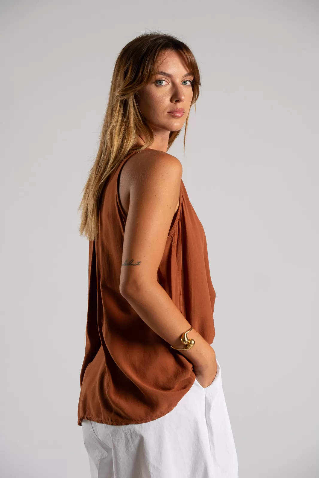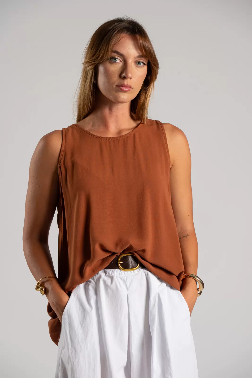 Μπλούζα αμάνικη με στρογγυλή λαιμόκοψη. Είναι σε ίσια γραμμή και στο πίσω μέρος είναι ελαφρώς πιο μακριά. Στο πίσω μέρος διαθέτει μεγάλη πιέτα. Το ύφασμα της είναι πολύ δροσερό και μαλακό. Οι μετρήσεις του πίνακα είναι αντιπροσωπευτικές για κάθε κωδικό. 100% viscose.