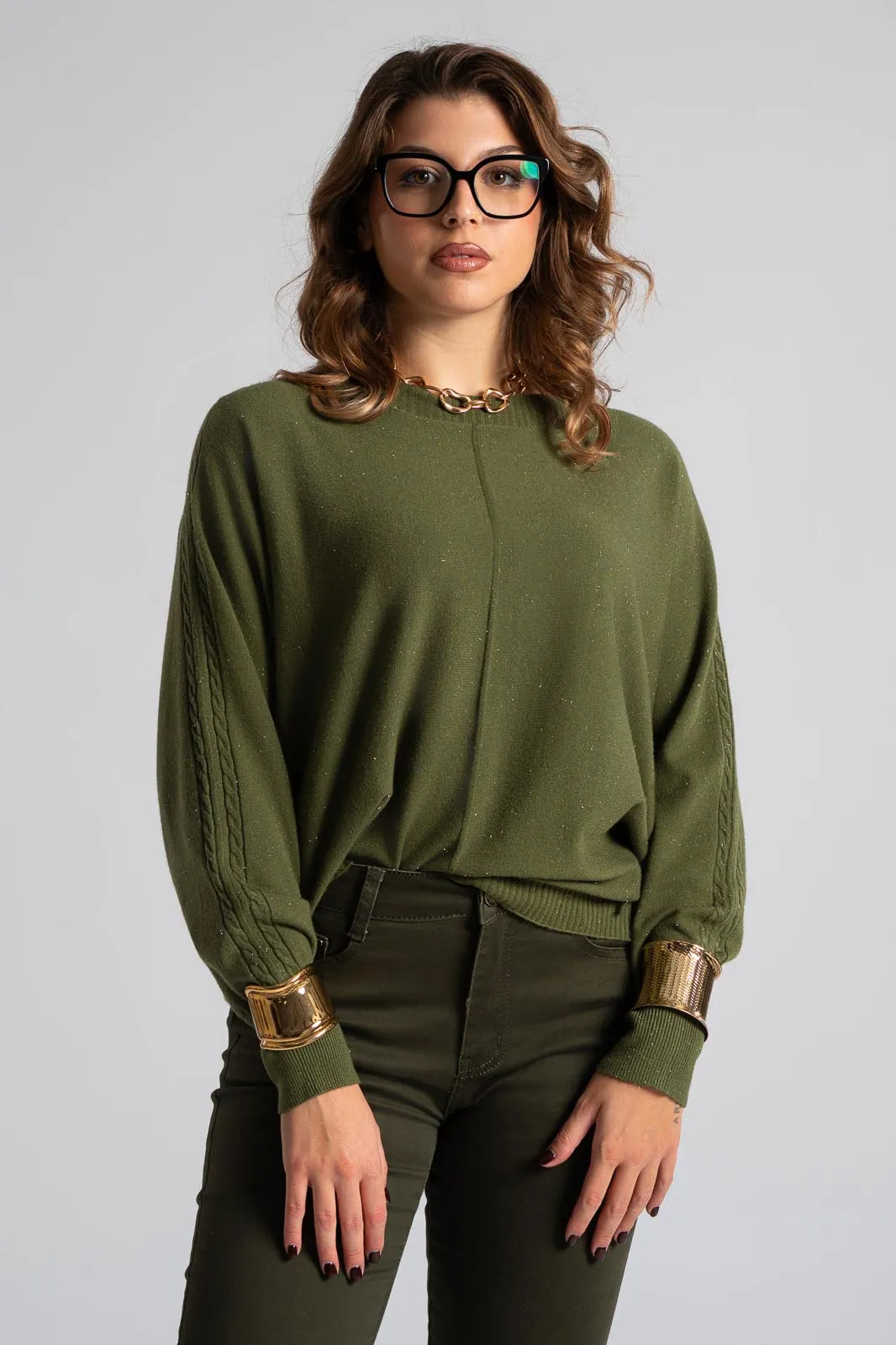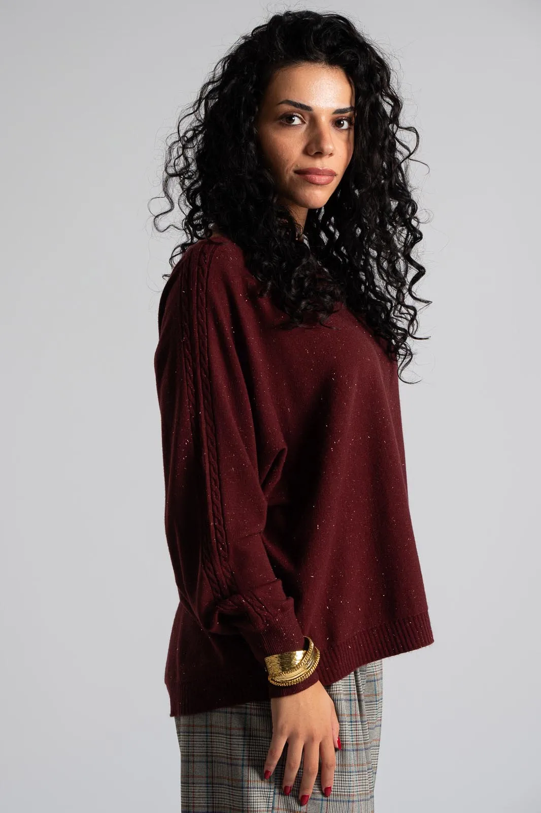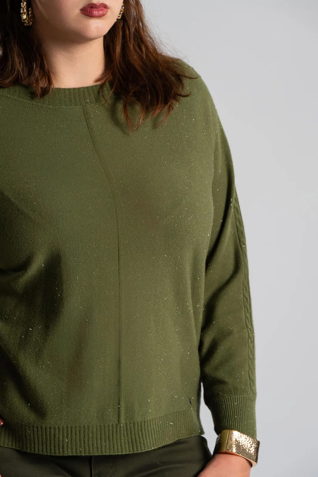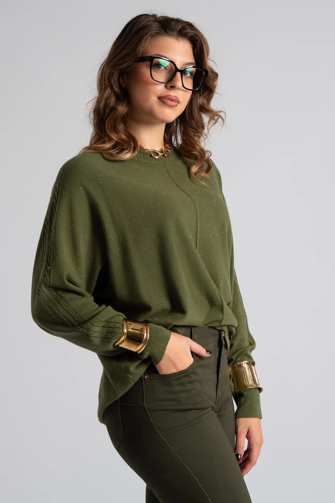 Μπλούζα νημάτινη με συμπαγή πλέξη. Διαθέτει στρογγυλή λαιμόκοψη. Έχει μακριά μανίκια με ανάγλυφη πλέξη. Σε όλη την επιφάνεια έχει διακριτική λάμψη μεταλλιζέ στην ίδια απόχρωση και υφή. Στο μπροστινό μέρος έχει μικρό διακοσμητικό μεταλλικό στοιχείο. Οι μετρήσεις του πίνακα είναι αντιπροσωπευτικές για κάθε προϊόν. 30% polyamide,30% viscose, 20% modal, 20% elastan.