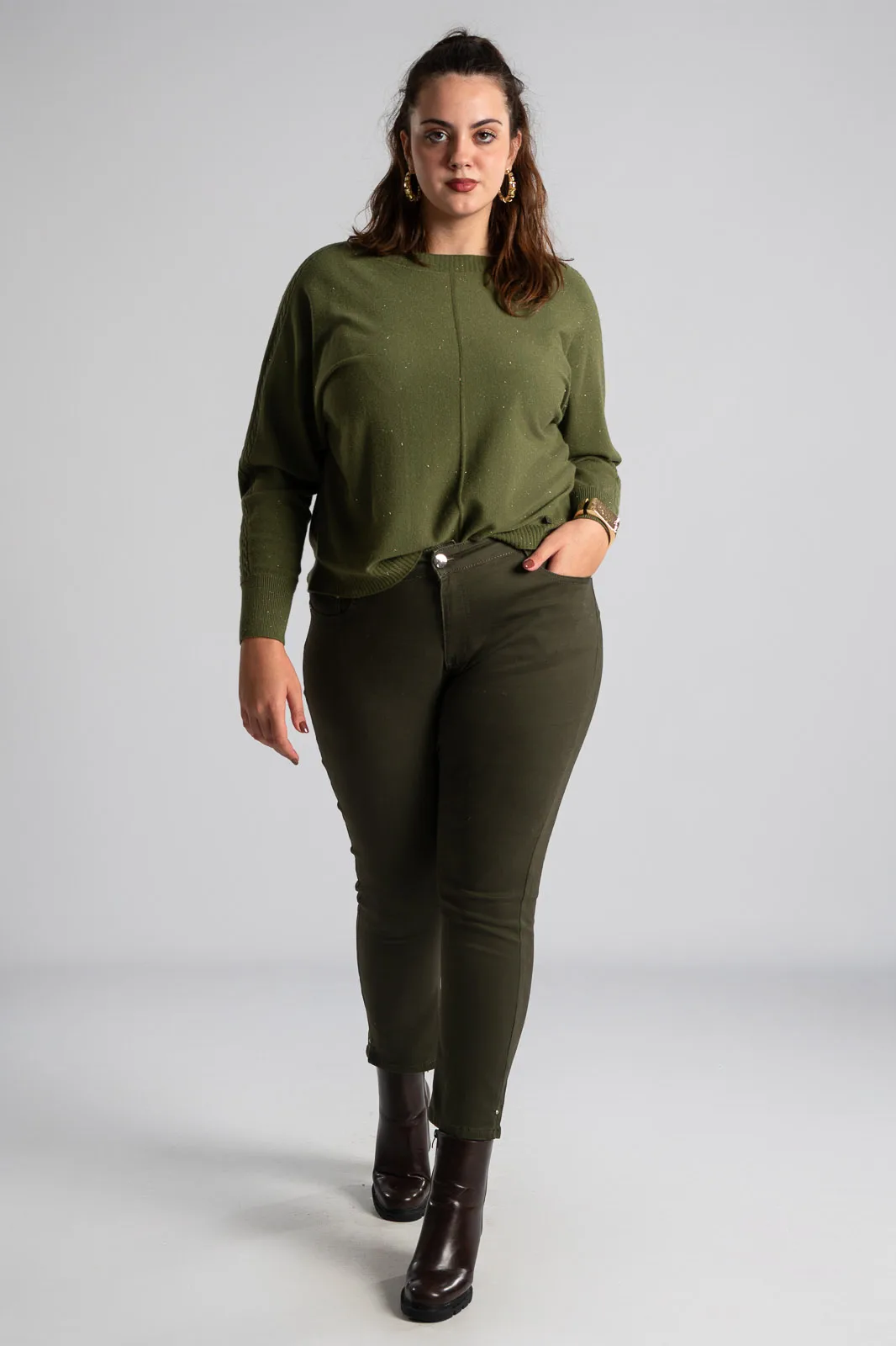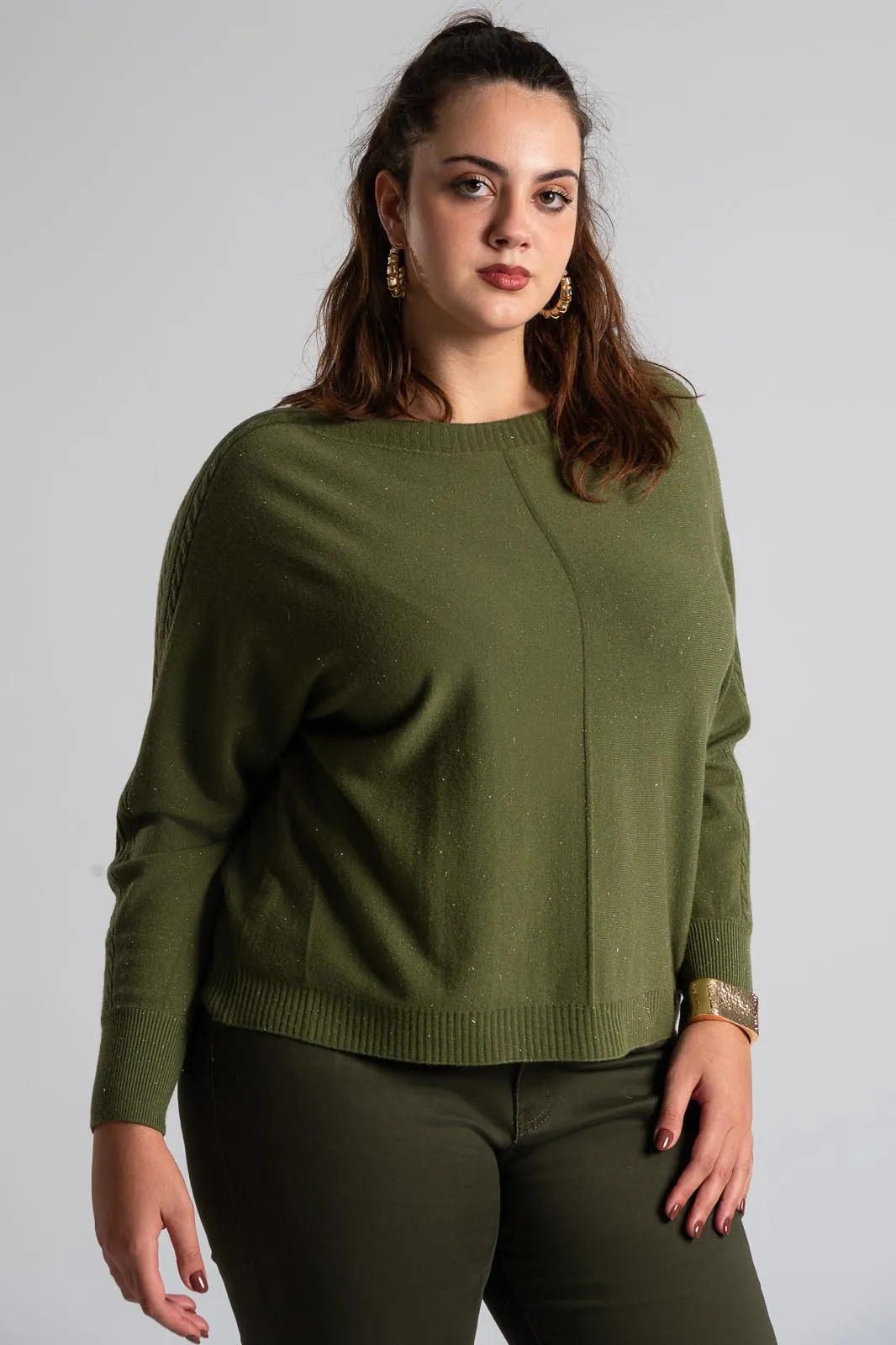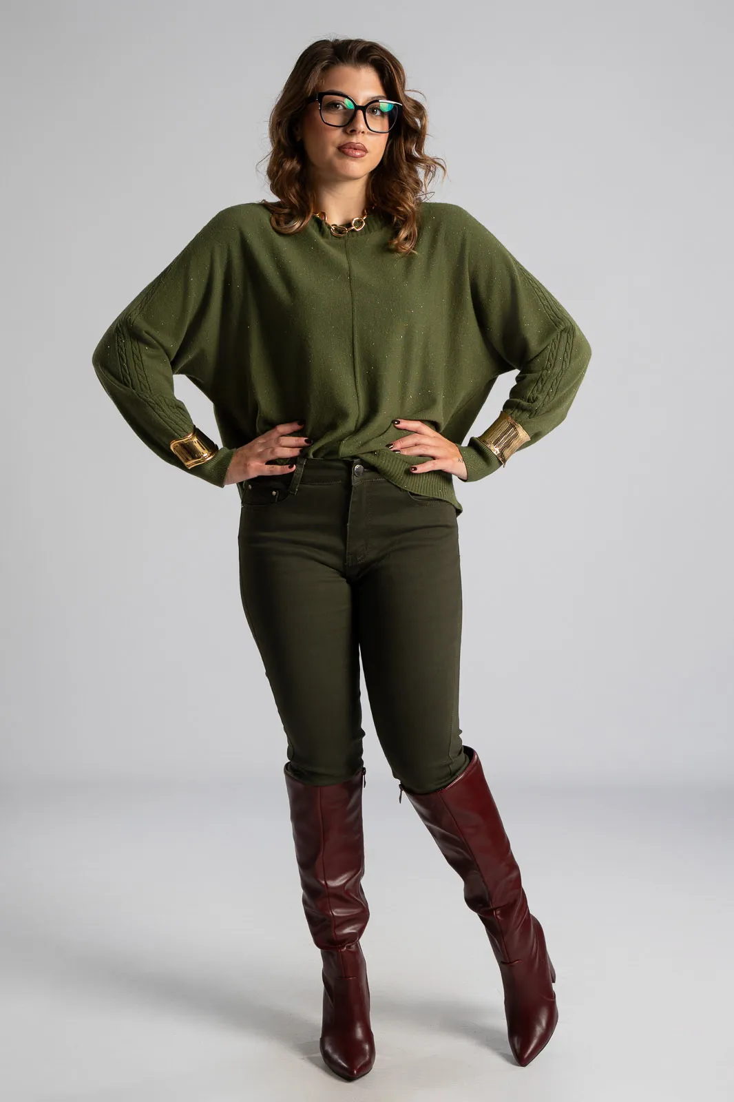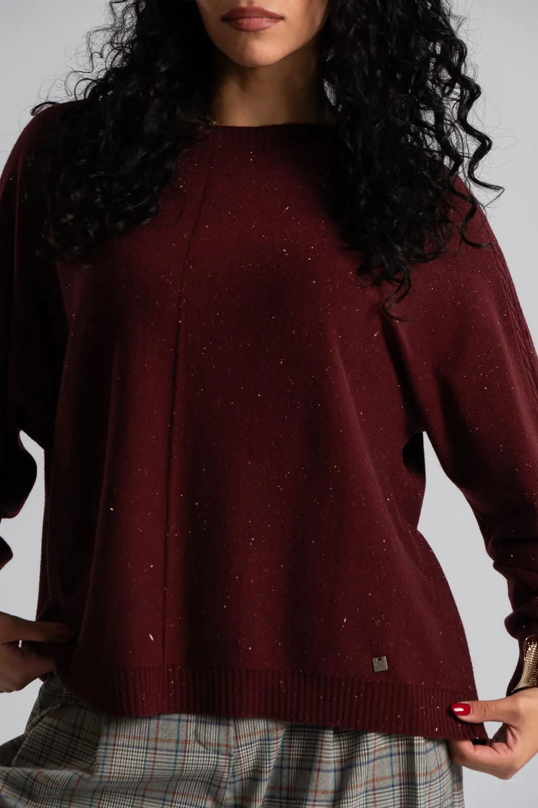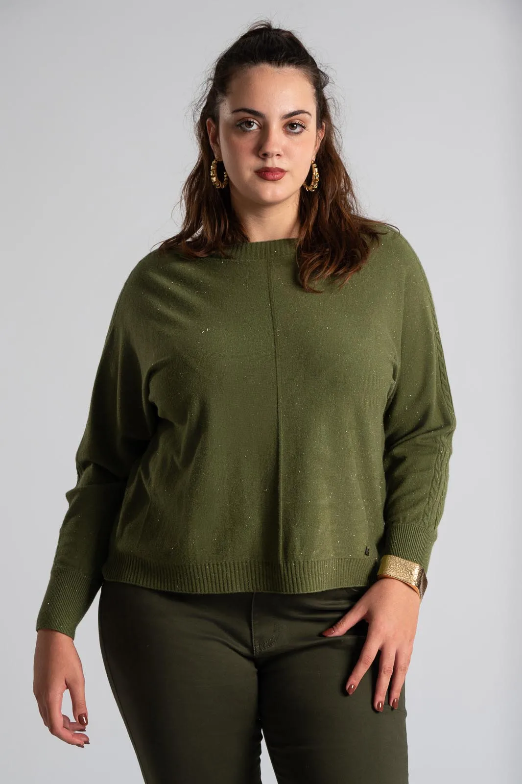 Μπλούζα νημάτινη με συμπαγή πλέξη. Διαθέτει στρογγυλή λαιμόκοψη. Έχει μακριά μανίκια με ανάγλυφη πλέξη. Σε όλη την επιφάνεια έχει διακριτική λάμψη μεταλλιζέ στην ίδια απόχρωση και υφή. Στο μπροστινό μέρος έχει μικρό διακοσμητικό μεταλλικό στοιχείο. Οι μετρήσεις του πίνακα είναι αντιπροσωπευτικές για κάθε προϊόν. 30% polyamide,30% viscose, 20% modal, 20% elastan.