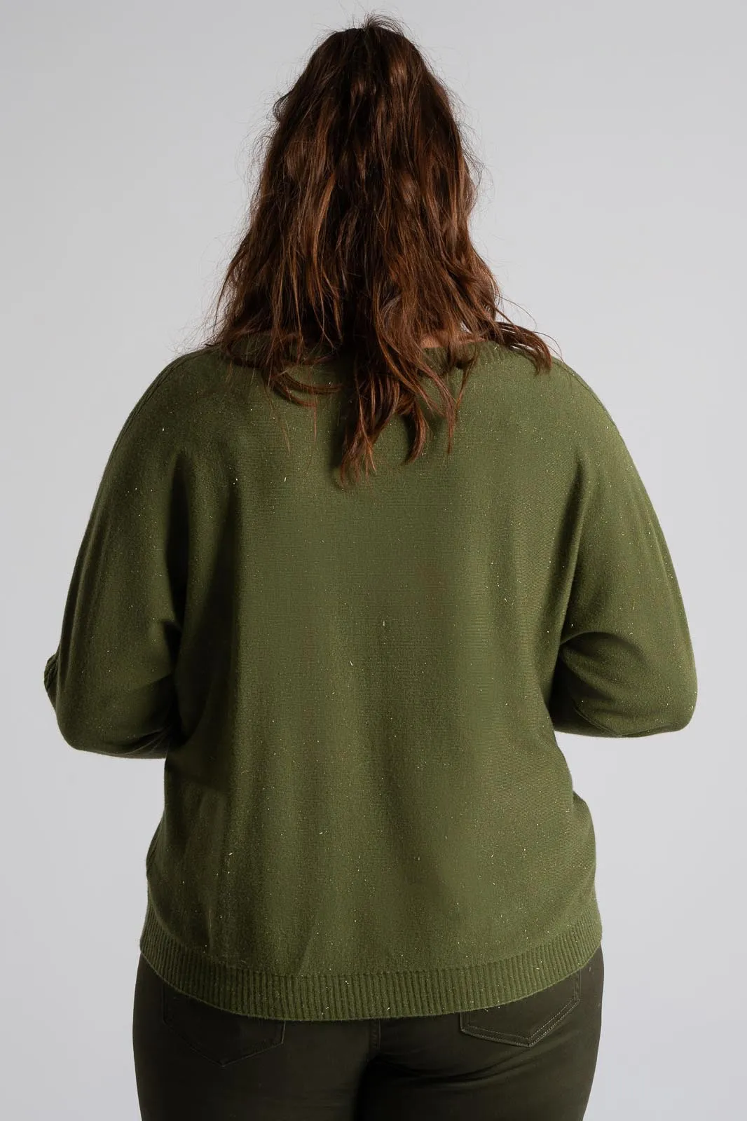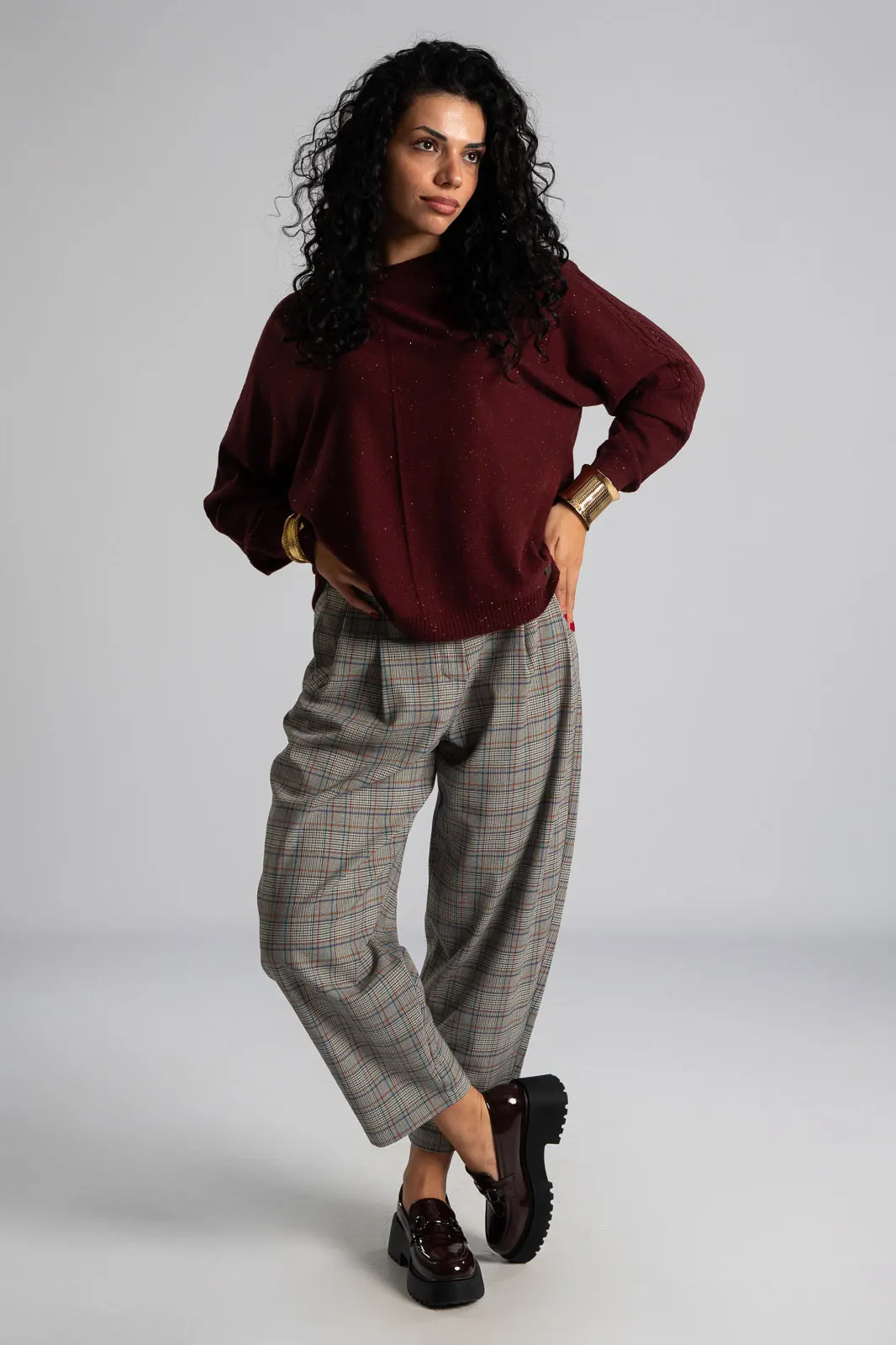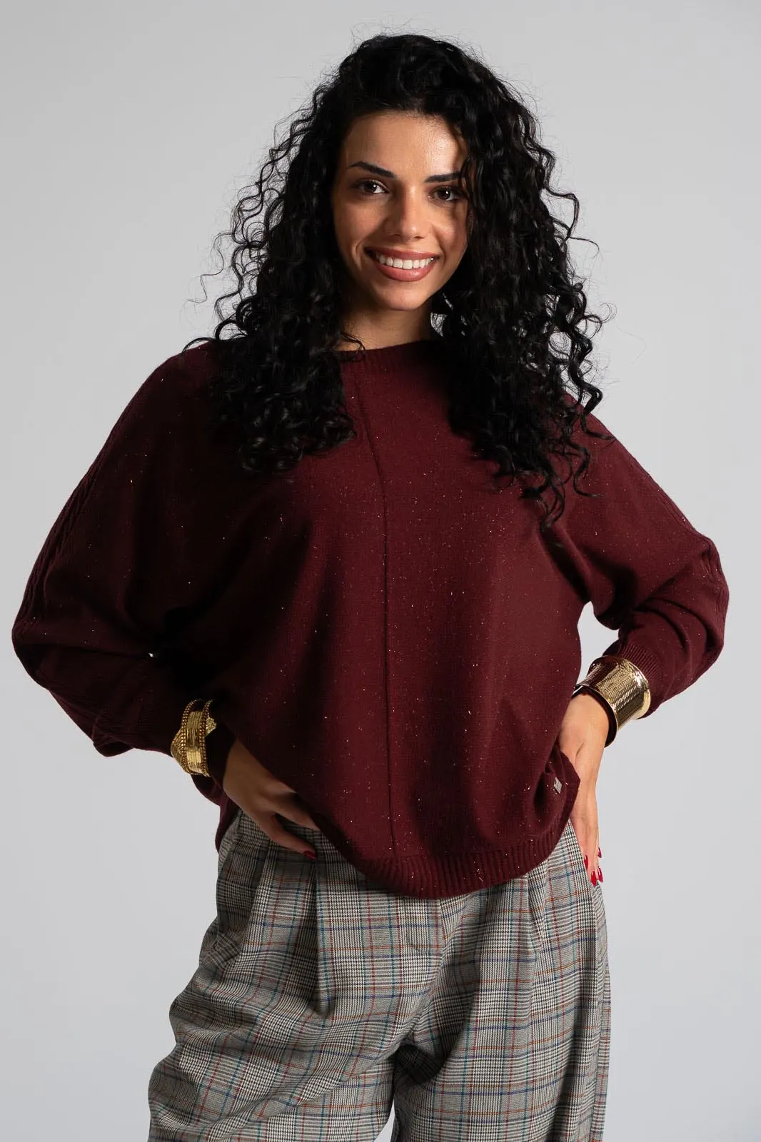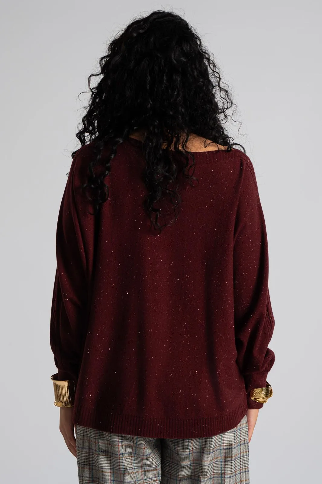 Μπλούζα νημάτινη με συμπαγή πλέξη. Διαθέτει στρογγυλή λαιμόκοψη. Έχει μακριά μανίκια με ανάγλυφη πλέξη. Σε όλη την επιφάνεια έχει διακριτική λάμψη μεταλλιζέ στην ίδια απόχρωση και υφή. Στο μπροστινό μέρος έχει μικρό διακοσμητικό μεταλλικό στοιχείο. Οι μετρήσεις του πίνακα είναι αντιπροσωπευτικές για κάθε προϊόν. 30% polyamide,30% viscose, 20% modal, 20% elastan.