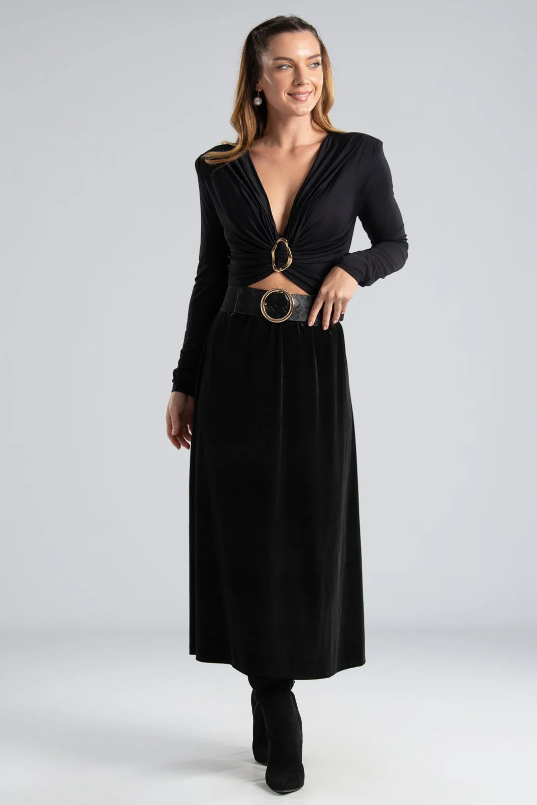 Blouse with a large V-neck and decorative metal clasp. It has long sleeves and shoulder pads. It has a swimsuit texture. The measurements in the table are representative of each product. 90% nylon, 10% elastane.