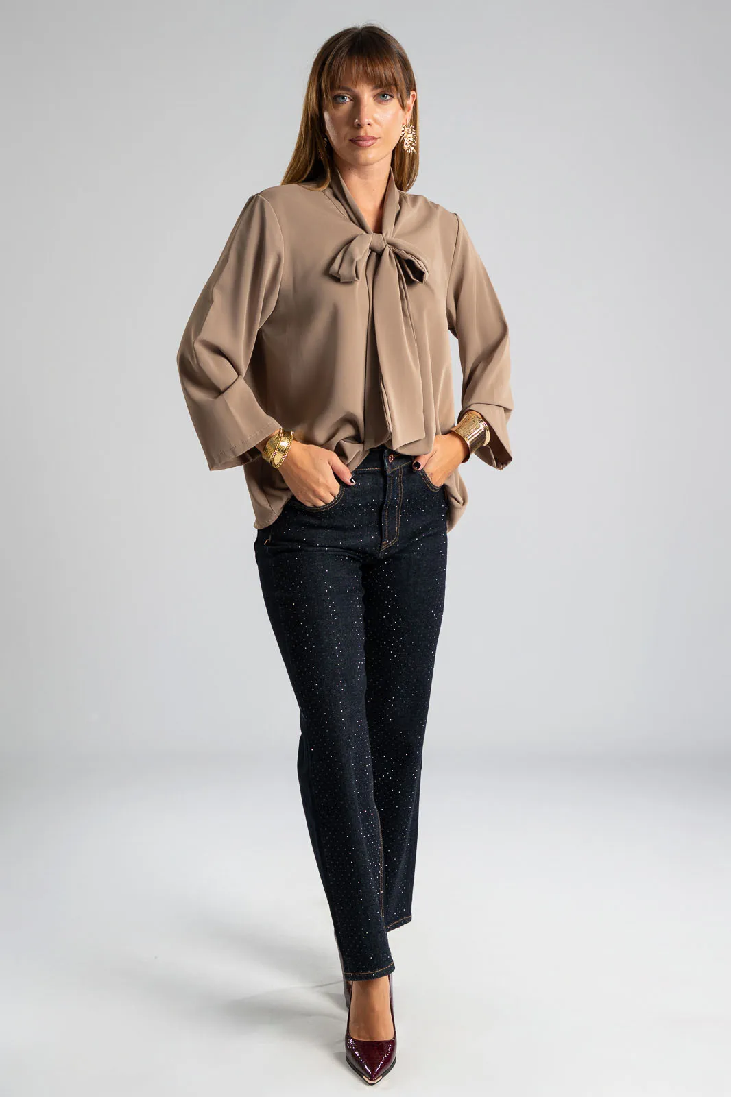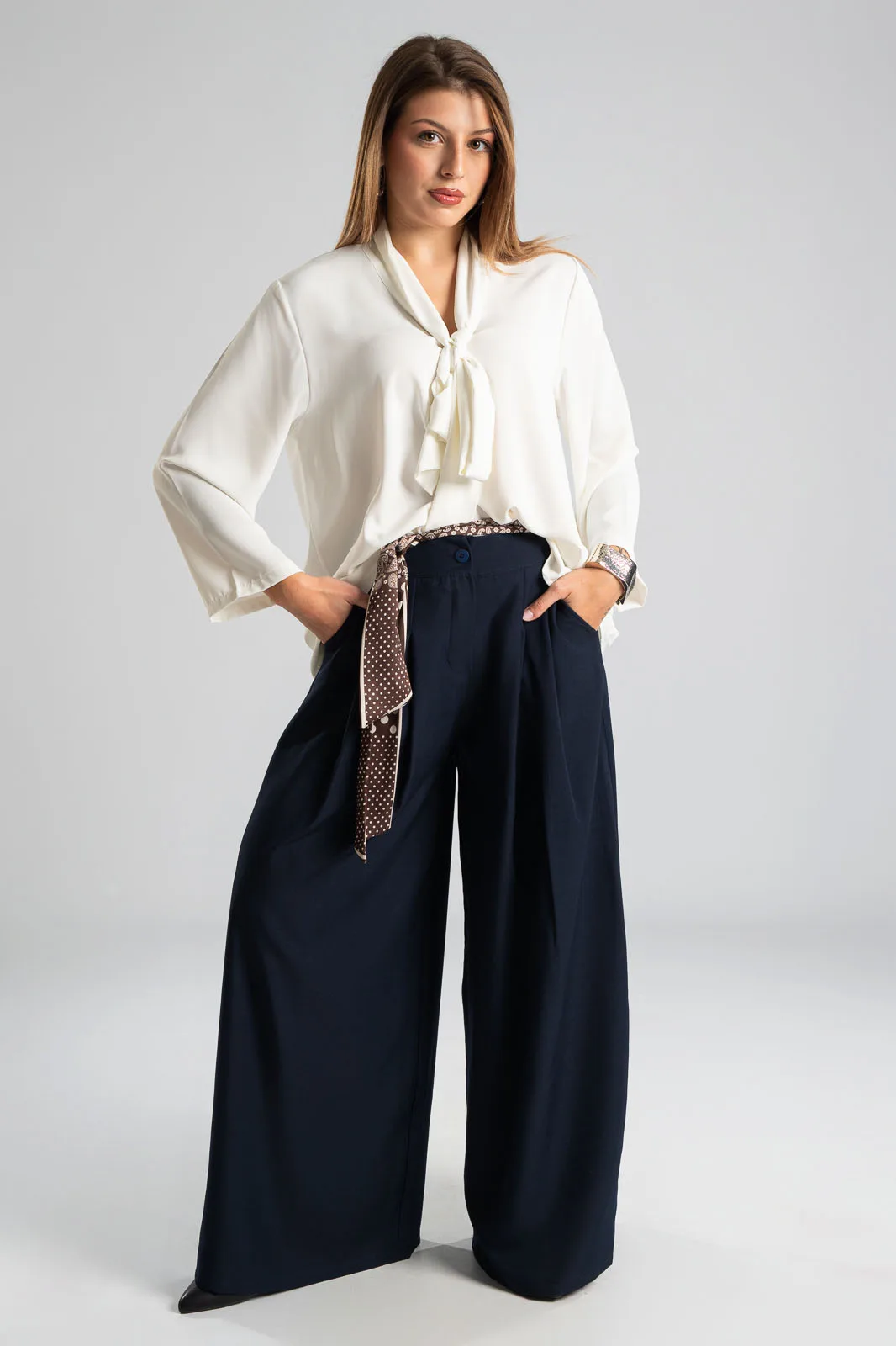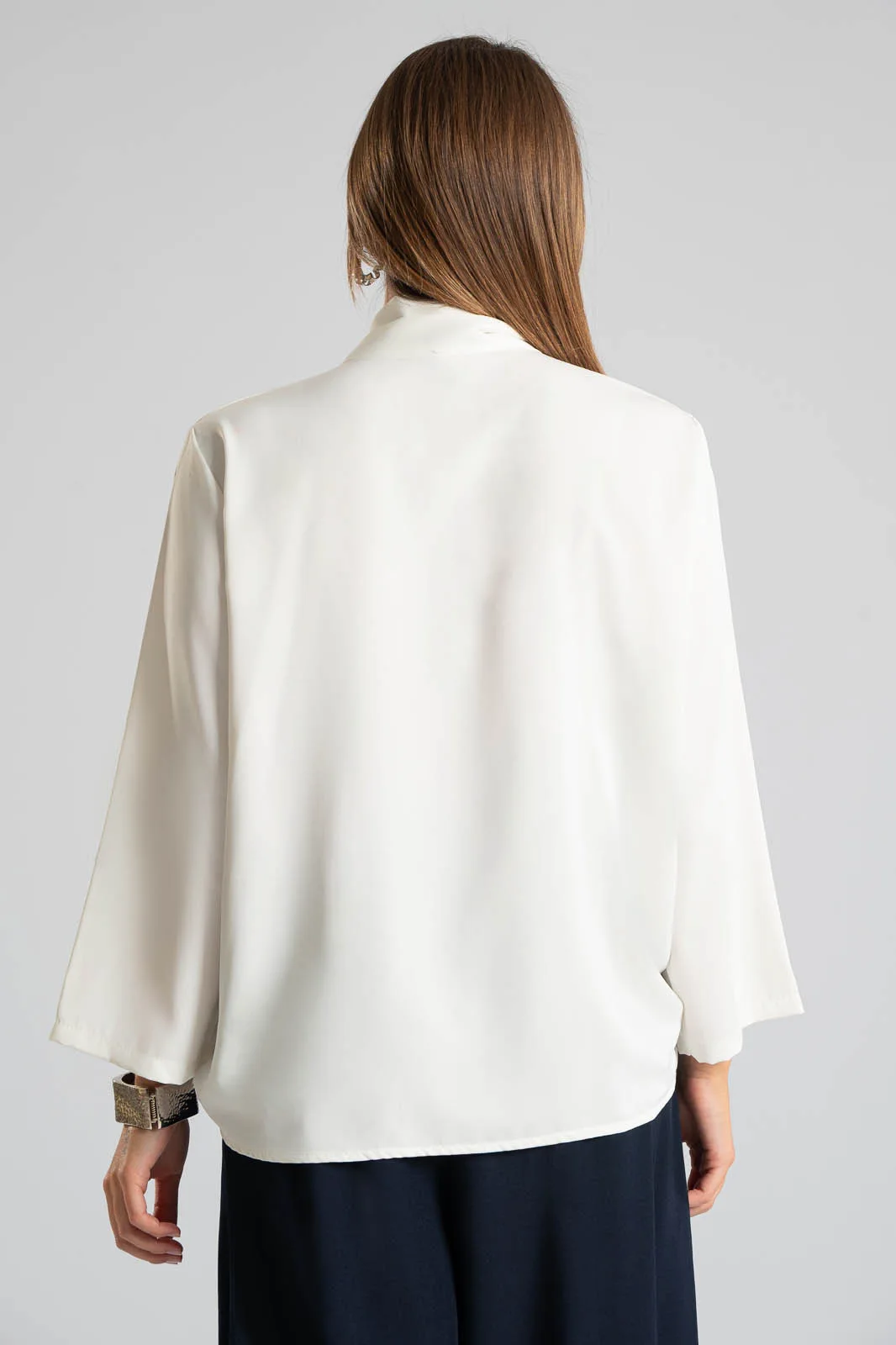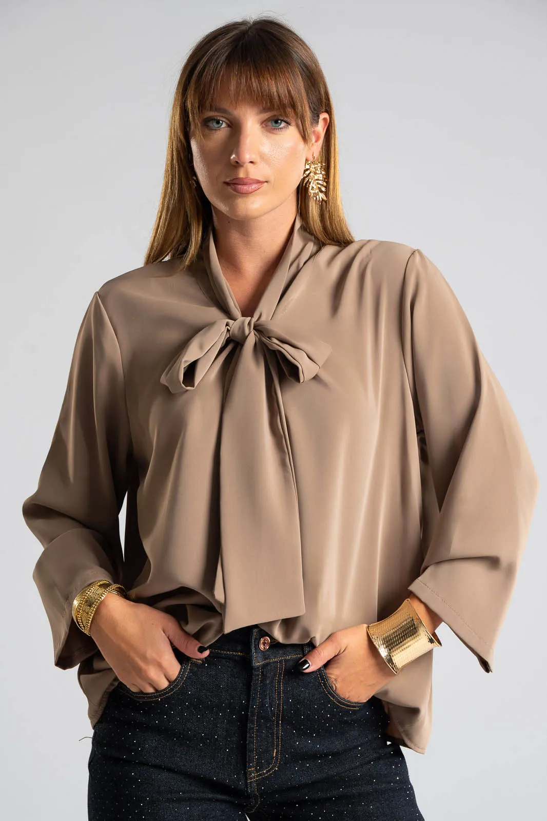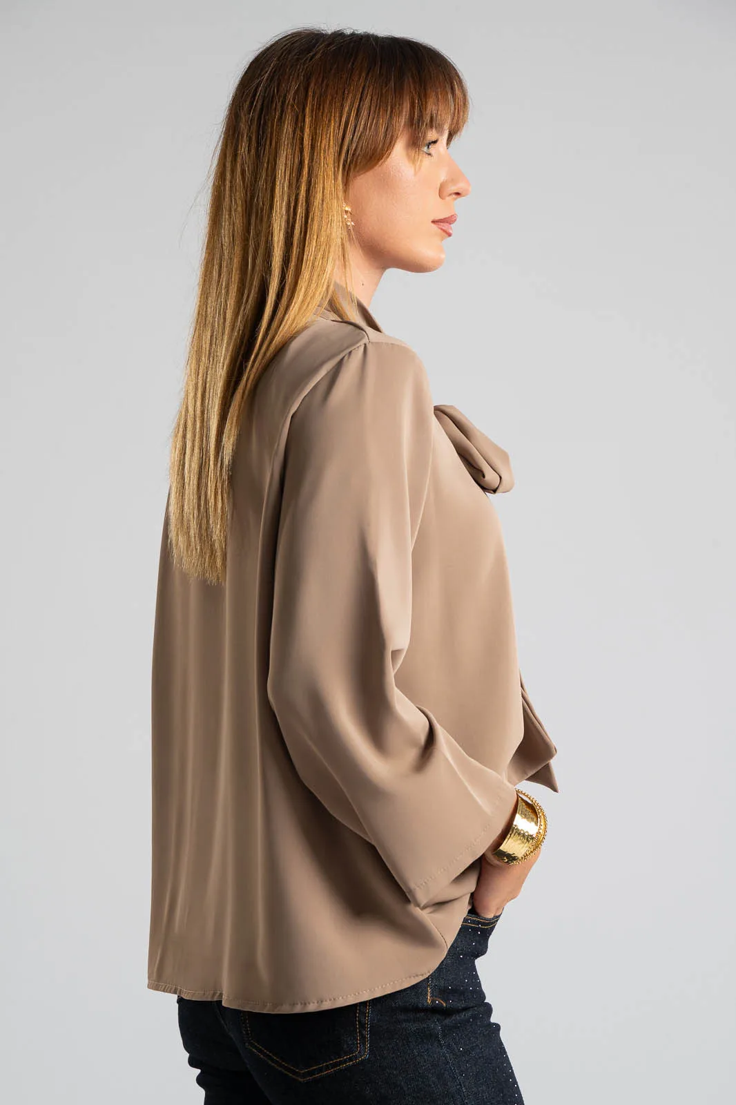 Μπλούζα με γιακά και άνοιγμα στη λαιμόκοψη που δένει. Έχει μακριά μανίκια. Διαθέτει απαλή υφή και είναι άνετη. Οι μετρήσεις του πίνακα είναι αντιπροσωπευτικές για κάθε κωδικό. 100% polyester.