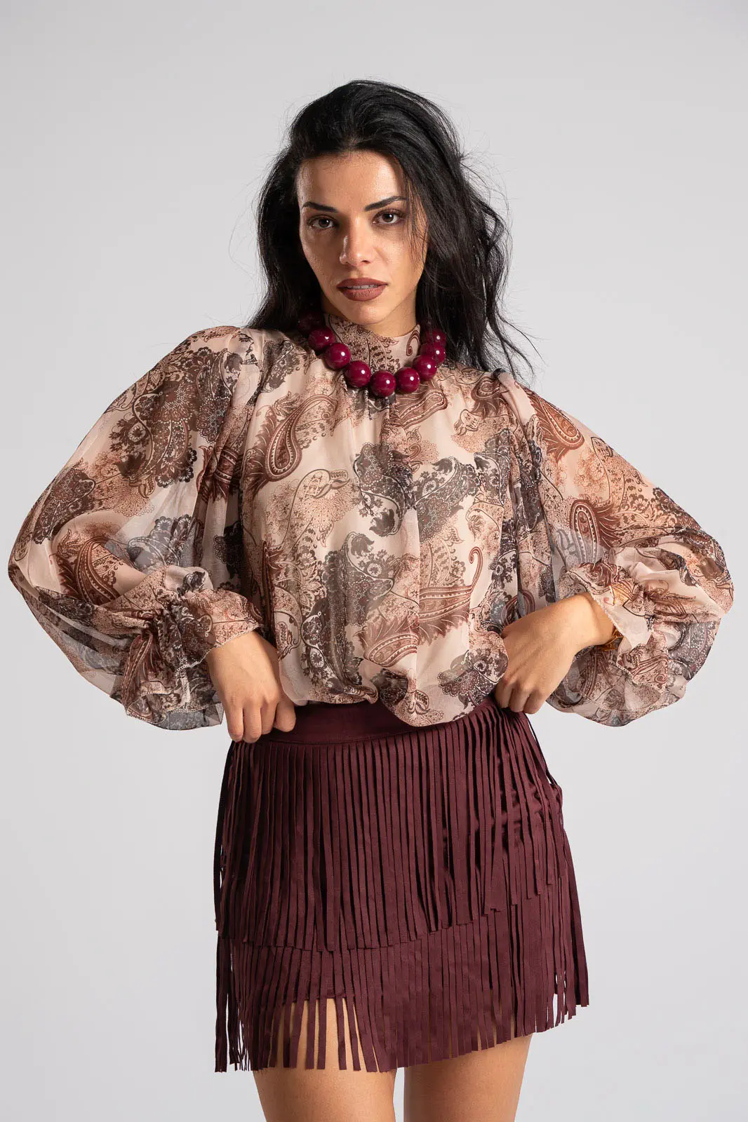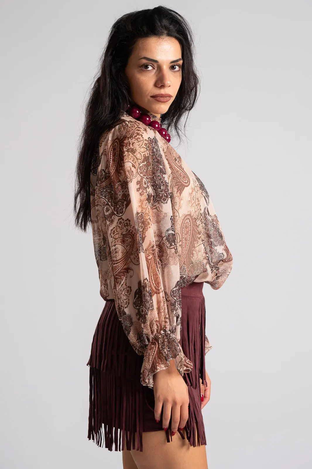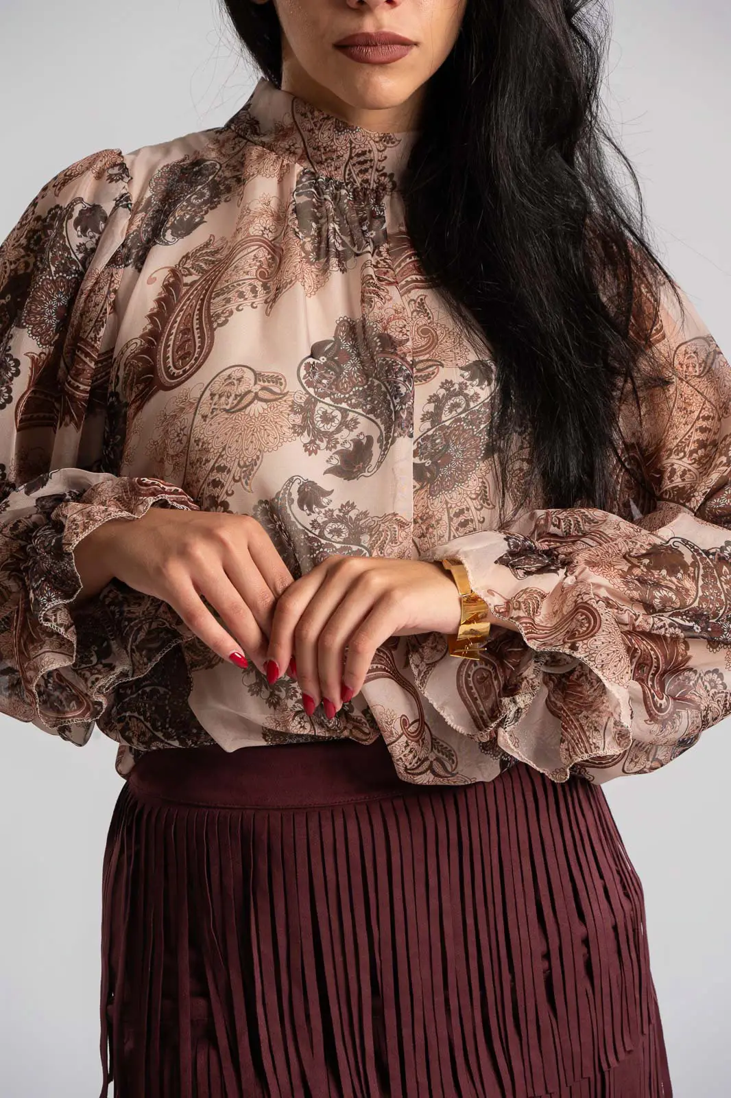 Μπλούζα με lupeto λαιμόκοψη όπου στο πίσω μέρος έχει άνοιγμα και κλείνει με κουμπιά. Έχει μακριά μανίκια που καταλήγουν σε λάστιχο με βολάν. Σε όλη την επιφάνεια έχει διαφάνεια και εσωτερικά είναι φοδραρισμένα. Οι μετρήσεις του πίνακα είναι αντιπροσωπευτικές για κάθε κωδικό. 95% polyester, 5% elastan. 100% viscose (φόδρα).