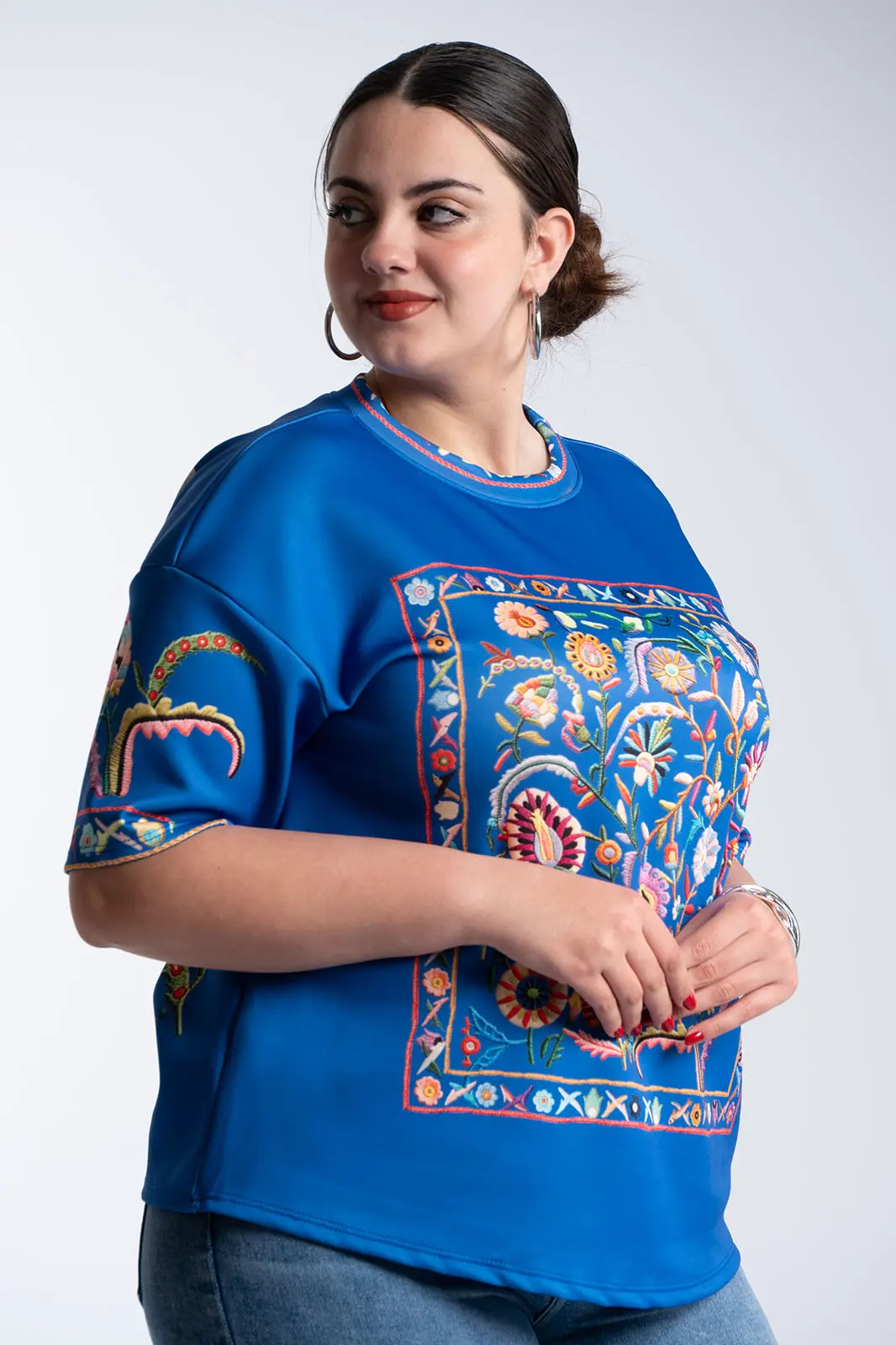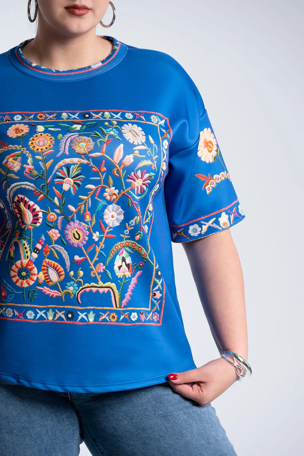 A distinctive blouse that combines artistic flair with comfort and contemporary style. The striking multicolored embroidery across the entire surface creates a unique look, rich in detail and character. Its relaxed fit offers a comfortable feel, while the round neckline maintains a minimalist and balanced look.