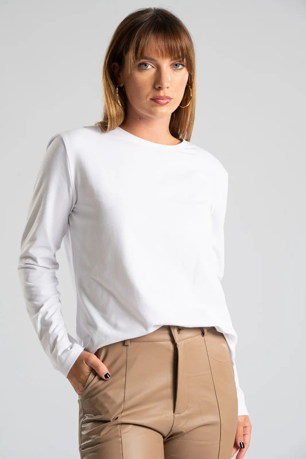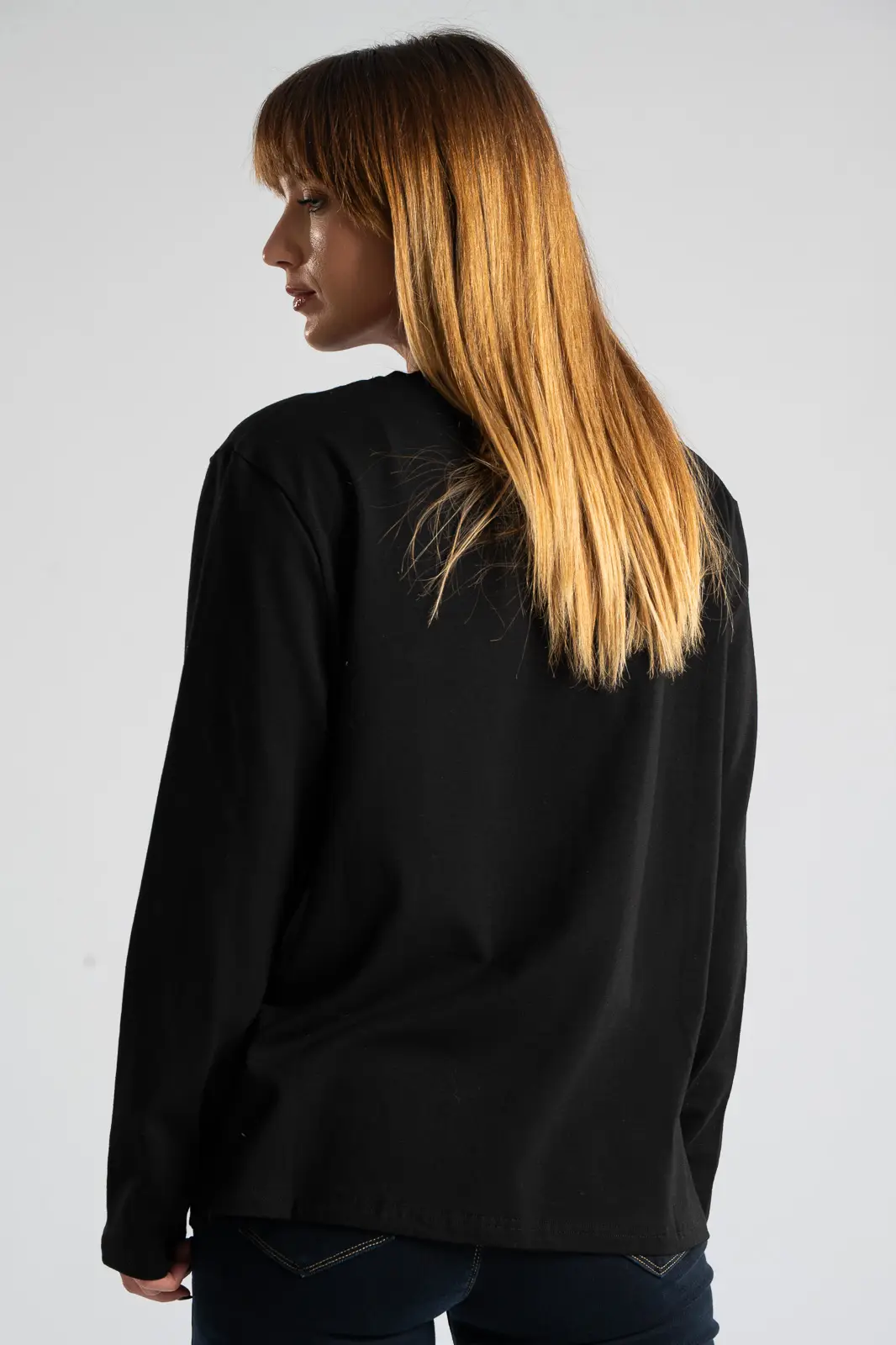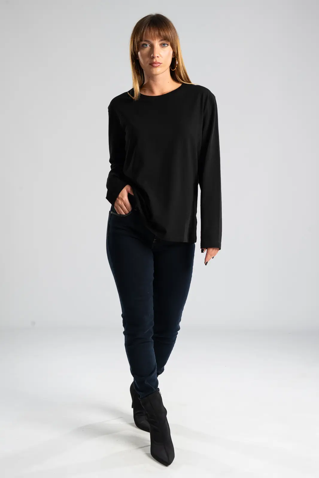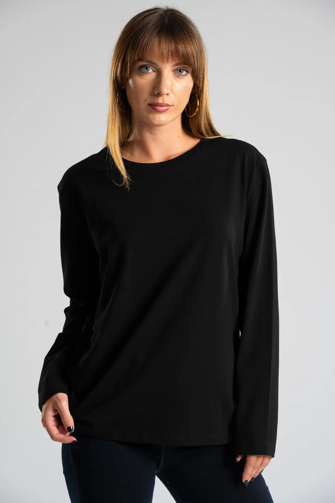 Μπλούζα με στρογγυλή λαιμόκοψη. Διαθέτει μακριά μανίκια και είναι σε ίσια γραμμή. Το ύφασμα της είναι πολύ μαλακό. Μπορεί να φορεθεί από το πρωί μέχρι το βράδυ. Οι μετρήσεις του πίνακα είναι αντιπροσωπευτικές για κάθε κωδικό. 57% cotton, 37% polyester, 6% elastan.