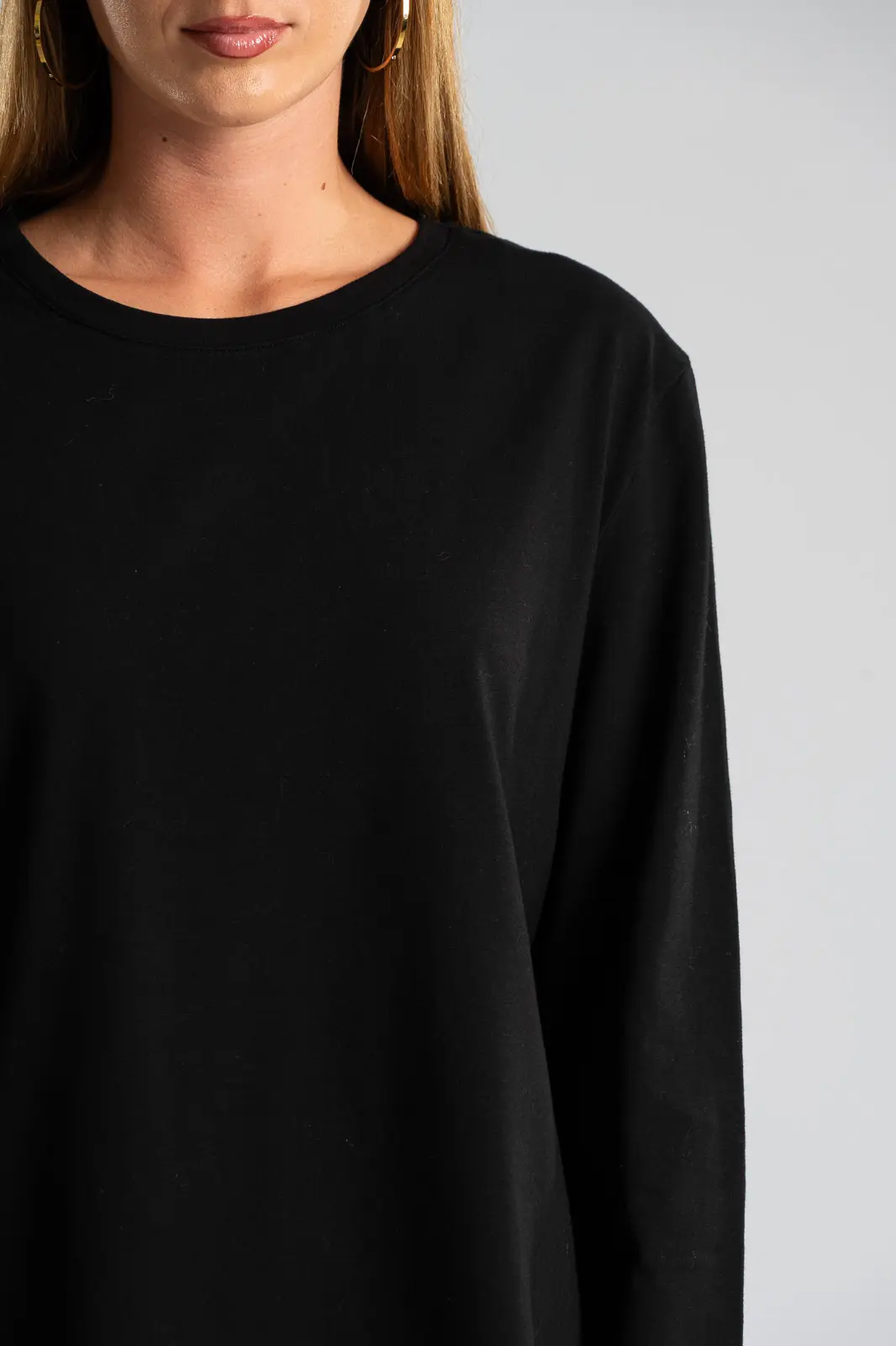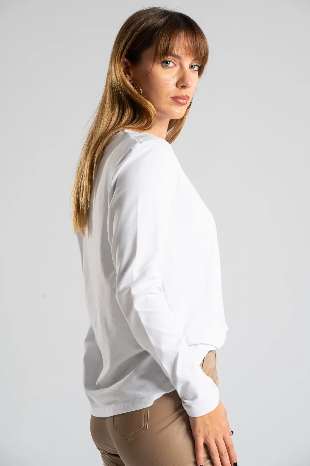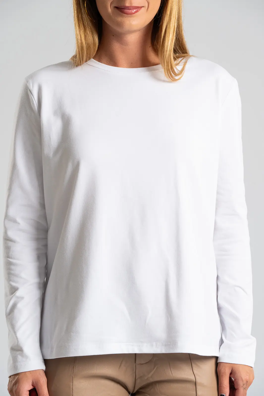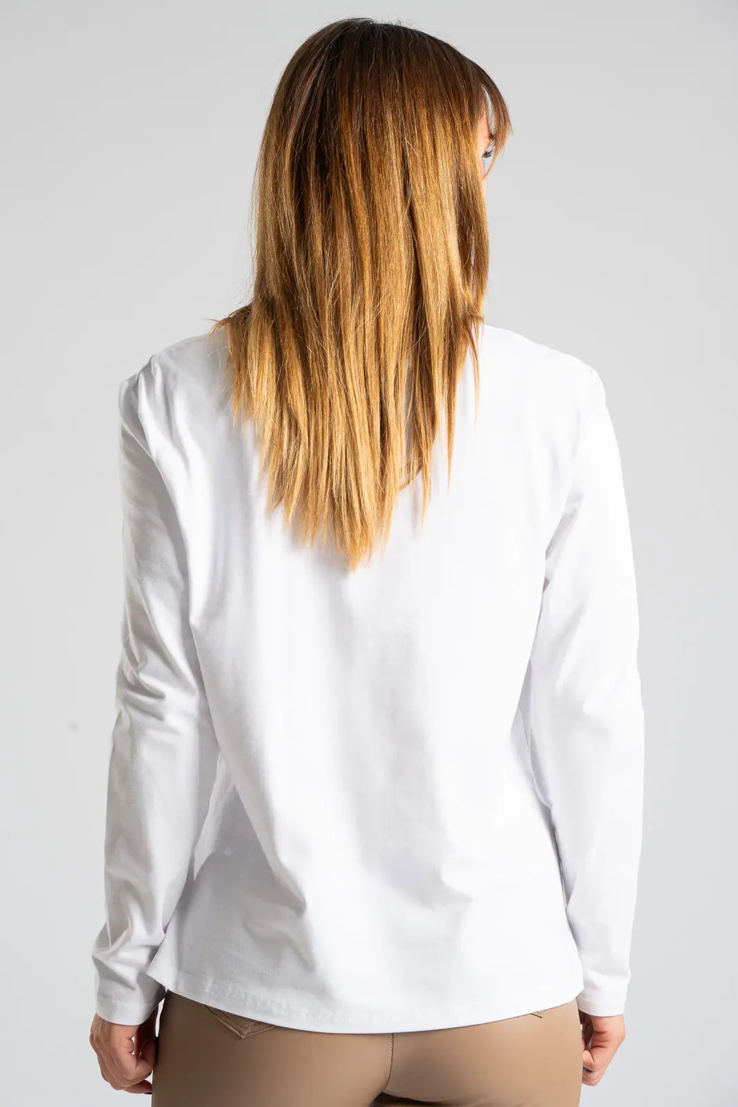 Μπλούζα με στρογγυλή λαιμόκοψη. Διαθέτει μακριά μανίκια και είναι σε ίσια γραμμή. Το ύφασμα της είναι πολύ μαλακό. Μπορεί να φορεθεί από το πρωί μέχρι το βράδυ. Οι μετρήσεις του πίνακα είναι αντιπροσωπευτικές για κάθε κωδικό. 57% cotton, 37% polyester, 6% elastan.