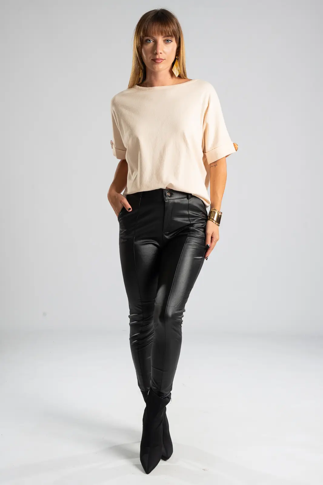 Blouse with thread knit, with round neckline. It has short sleeves that end in cuffs. It has a decorative button. The measurements in the table are representative for each code. 50% viscose, 28% polyester, 22% nylon.