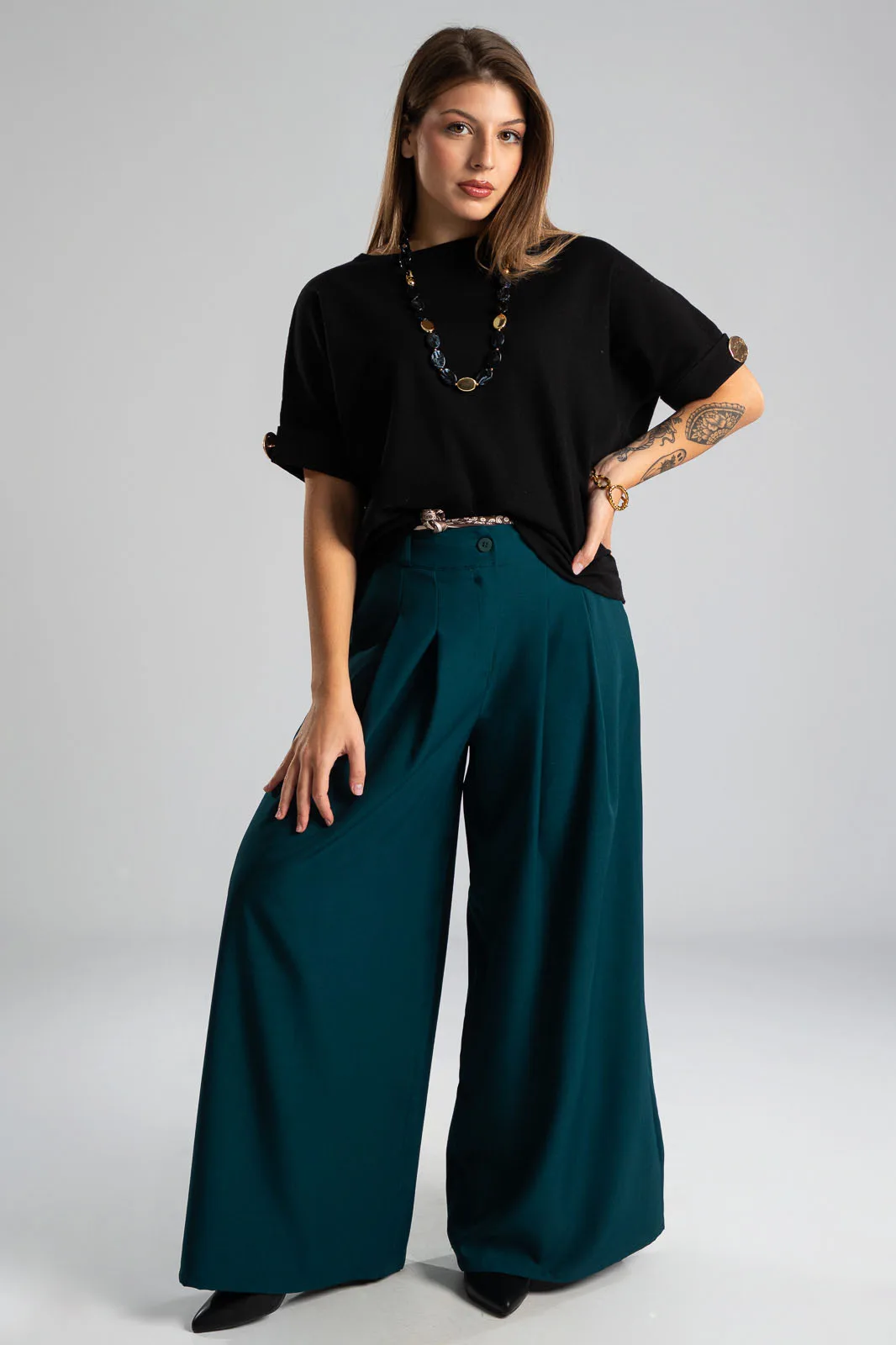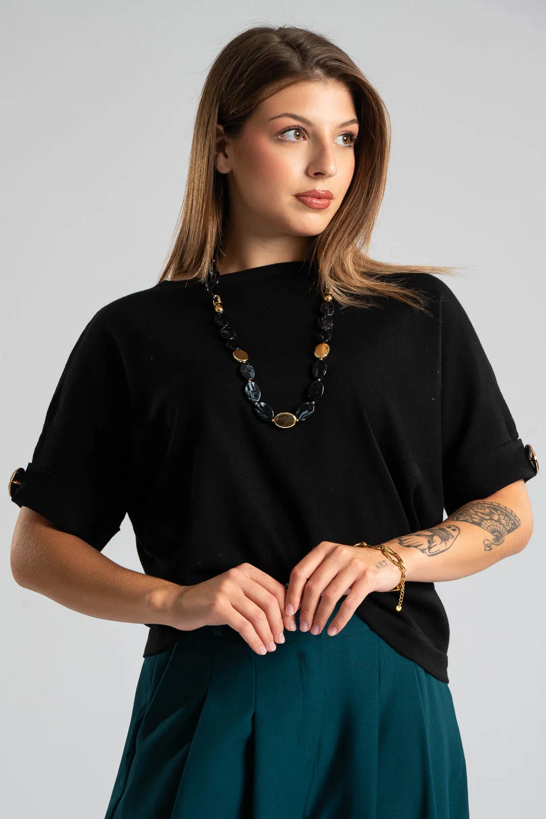 Blouse with thread knit, with round neckline. It has short sleeves that end in cuffs. It has a decorative button. The measurements in the table are representative for each code. 50% viscose, 28% polyester, 22% nylon.