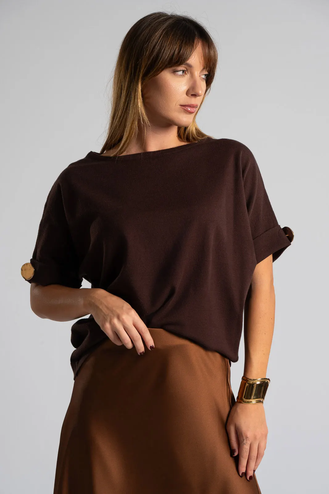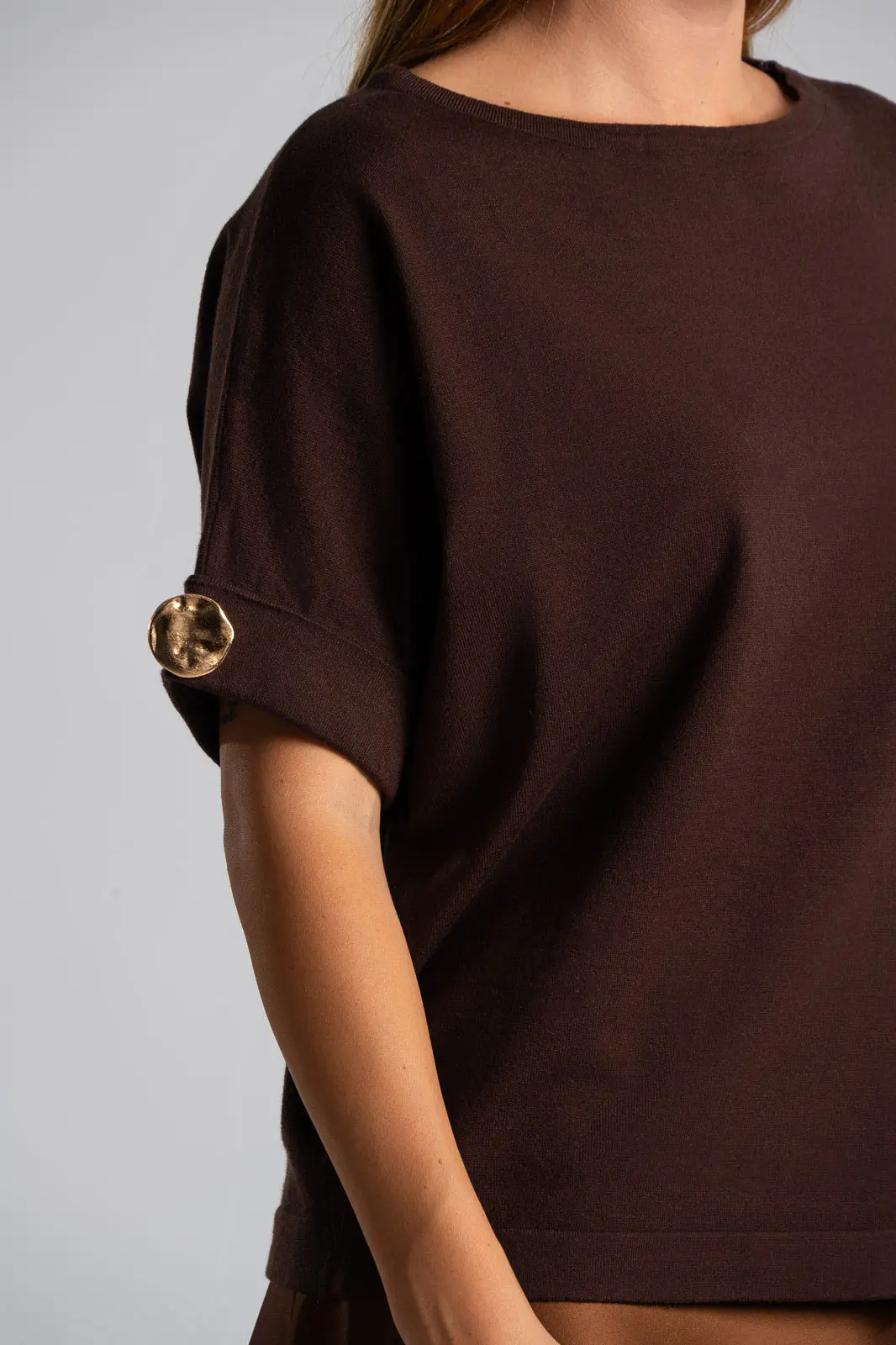 Blouse with thread knit, with round neckline. It has short sleeves that end in cuffs. It has a decorative button. The measurements in the table are representative for each code. 50% viscose, 28% polyester, 22% nylon.