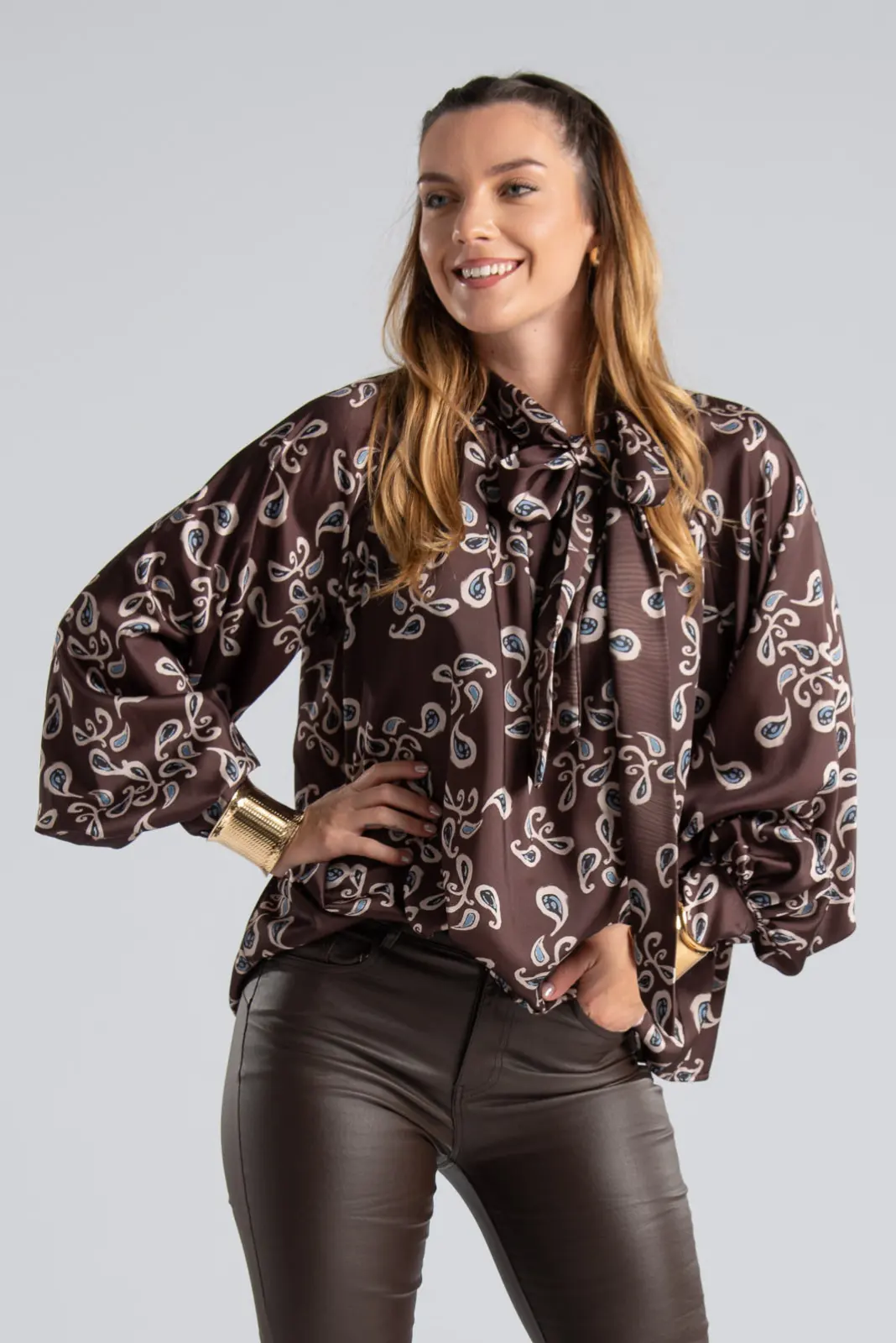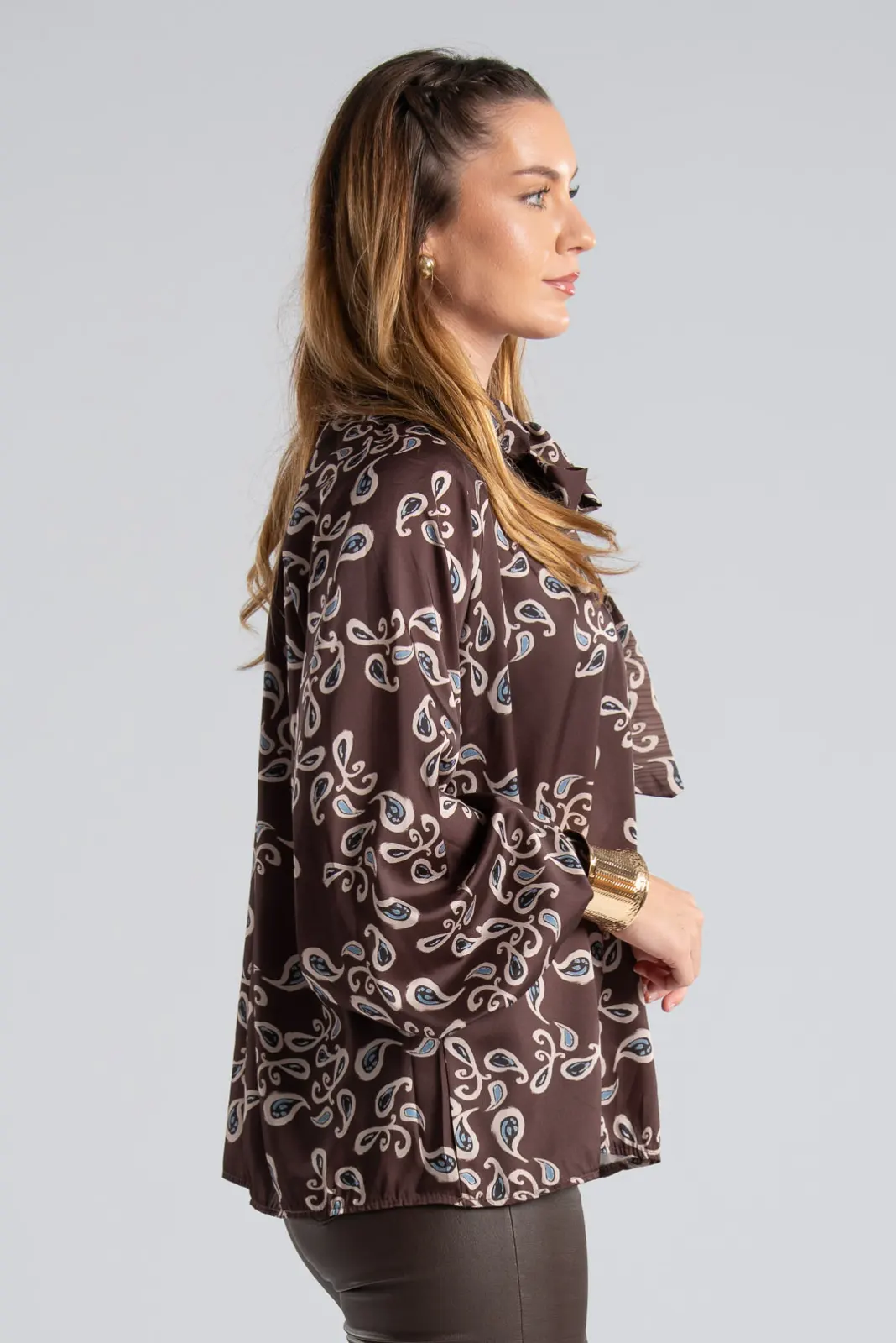 Blouse with a slightly high neckline and a small side opening that closes with a tie. It has a lachour print all over. It has long sleeves and button closures at the cuffs. It has an A-line silhouette. The measurements in the table are representative for each code. 100% polyester.