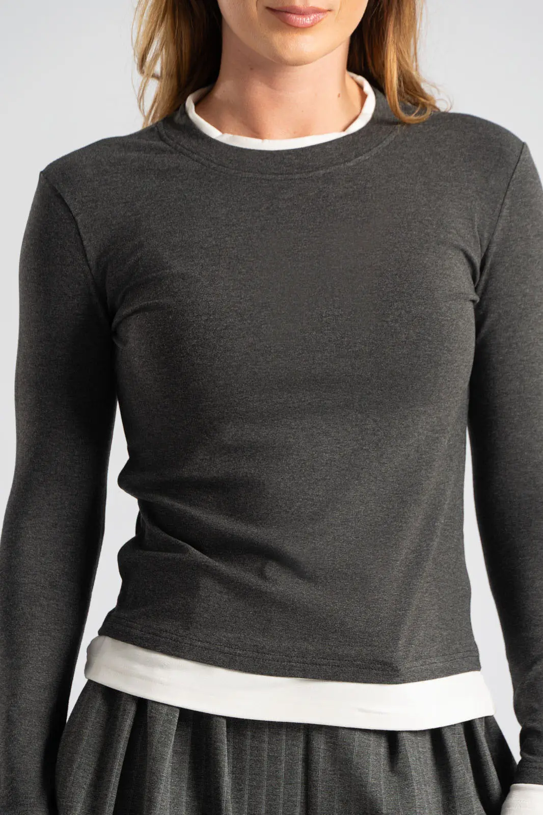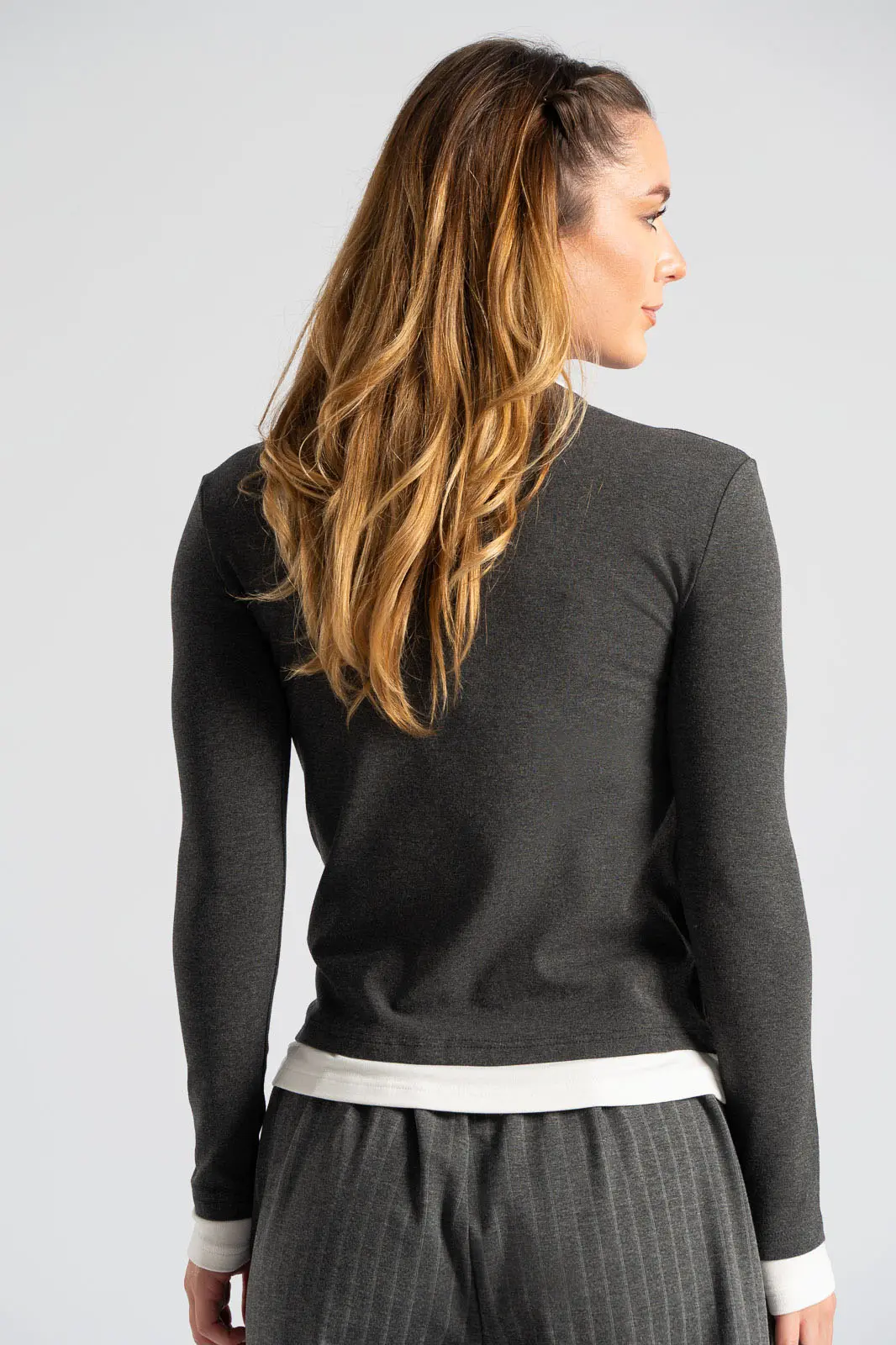 Blouse with a round neckline. It has long sleeves and a straight cut. It features white detailing at the hem, neckline, and cuffs. The fabric is very soft. The measurements in the table are representative for each code. 75% cotton, 20% viscose, 5% elastane.