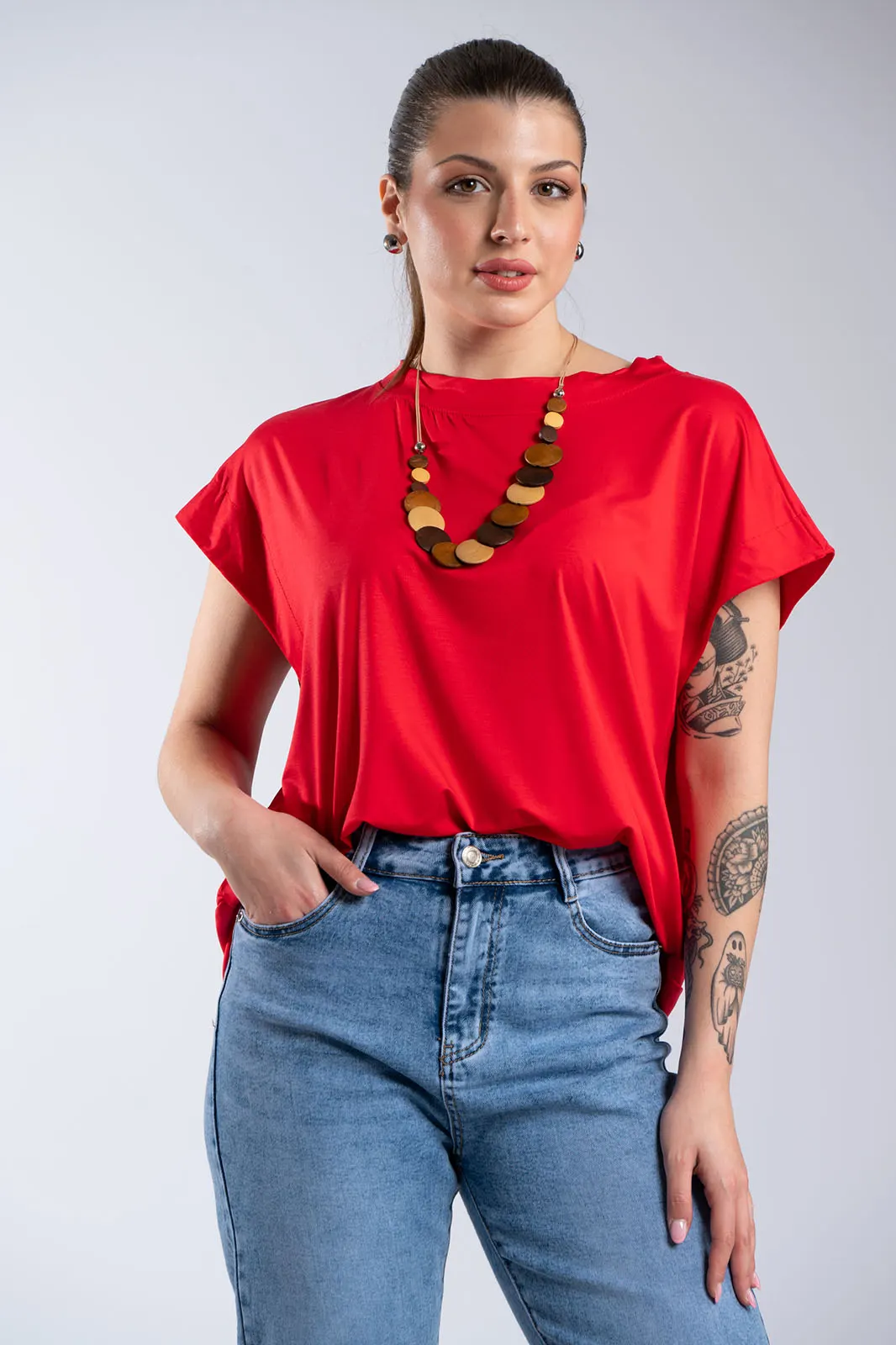 A top with a modern, minimalist aesthetic and clean lines, ideal for elegant yet contemporary looks. It features a round neckline and a slightly loose, boxy silhouette that comfortably hugs the body. The “swimsuit-style” fabric offers a smooth texture, elasticity, and a perfect fit, highlighting the silhouette without being too tight. The bottom features a subtle slit that adds ease of movement and a subtle design detail. A versatile piece that can be worn from morning to night. It comes with its own lace/">necklace