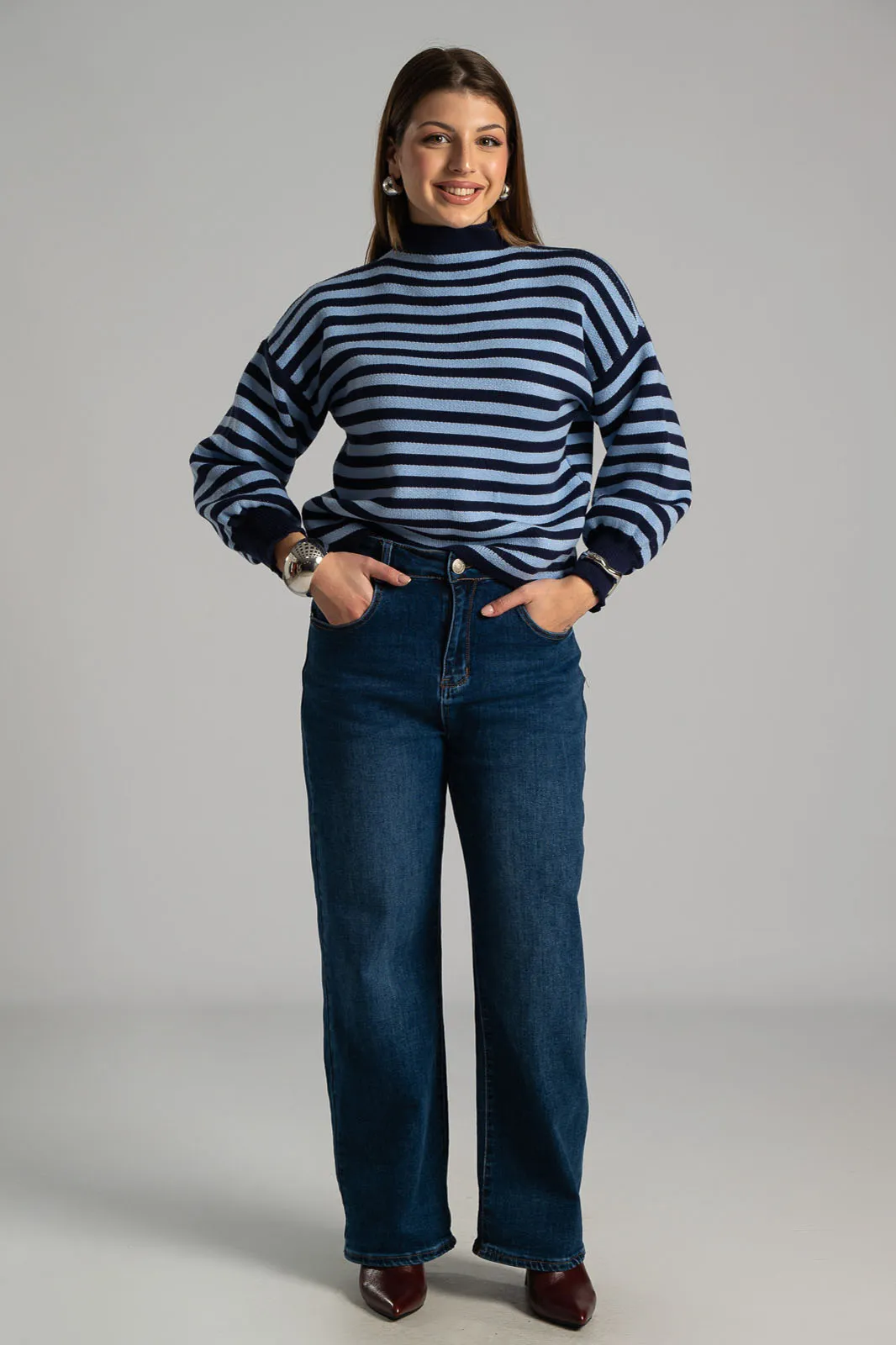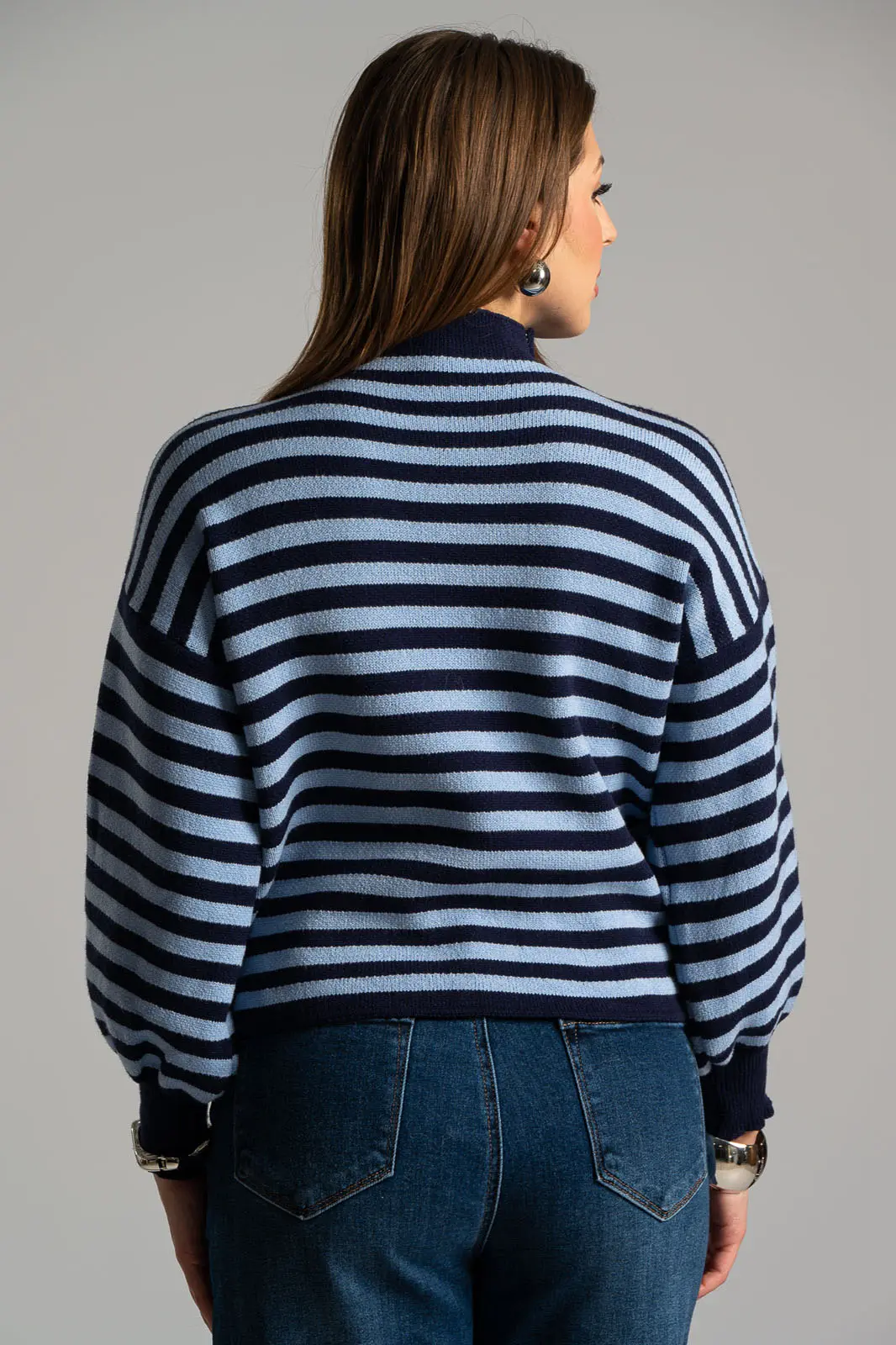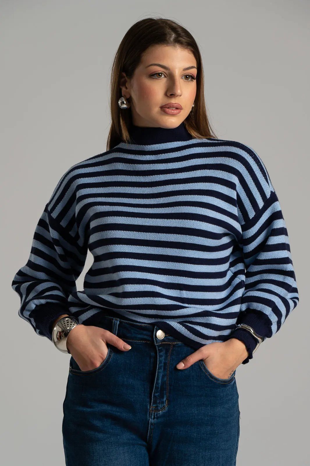 Μπλούζα με lupeto λαιμόκοψη. Διαθέτει μακριά μανίκια τα οποία καταλήγουν σε λάστιχο. Σε όλη την επιφάνεια έχει ρίγες οριζόντιες και είναι πλεκτή. Οι μετρήσεις του πίνακα είναι αντιπροσωπευτικές για κάθε κωδικό. 52% viscose, 26% polyester, 22% nylon.