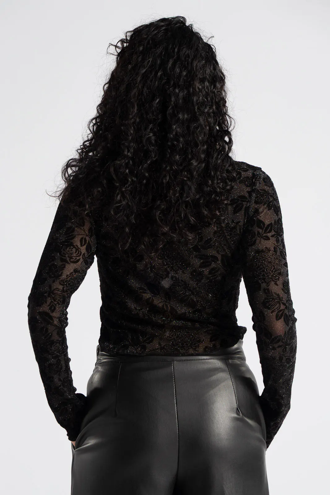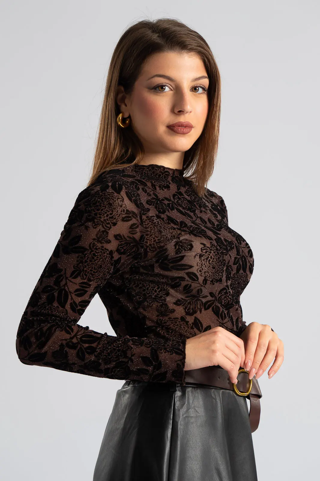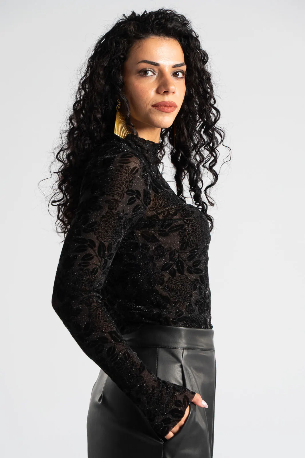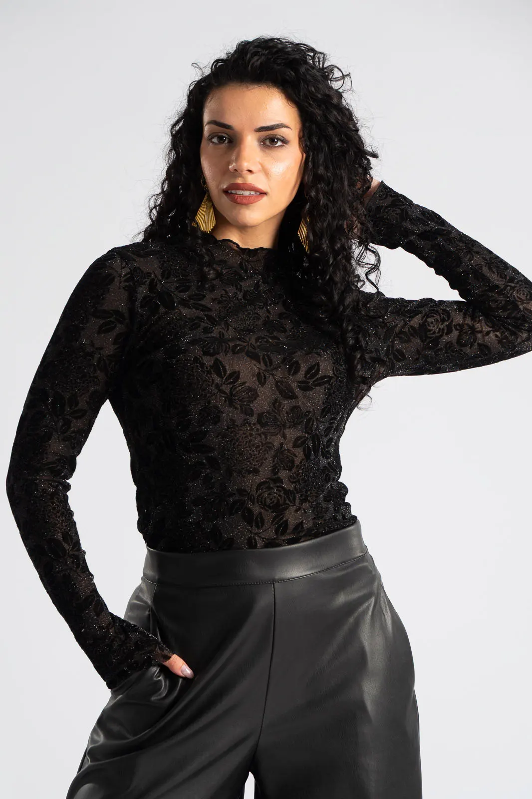 Blouse with lupeto neckline. It has long sleeves. It features a floral pattern and lurex detail across the entire surface. The measurements in the table are representative of each product. 92% nylon, 4% spandex, 4% lurex.