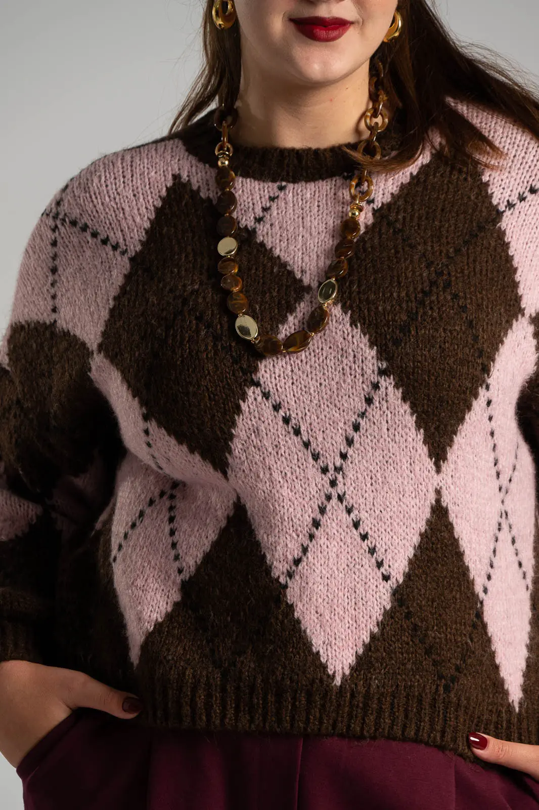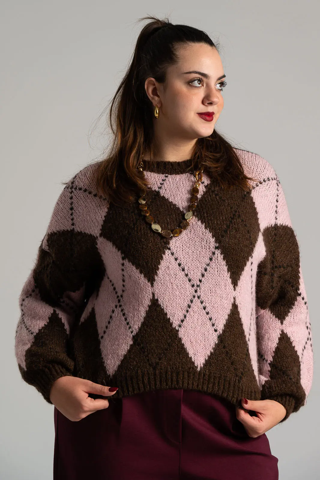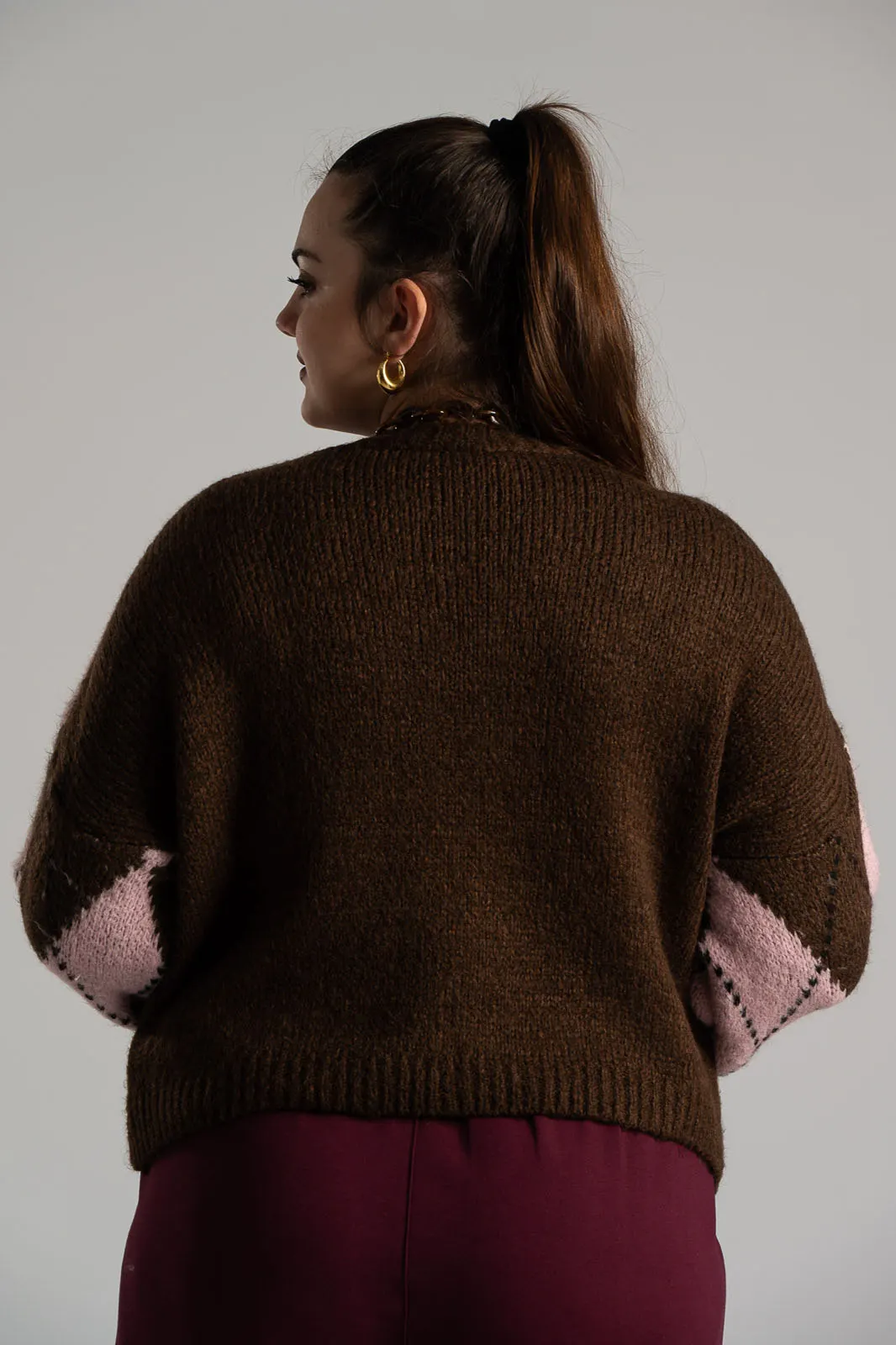 Πουλόβερ με στρογγυλή λαιμόκοψη. Διαθέτει μακριά μανίκια σε ύφος balloon. Είναι πλεκτή σε όλη την επιφάνεια της και έχει καρώ μοτίβο. Οι μετρήσεις του πίνακα είναι αντιπροσωπευτικές για κάθε προϊόν. 65% acrylic, 17% polyamide, 9% wool, 9% viscose.