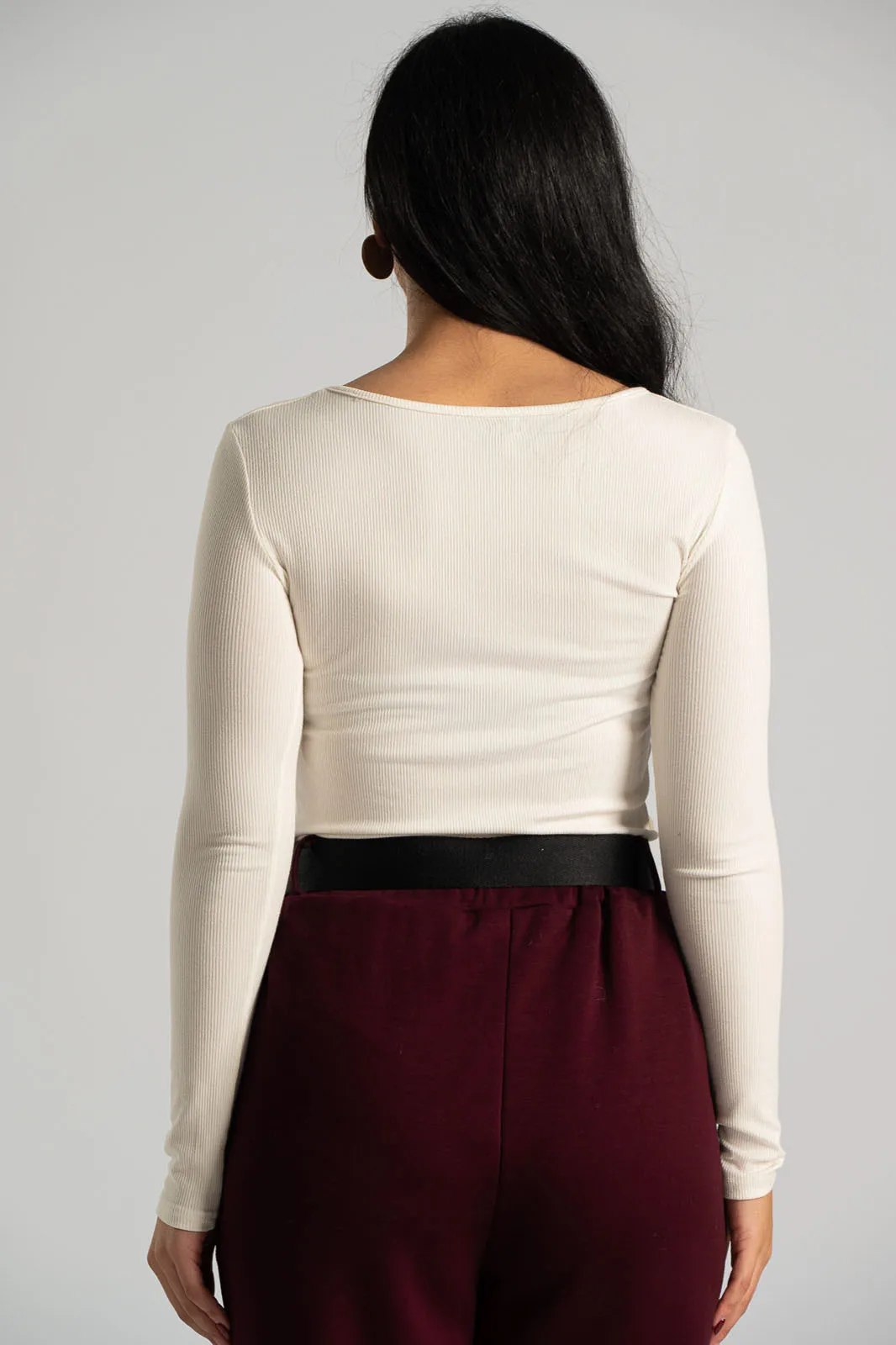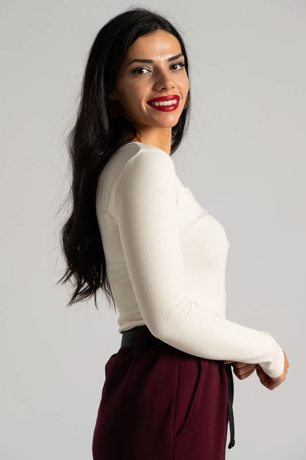 Μπλούζα rib. Έχει στρογγυλή λαιμόκοψη και στο στήθος διαθέτει κουμπιά. Έχει μακριά μανίκια και είναι σε ίσια γραμμή. Το ύφασμα της είναι πολύ μαλακό και έχει μικρή ελαστικότητα. Οι μετρήσεις του πίνακα είναι αντιπροσωπευτικές για κάθε κωδικό. 95%viscose, 5% elestan.