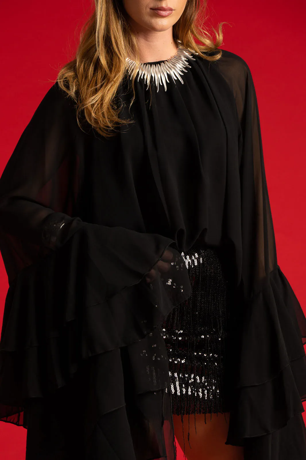 Μπλούζα ελαφρώς c-throu με στρογγυλή λαιμόκοψη. Έχει μακριά μανίκια με έντονη ασυμμετρία και βολάν. Στο τελείωμα των μανικιών έχει άνοιγμα. Εσωτερικά είναι φοδραρισμένη στον κορμό. Είναι μια επιλογή για κάθε περίσταση. Οι μετρήσεις του πίνακα είναι αντιπροσωπευτικές για κάθε κωδικό. 95% polyester, 5%elastan.