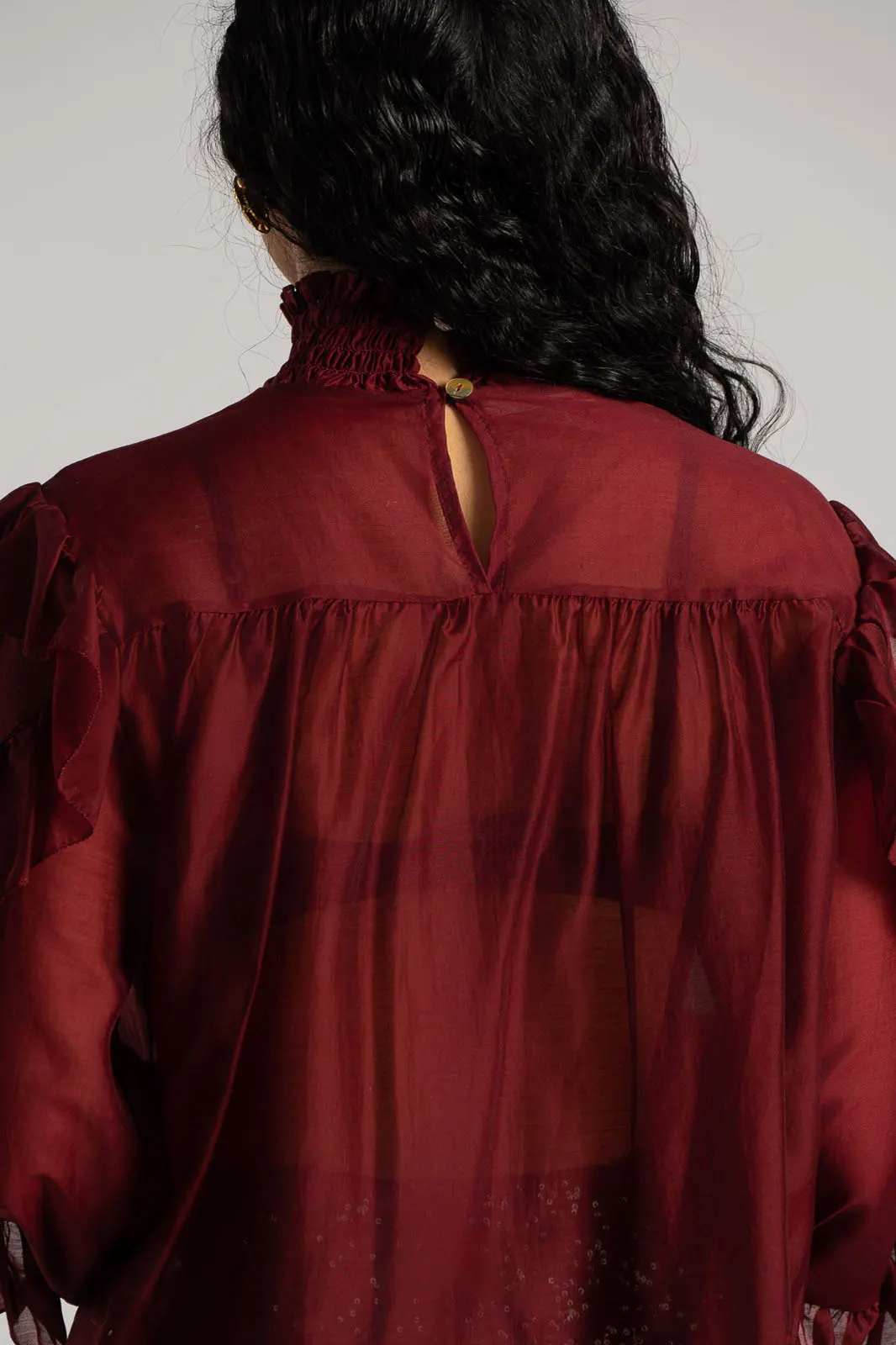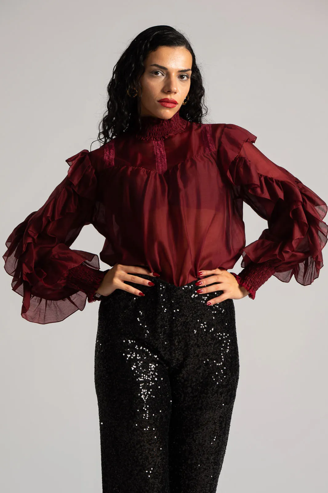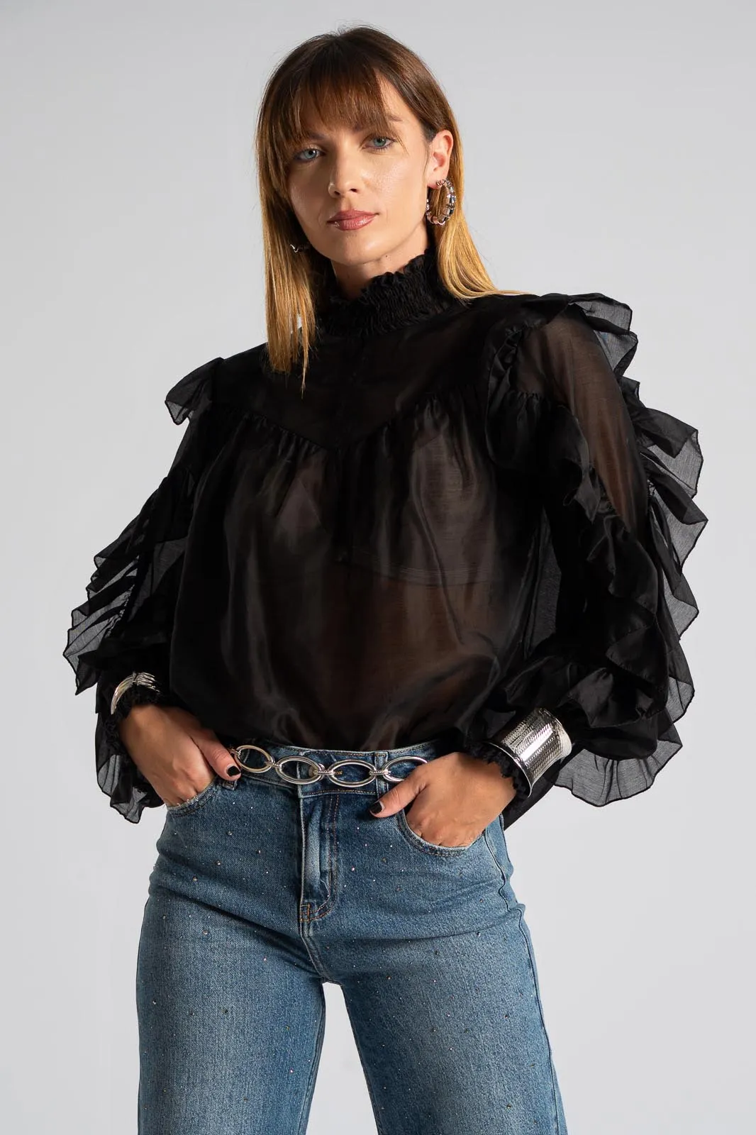 Blouse with a lupeto neckline featuring elastic and ruffles, ending in elastic in a bow tie style. It has long sleeves with decorative ruffles. The front upper part has decorative lace strips. At the back, at the height of the back, it has an opening that closes with a button. It is slightly see-through. It has pleats around the edges. The measurements in the table are representative for each code. 85% lyocell, 15% polyester.