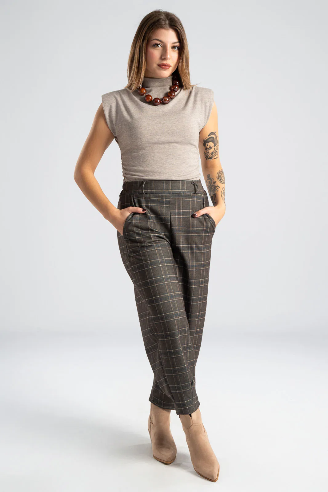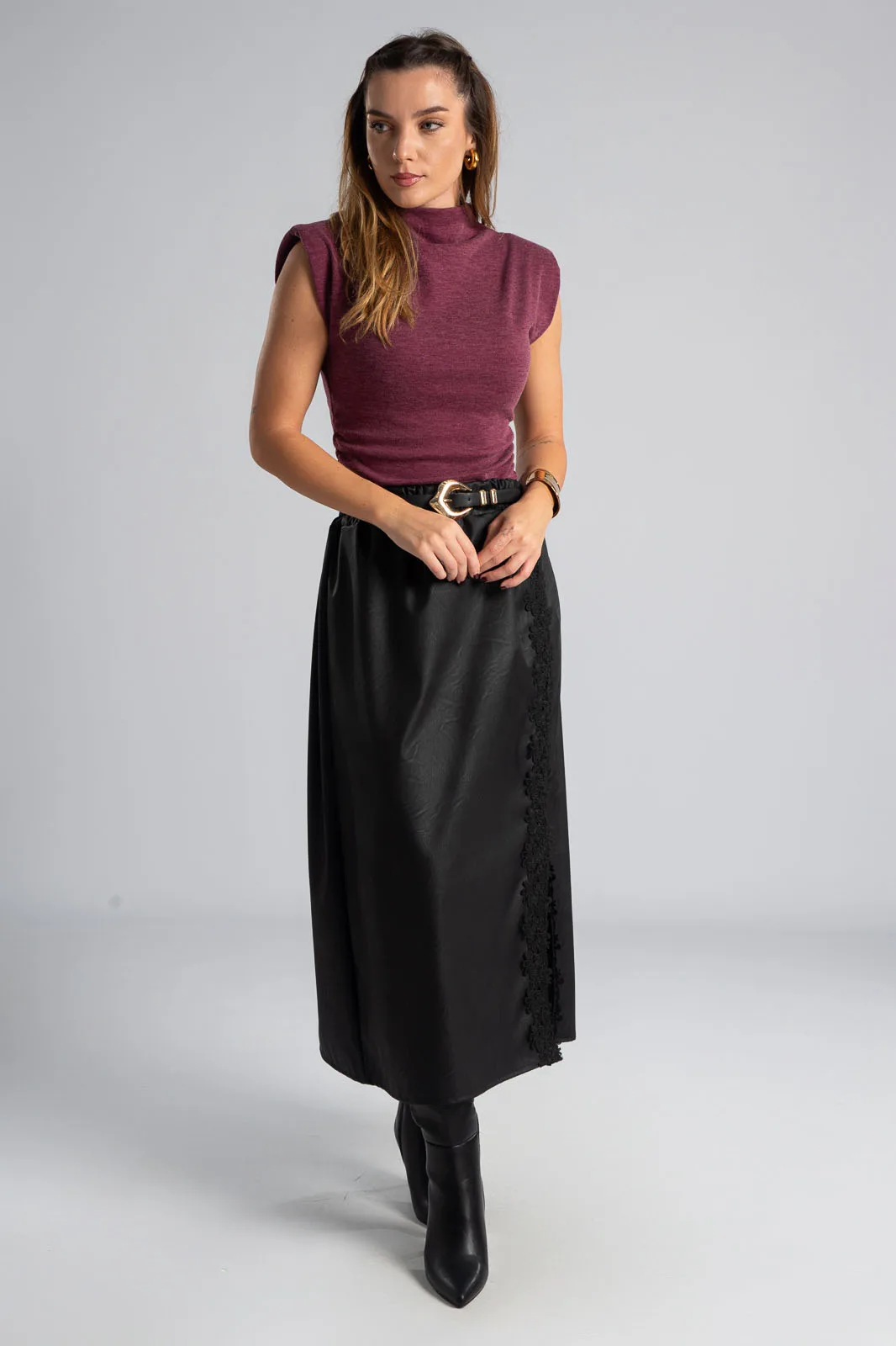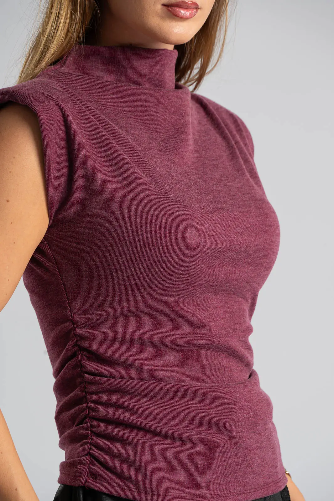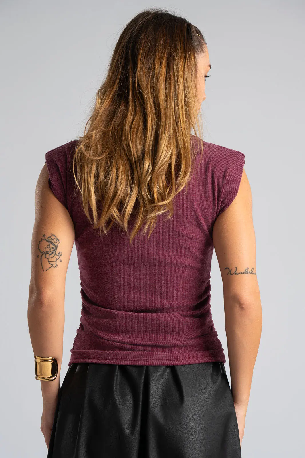 Μπλούζα με νημάτινη συμπαγή πλέξη και lupeto λαιμόκοψη. Είναι αμάνικο και διαθέτει βάτες στους ώμους. Στα πλαινά της έχει σούρες. Οι μετρήσεις του πίνακα είναι αντιπροσωπευτικές για κάθε προϊόν. 69% polyester, 28% viscose, 3% elastan.
