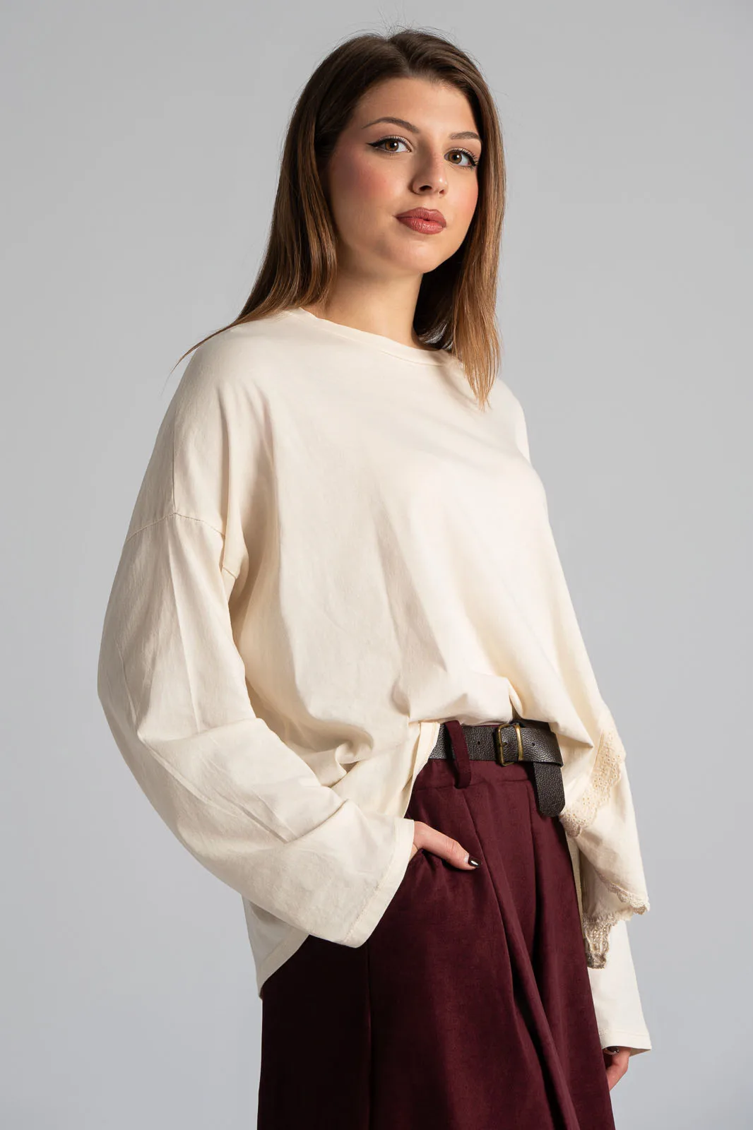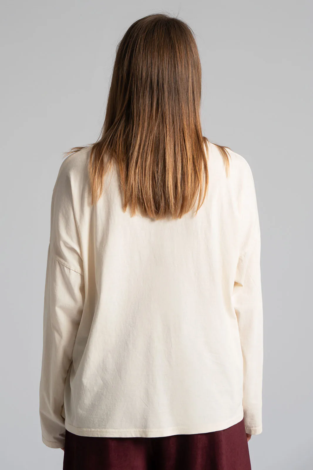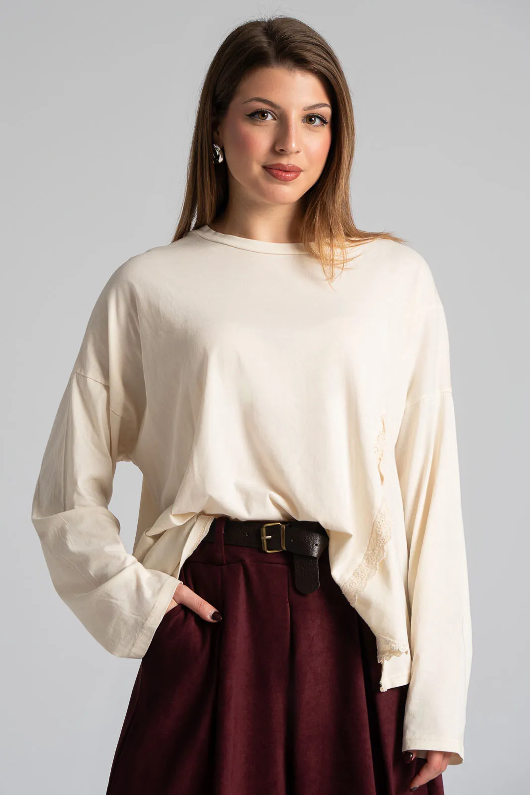 Μπλούζα βαμβακερή με στρογγυλή λαιμόκοψη. Διαθέτει μακριά μανίκια. Στο τελείωμα στη μια πλευρά της διαθέτει εικονικό άνοιγμα με λεπτρομέρεια κιπούρ. Οι μετρήσεις του πίνακα είναι αντιπροσωπευτικές για κάθε κωδικό. 100% cotton.