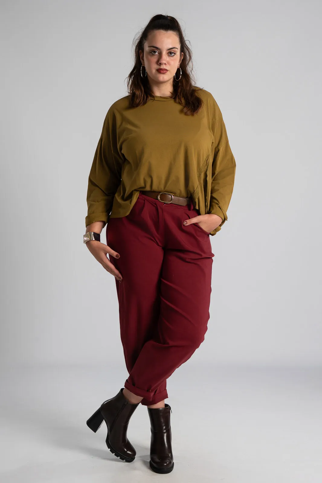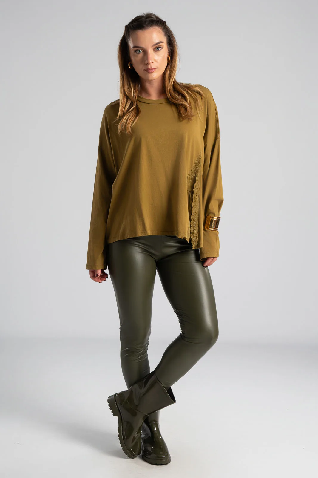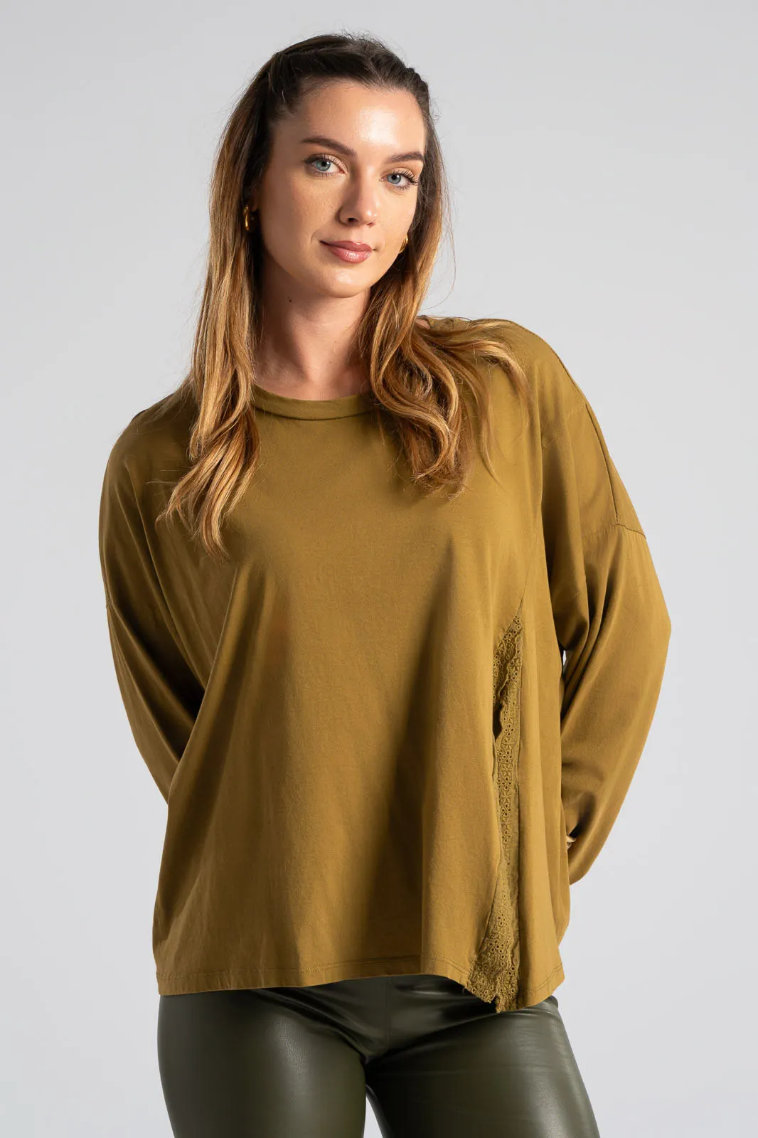 Μπλούζα βαμβακερή με στρογγυλή λαιμόκοψη. Διαθέτει μακριά μανίκια. Στο τελείωμα στη μια πλευρά της διαθέτει εικονικό άνοιγμα με λεπτρομέρεια κιπούρ. Οι μετρήσεις του πίνακα είναι αντιπροσωπευτικές για κάθε κωδικό. 100% cotton.
