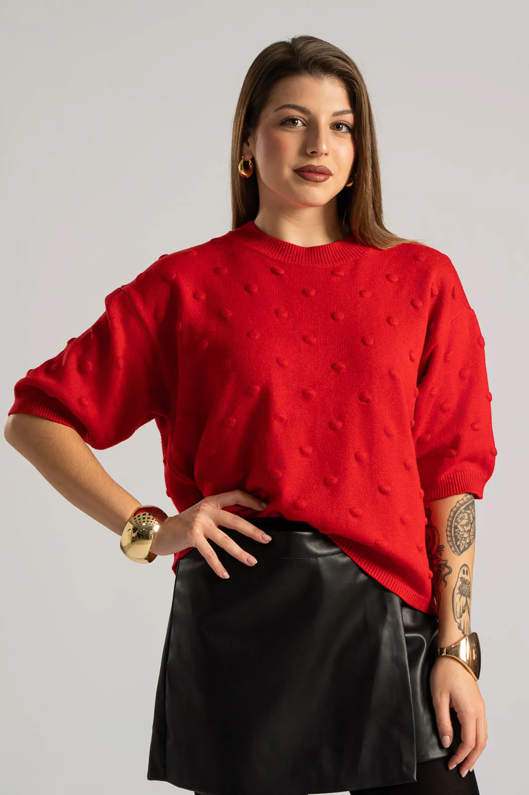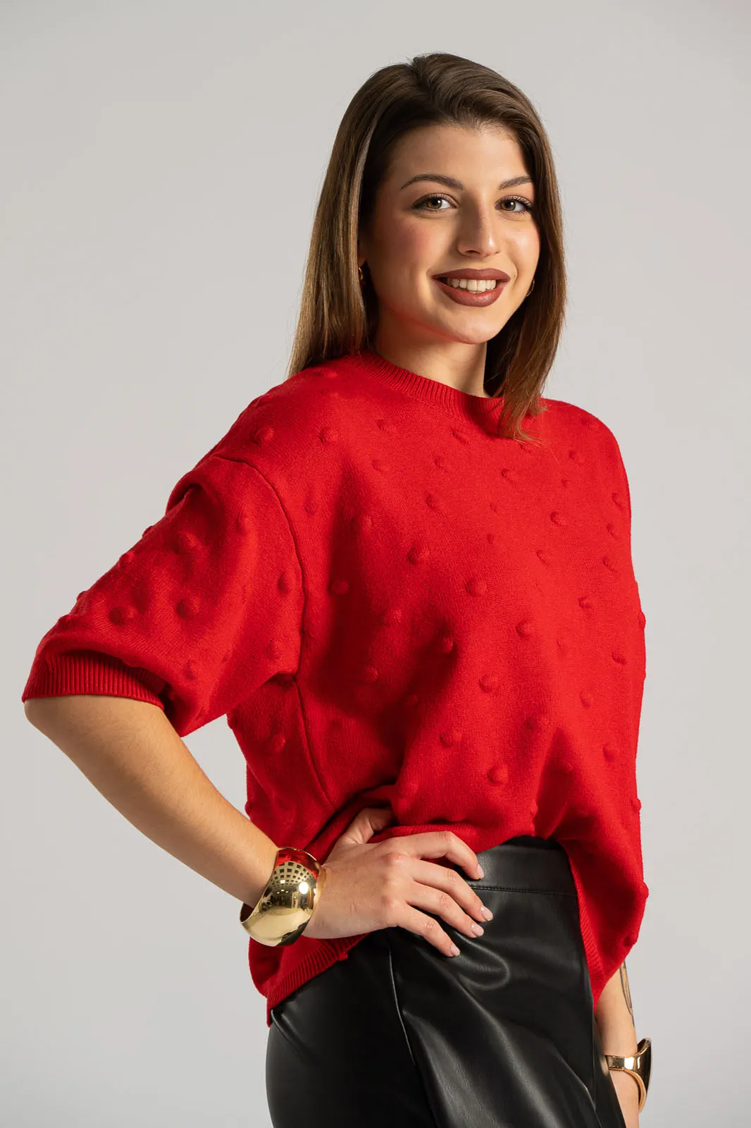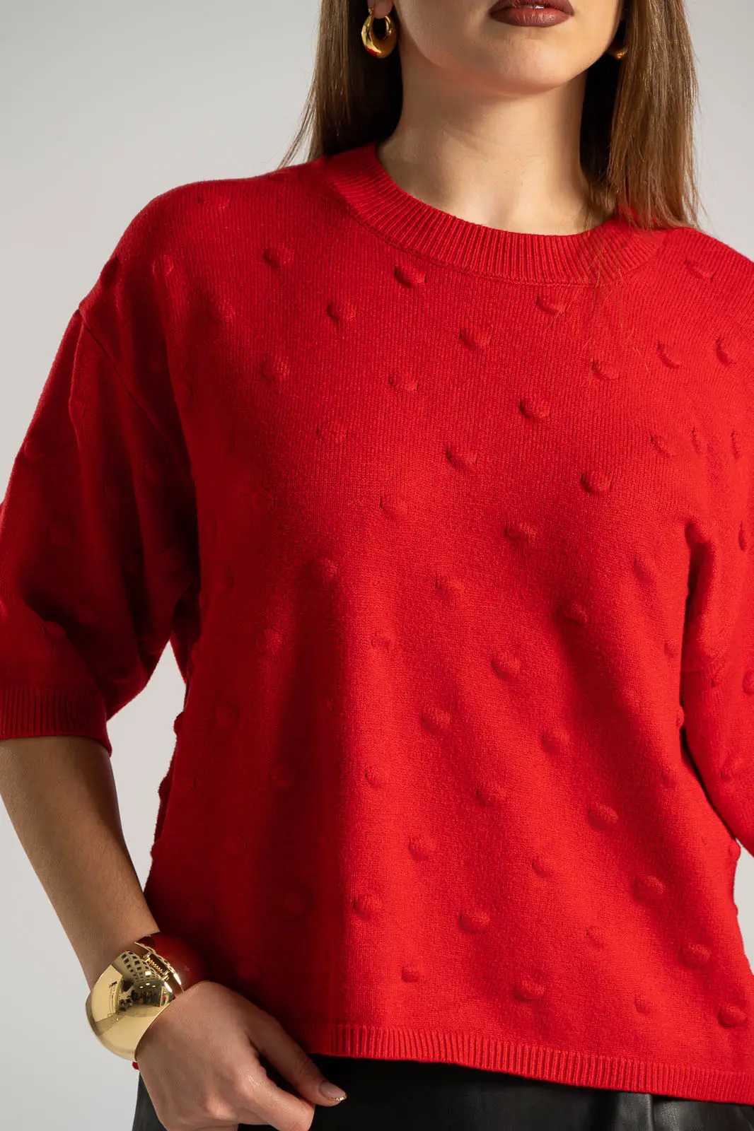 Μπλούζα νημάτινη με συμπαγή πλέξη και στρογγυλή λαιμόκοψη. Διαθέτει κοντά μανίκια. Σε όλη την επιφάνεια έχει ανάγλυφες 3d λεπτομέρειες σε στρογγυλή όψη. Οι μετρήσεις του πίνακα είναι αντιπροσωπευτικές για κάθε προϊόν. 88% viscose, 12% nylon.
