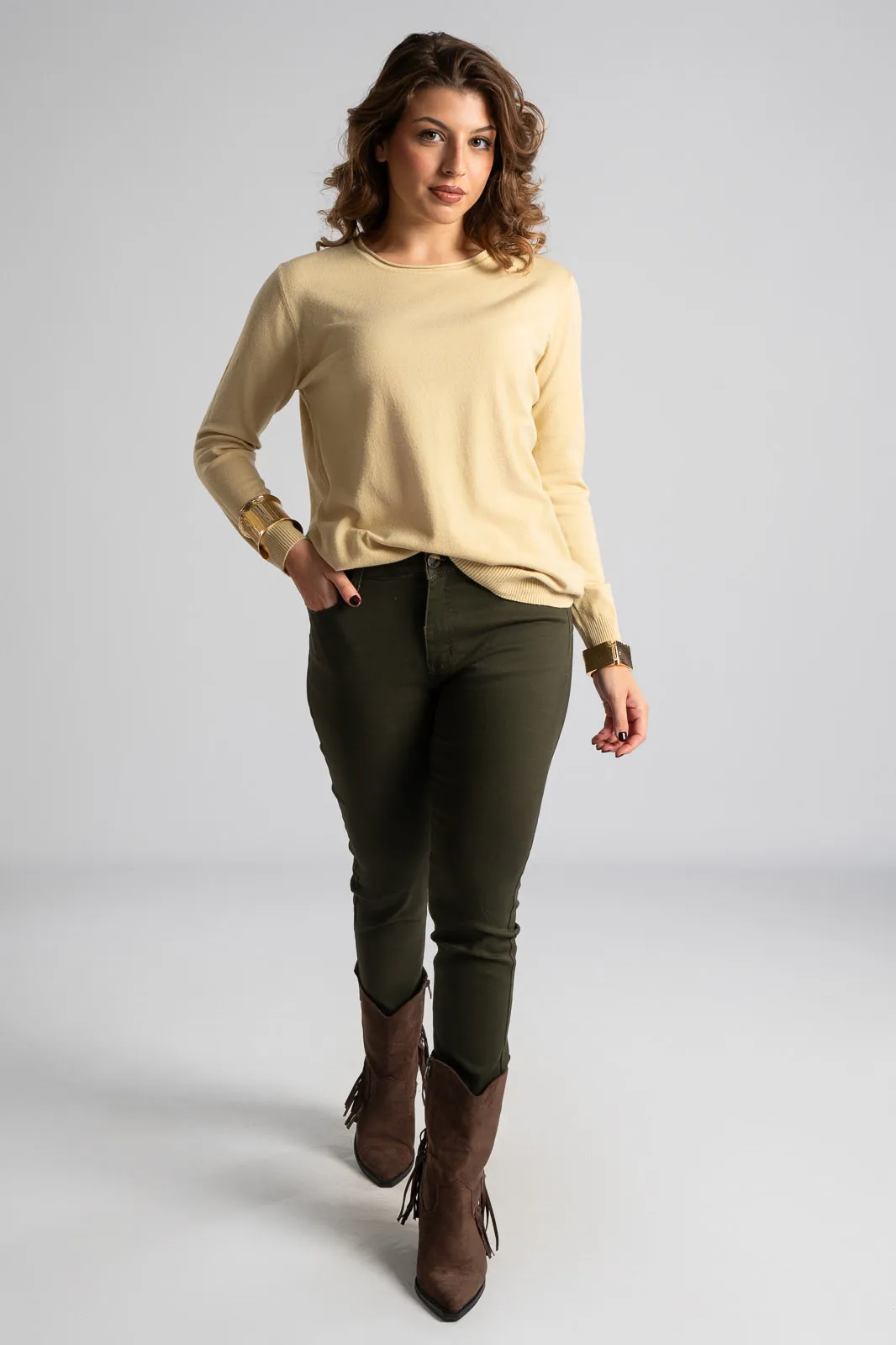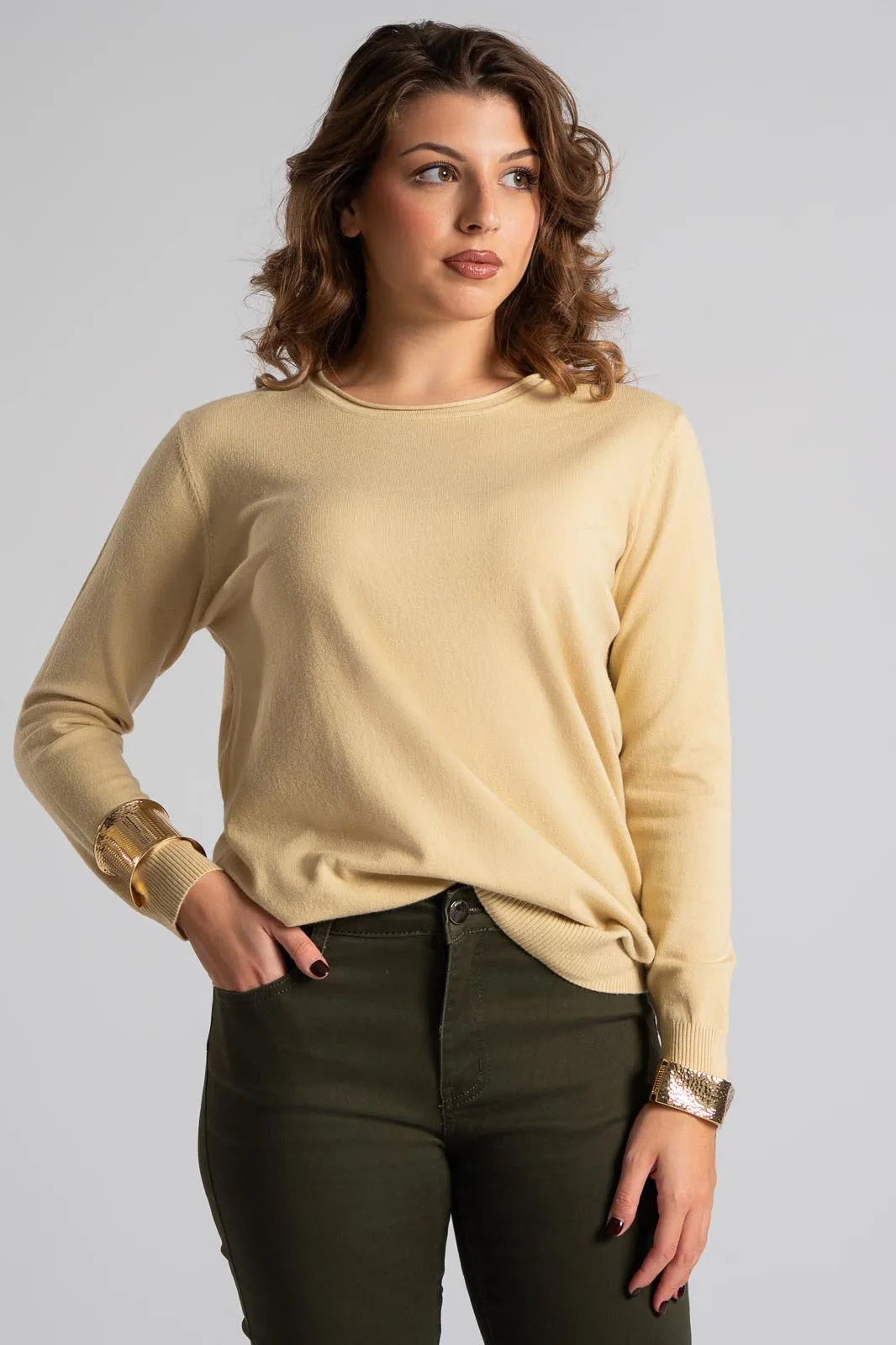 Blouse with a round neckline. It has long sleeves and a straight cut. The hem and sleeves are ribbed. The fabric is very soft. The measurements in the table are representative for each code. 45% viscose, 27% polyester, 23% nylon, 5% modal.