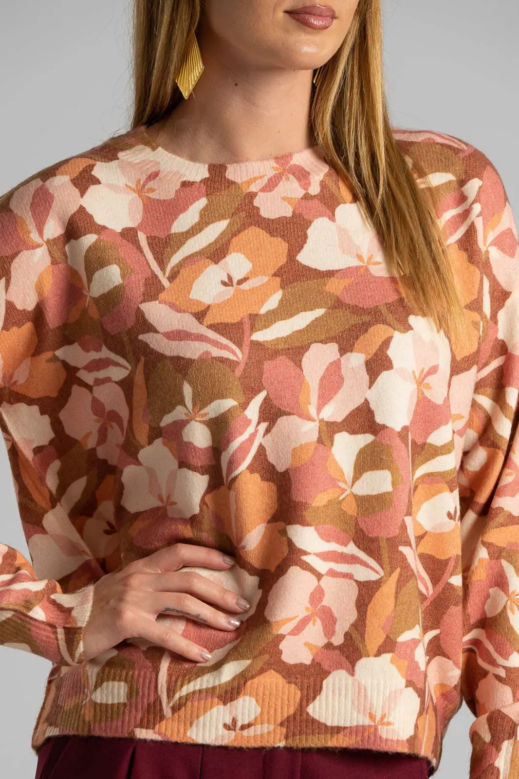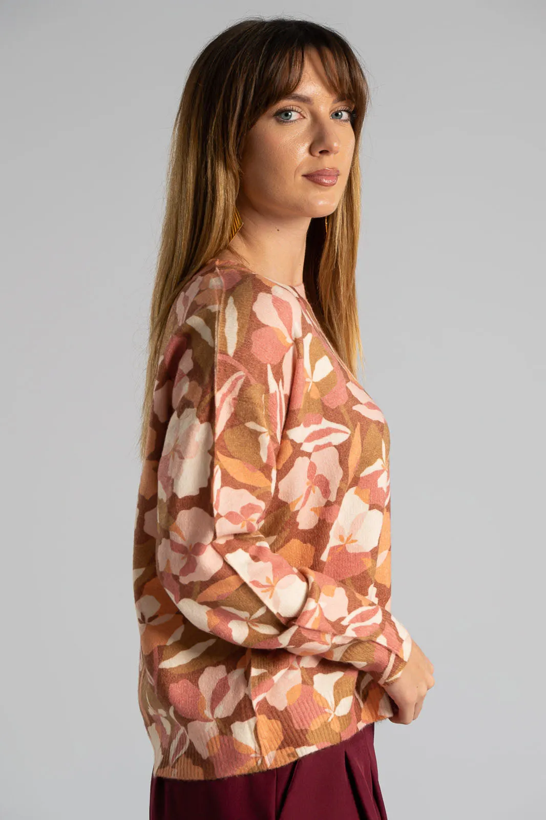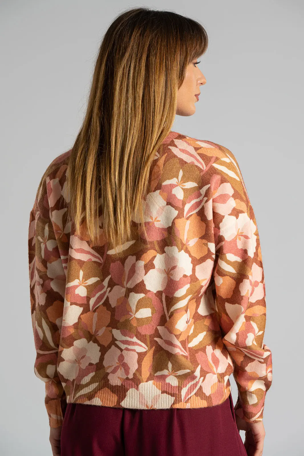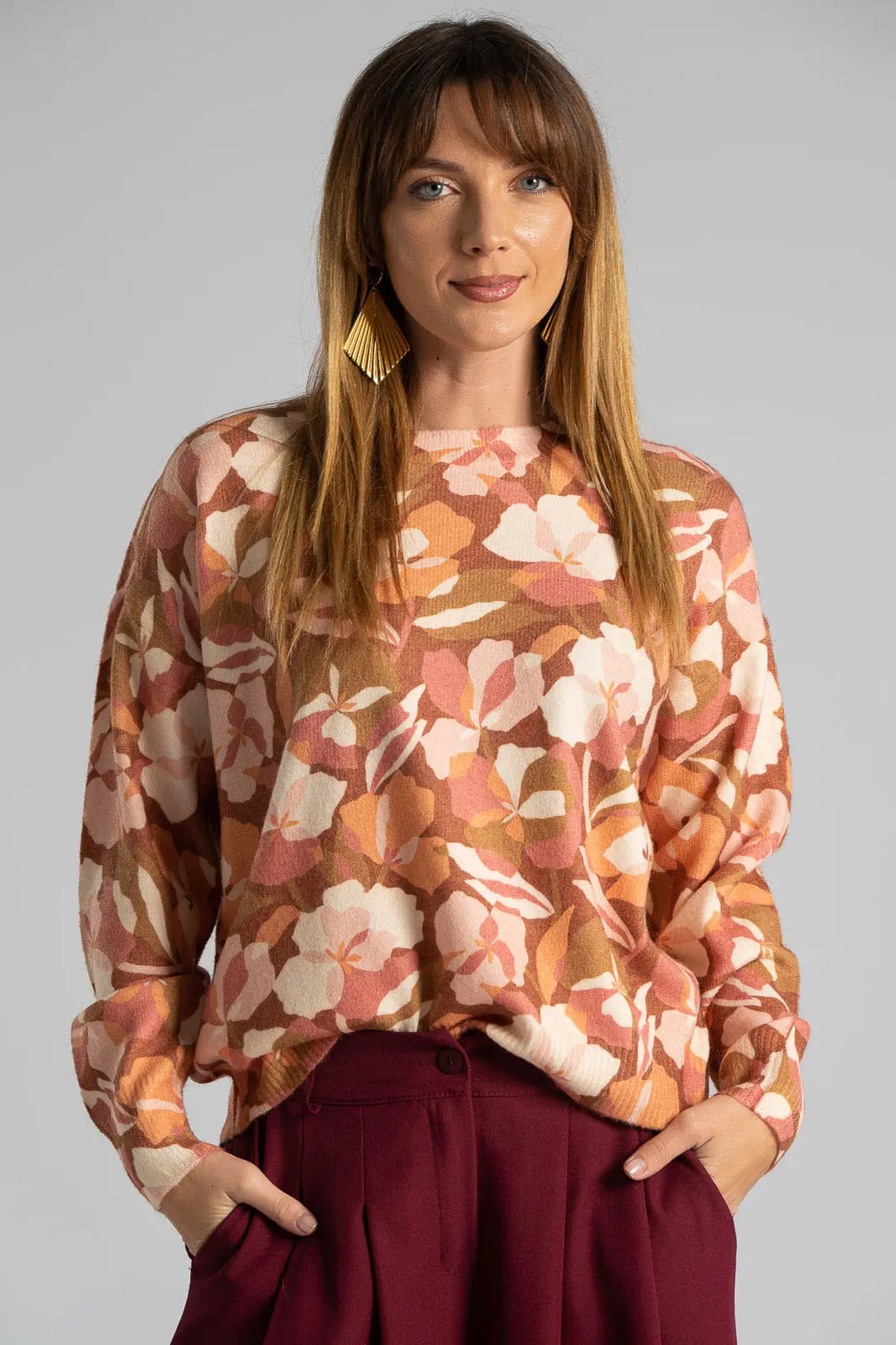 Μπλούζα με νημάτινη συμπαγή πλέξη. Έχει στρογγυλή λαιμόκοψη και μακριά μανίκια. Σε όλη την επιφάνεια έχει floral pattern και έχει απαλή υφή. Το πίσω μέρος είναι ελαφρώς μακρύτερο. Οι μετρήσεις του πίνακα είναι αντιπροσωπευτικές για κάθε προϊόν. 40% polyester, 38% wool, 20% polyamide, 2% spandex.