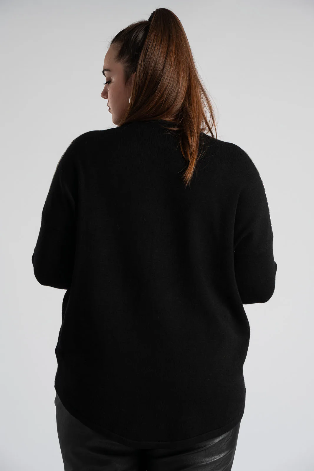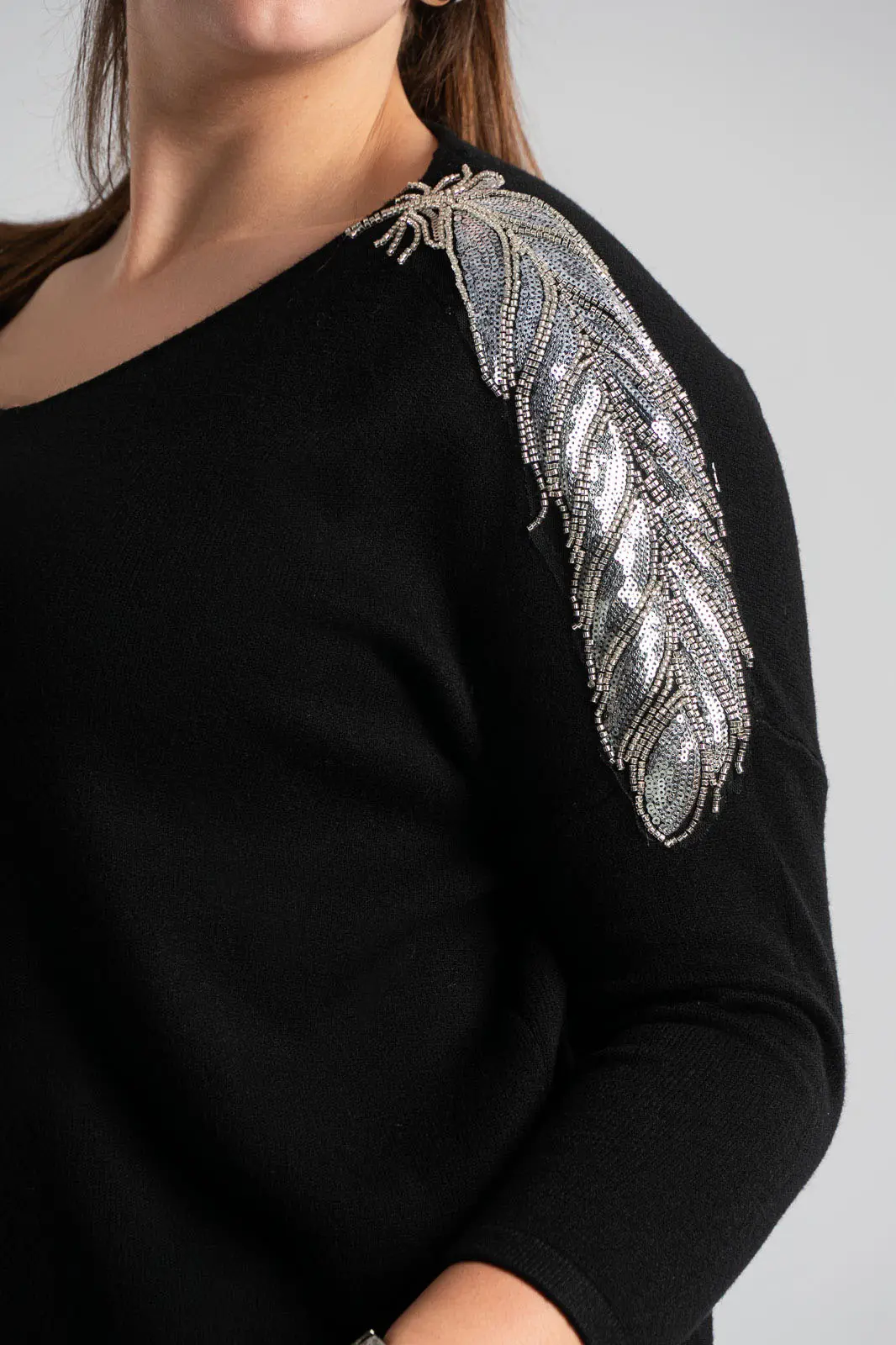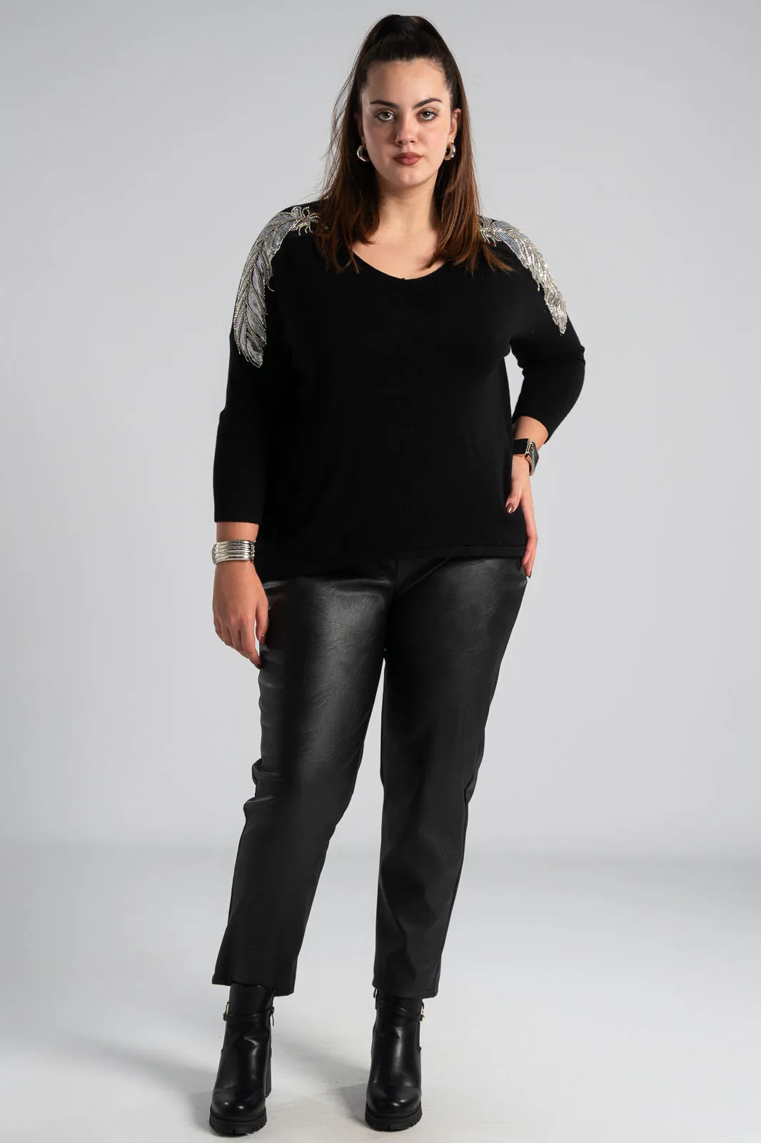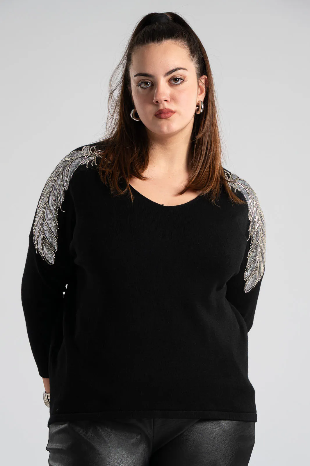 Μπλούζα νημάτινη με V λαιμόκοψη. Έχει μακριά μανίκια και είναι ασύμμετρη. Στους ώμους είναι διακοσμημένη με παγιέτες και χάντρες σε σχήμα φτερού. Το ύφασμα της είναι πολύ μαλακό. Στο τελείωμα διαθέτει rib ύφανση. Οι μετρήσεις του πίνακα είναι αντιπροσωπευτικές για κάθε κωδικό. 50% viscose, 30% polyester, 20% polyamide.