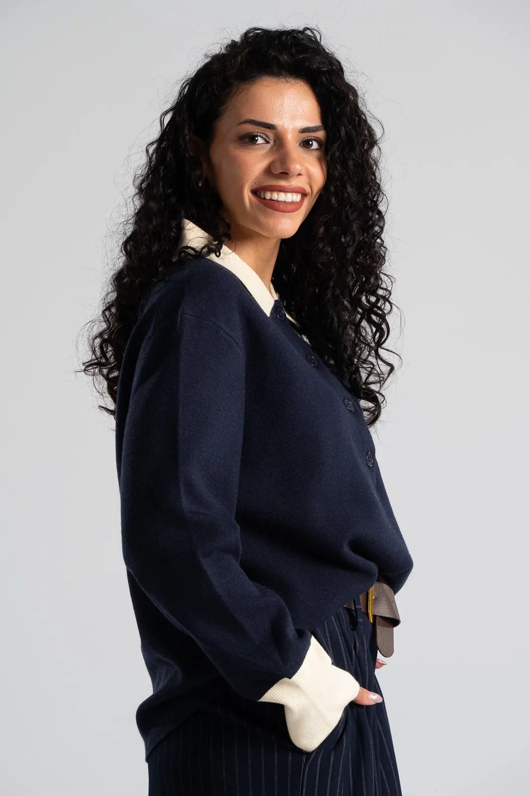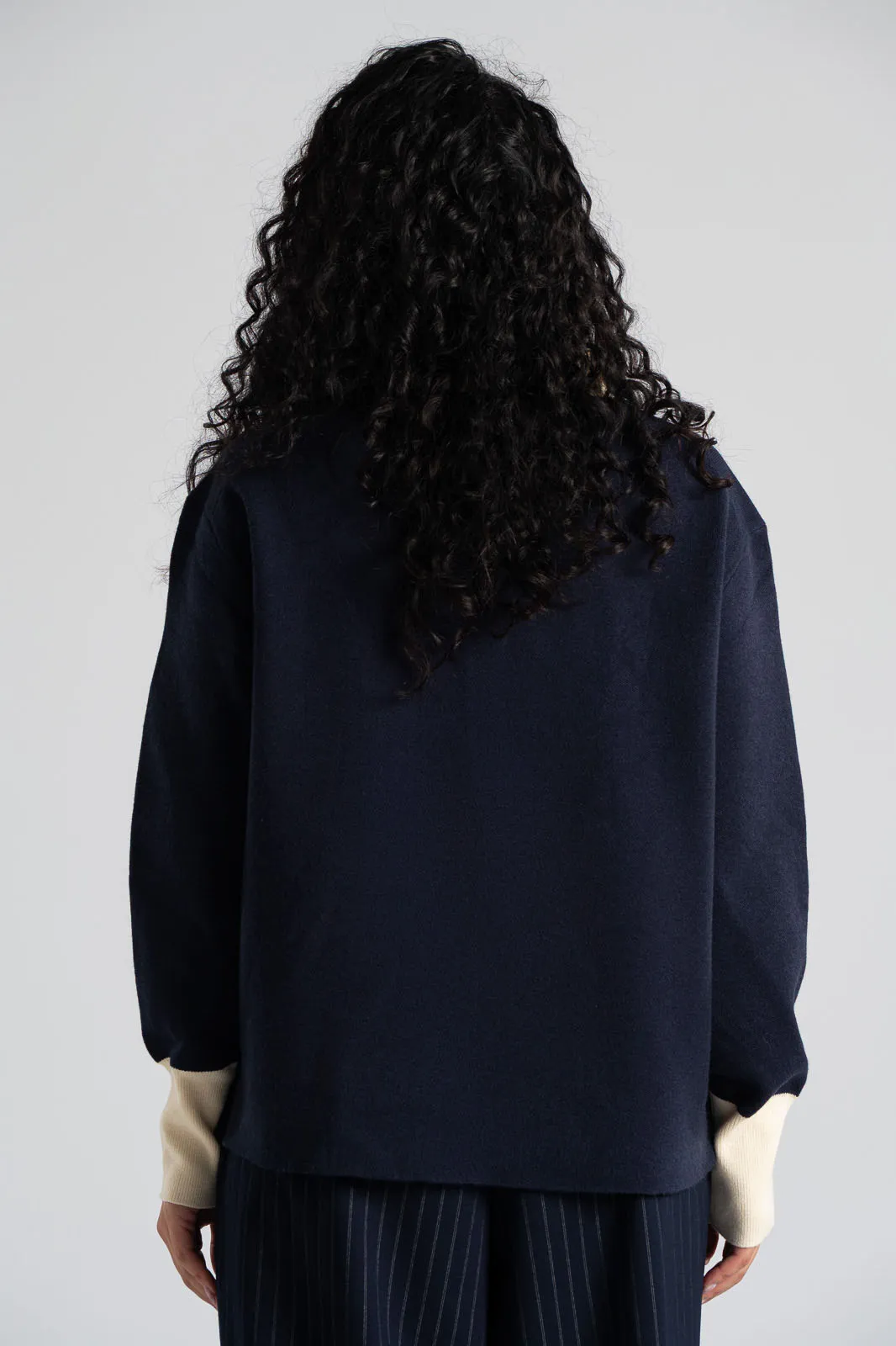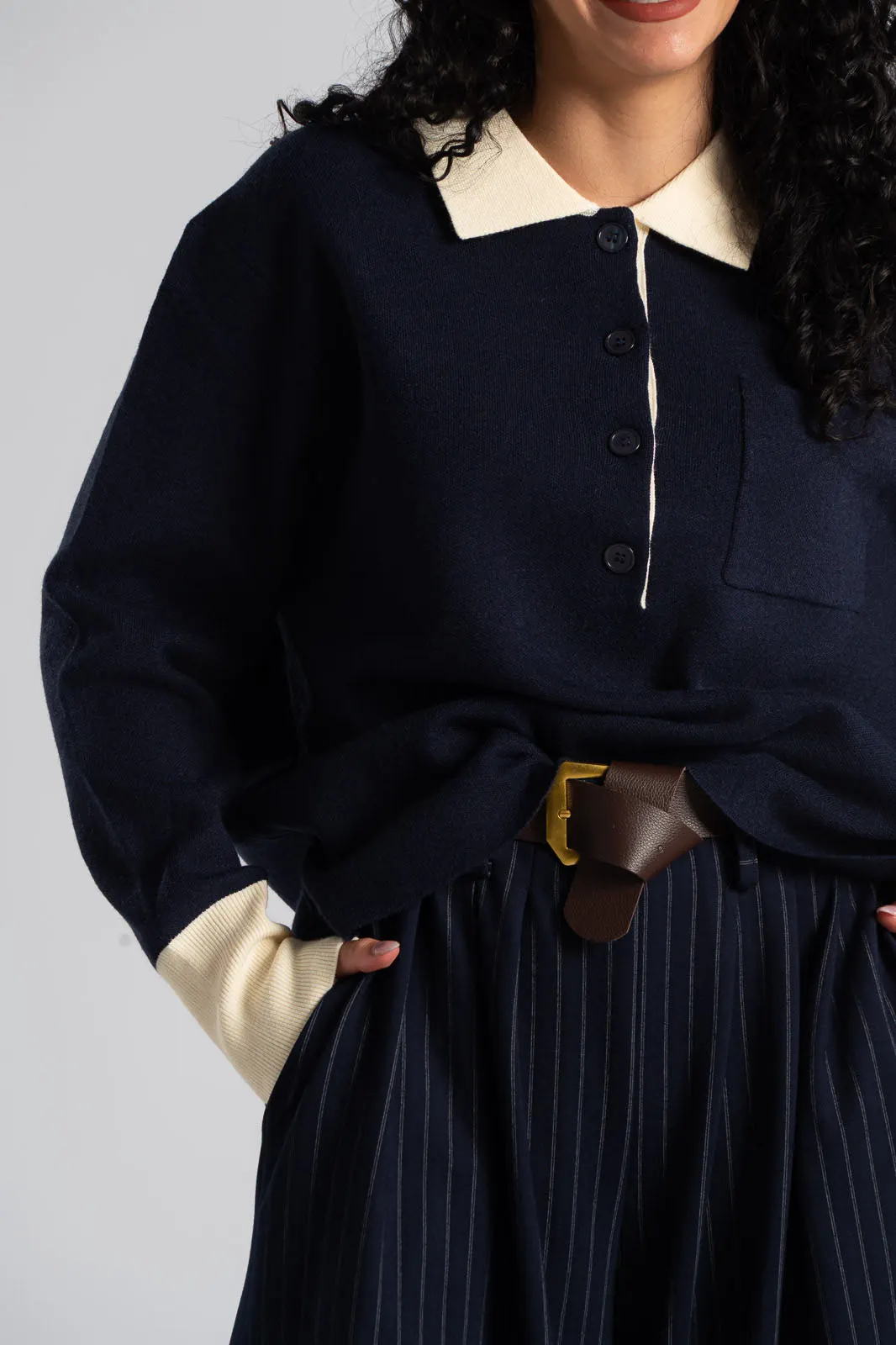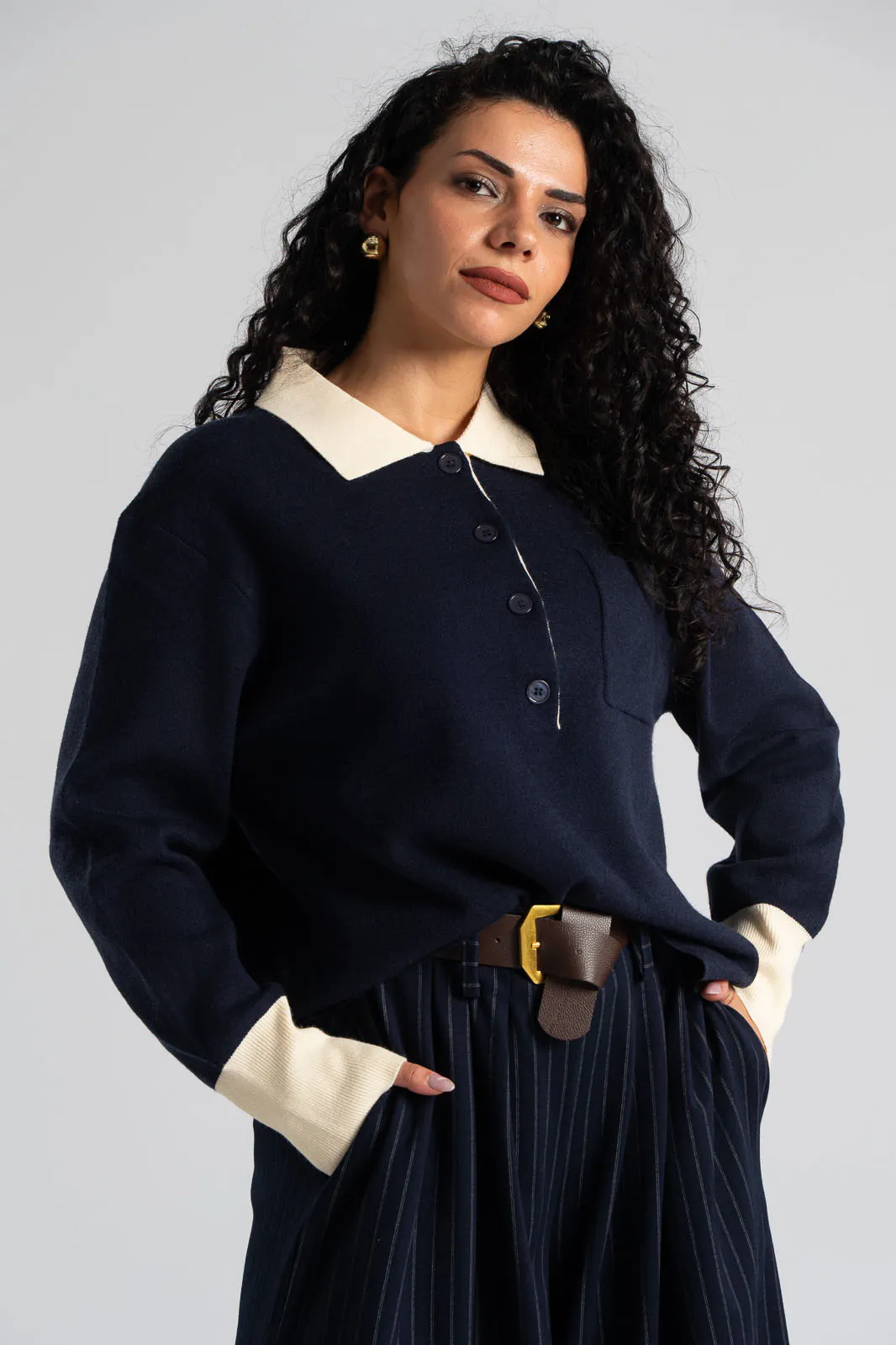 Μπλούζα polo. Είναι νημάτινη με συμπαγή πλέξη και έχει ίσια γραμμή. Διαθέτει γιακά και κουμπιά στη λαιμόκοψη. Έχει μακριά μανίκια και στο τελείωμα τους διαθέτει rib ύφανση. Ο γιακάς και το τελείωμα των μανικιών είναι σε λευκό χρώμα. Στο ύψος του στήθος διαθέτει τσέπη. Οι μετρήσεις του πίνακα είναι αντιπροσωπευτικές για κάθε κωδικό. 40% polyester, 38% wool, 20% polyamide, 2% spandex.