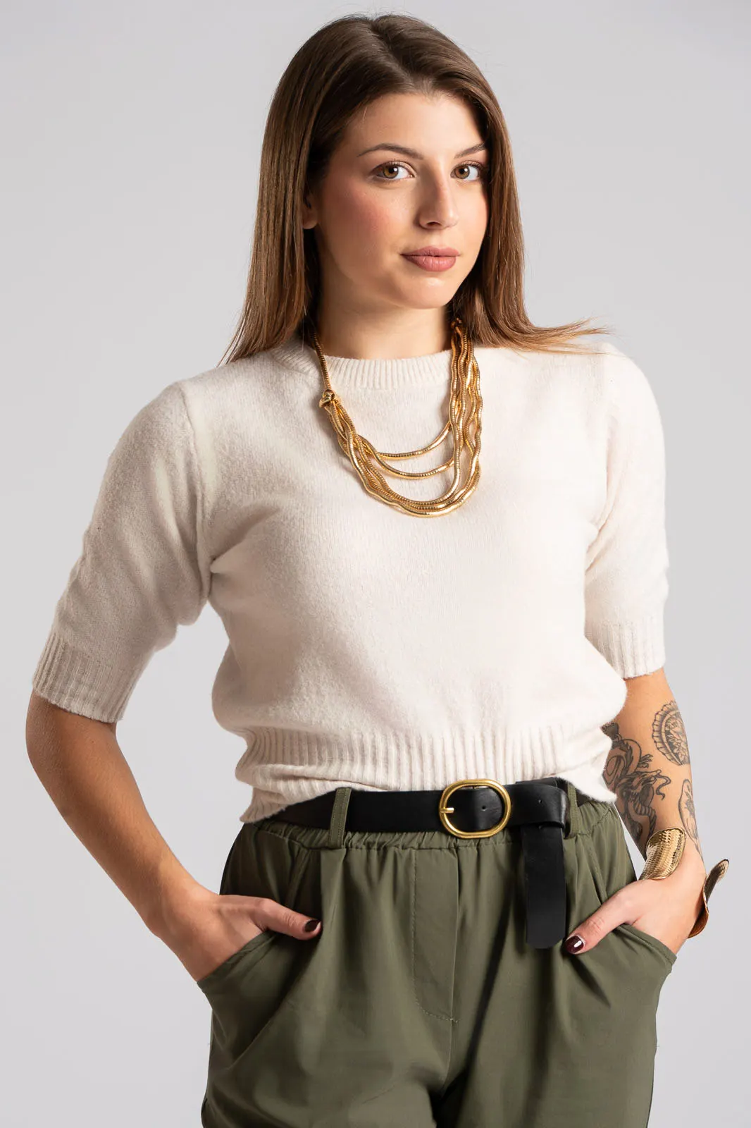 Blouse with compact knit. It has a round neckline and short sleeves. It combines different colors across its entire surface using the melange technique. It has ribbed detailing at the neckline and cuffs. It has a soft texture and a straight cut. The measurements in the table are representative for each code. 93% polyester, 5% wool, 2% spandex.