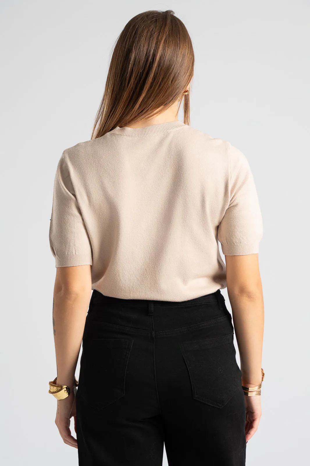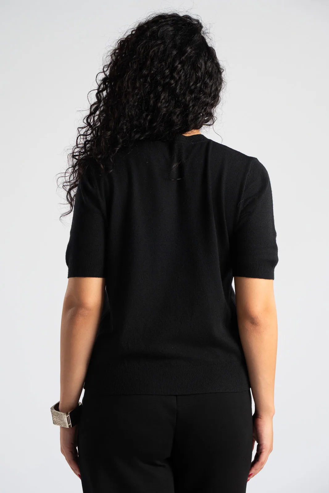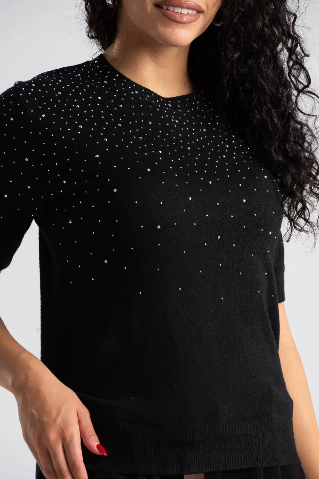 Μπλούζα με νημάτινη συμπαγή πλέξη. Διαθέτει στρογγυλή λαιμόκοψη και έχει κοντά μανίκια. Στο πάνω μέρος είναι διακοσμημένη με στρας. Στο τελείωμα της, στη λαιμόκοψη και στο τελείωμα των μανικιών διαθέτει rib ύφανση. Οι μετρήσεις του πίνακα είναι αντιπροσωπευτικές για κάθε κωδικό. 65% viscose, 33% polyester,2% elastan.