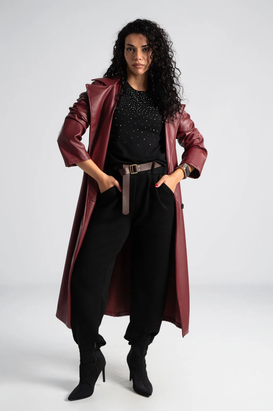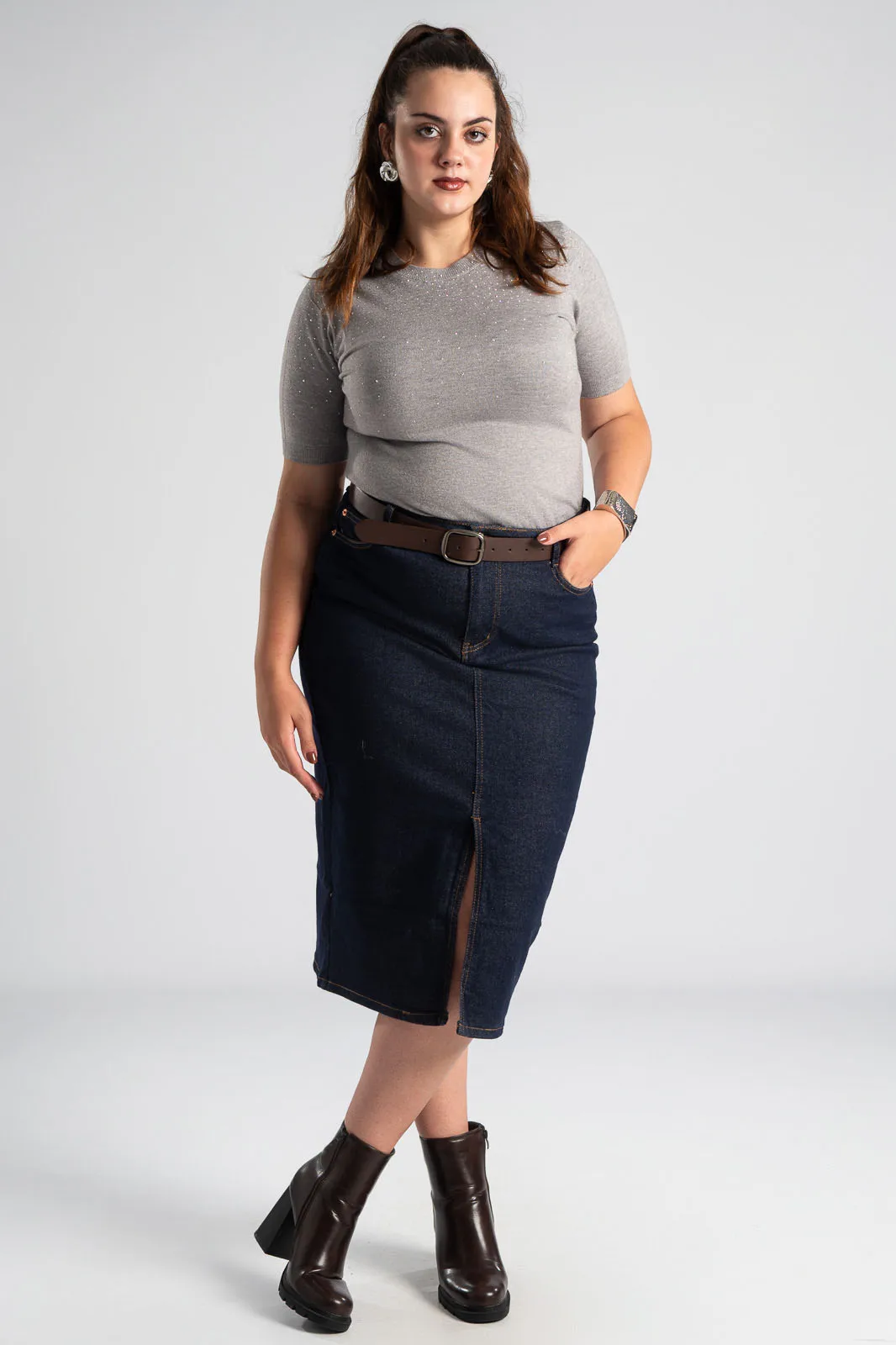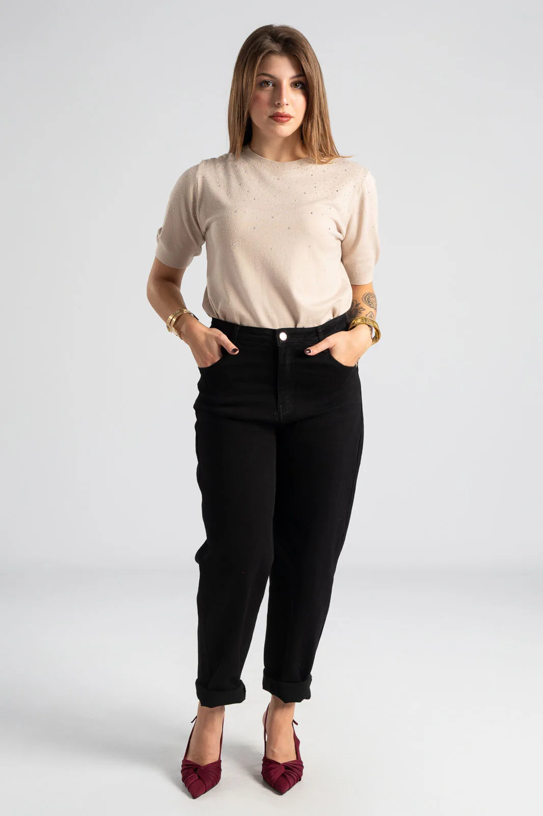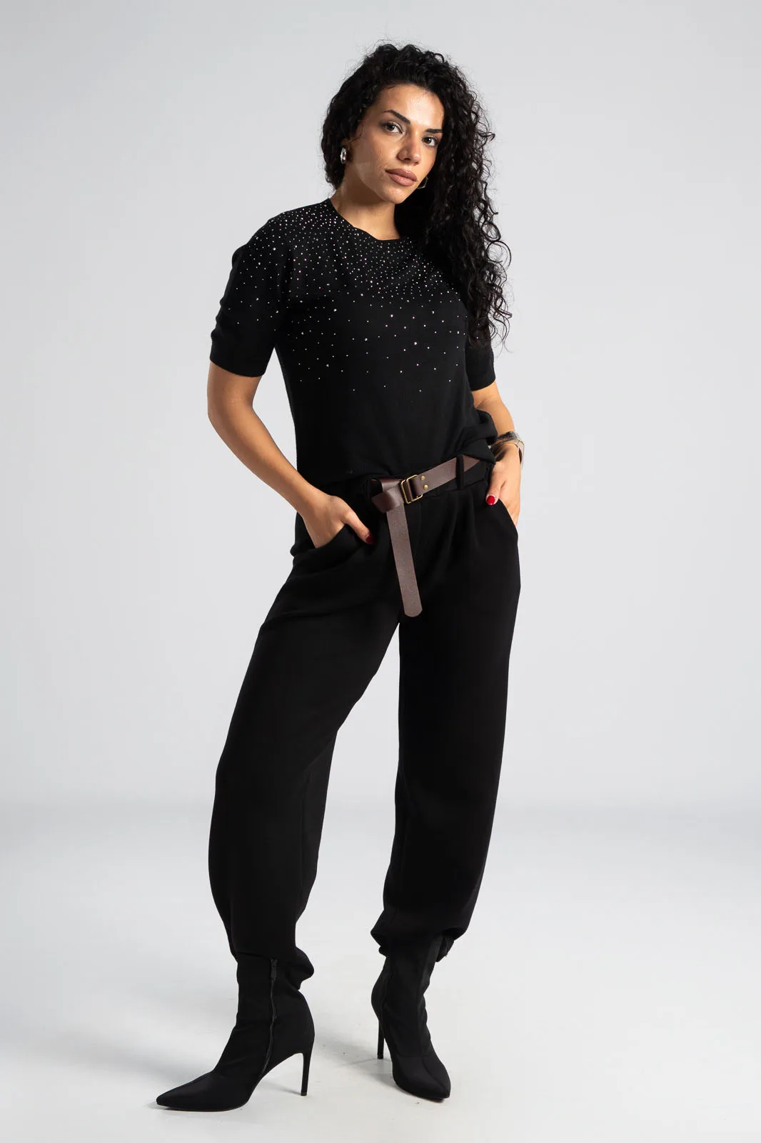 Μπλούζα με νημάτινη συμπαγή πλέξη. Διαθέτει στρογγυλή λαιμόκοψη και έχει κοντά μανίκια. Στο πάνω μέρος είναι διακοσμημένη με στρας. Στο τελείωμα της, στη λαιμόκοψη και στο τελείωμα των μανικιών διαθέτει rib ύφανση. Οι μετρήσεις του πίνακα είναι αντιπροσωπευτικές για κάθε κωδικό. 65% viscose, 33% polyester,2% elastan.