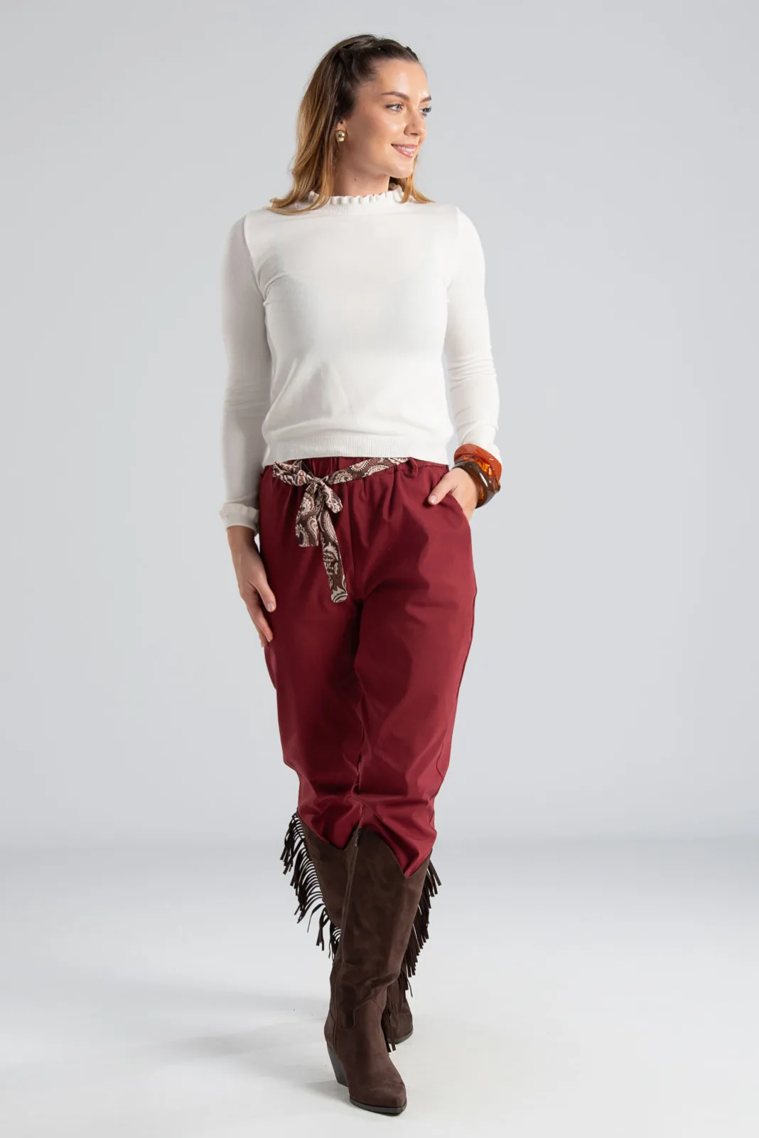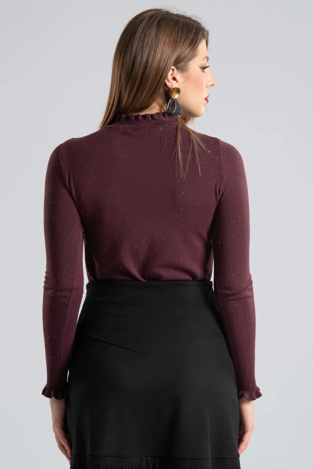 Blouse with lupeto neckline. It has a straight cut and long sleeves. It features very small subtle sequins across the entire surface. The fabric is very soft. The neckline and cuffs feature ruffle details. The hem, neckline, and cuffs feature ribbed fabric. The measurements in the table are representative of each product. 45% viscose, 33% polyester, 17% nylon, 5% sequin.