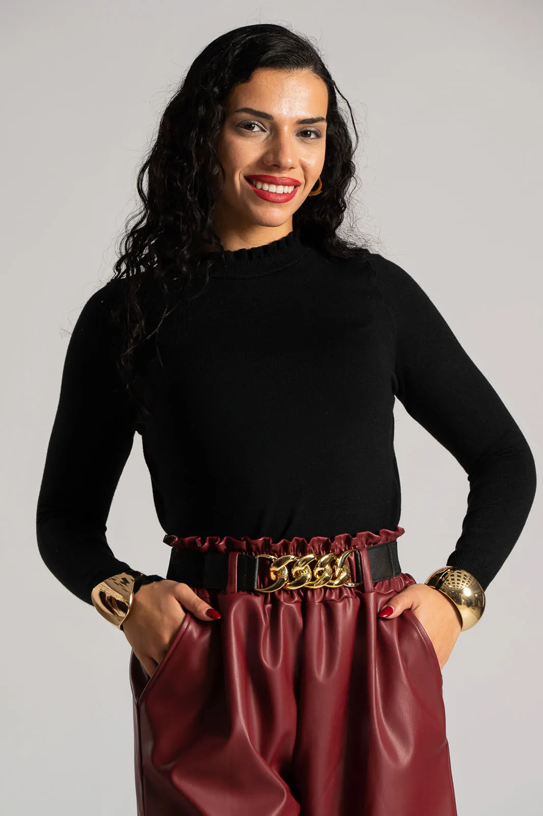 Blouse with lupeto neckline. It has a straight cut and long sleeves. It features very small subtle sequins across the entire surface. The fabric is very soft. The neckline and cuffs feature ruffle details. The hem, neckline, and cuffs feature ribbed fabric. The measurements in the table are representative of each product. 45% viscose, 33% polyester, 17% nylon, 5% sequin.