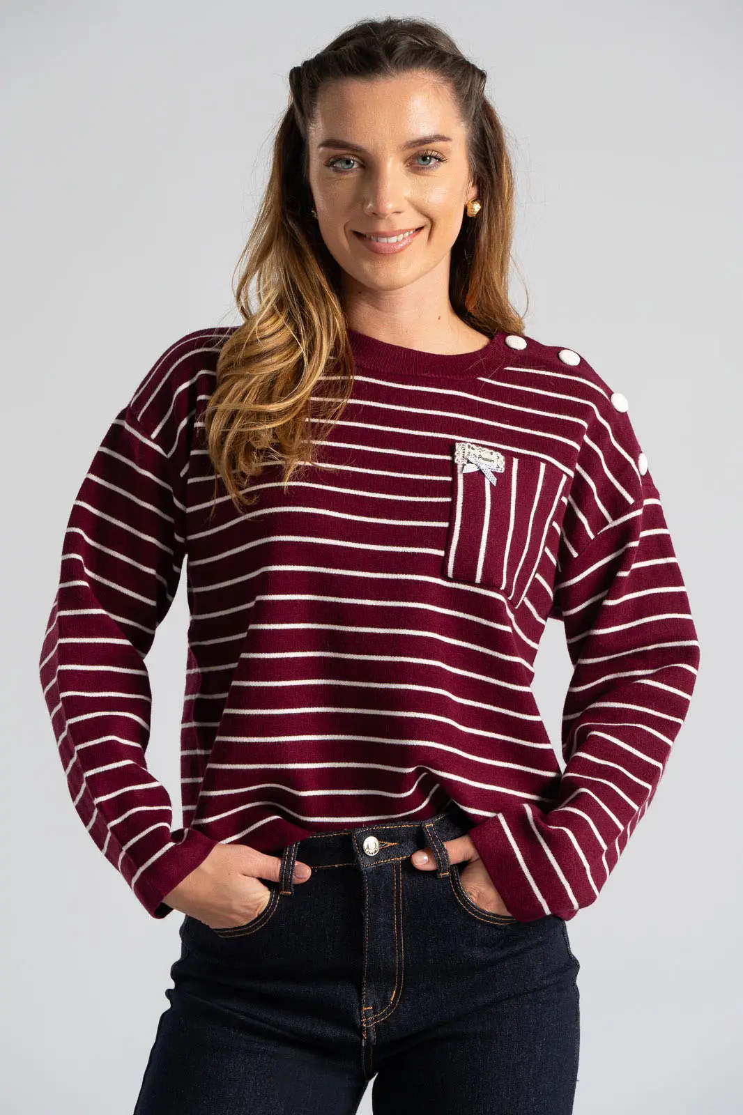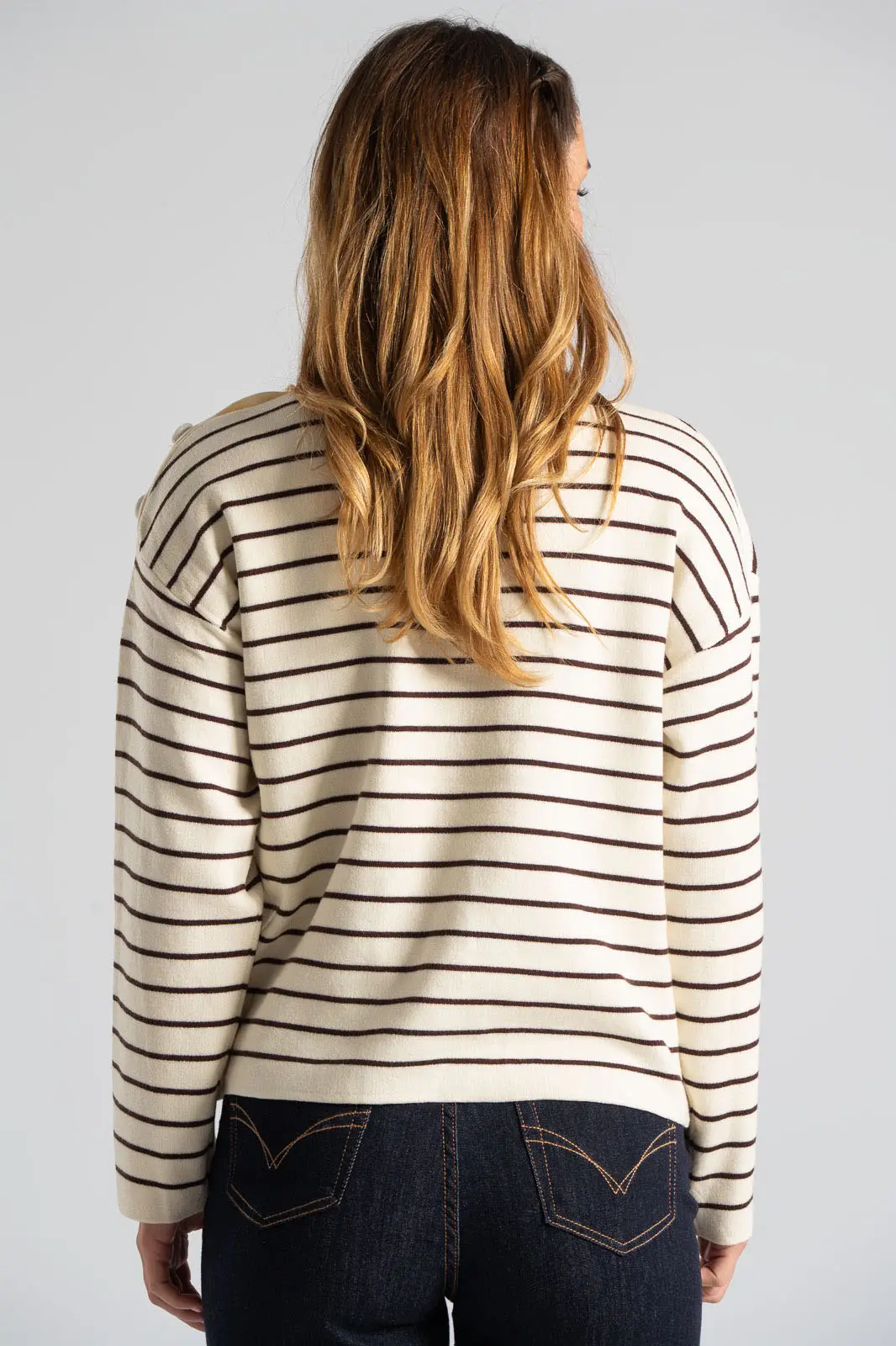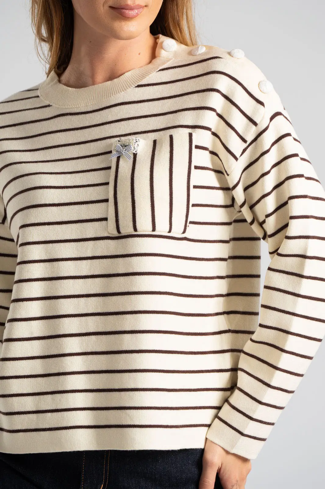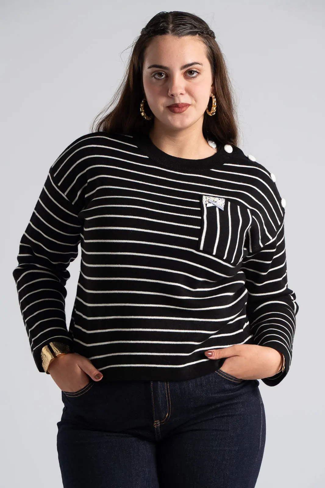 Μπλούζα νημάτινη με συμπαγή πλέξη. Έχει μακριά μανίκια και στον ώμο έχει διακοσμητικά κουμπιά. Έχει στρογγυλή λαιμόκοψη με rib ύφανση. Έχει ίσια γραμμή και σε όλη την επιφάνεια της έχει ρίγες. Διαθέτει τσέπη στο ύψος του στήθους. Οι μετρήσεις του πίνακα είναι αντιπροσωπευτικές για κάθε κωδικό. 40% polyester, 38% wool, 20% polyamide, 2% elastan.