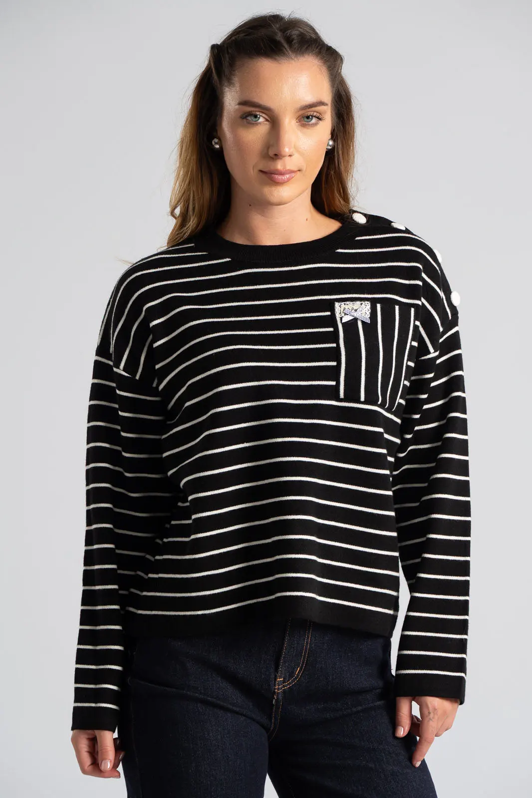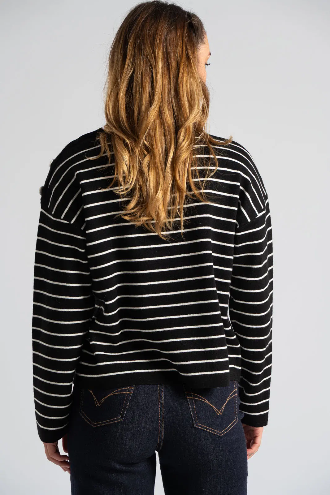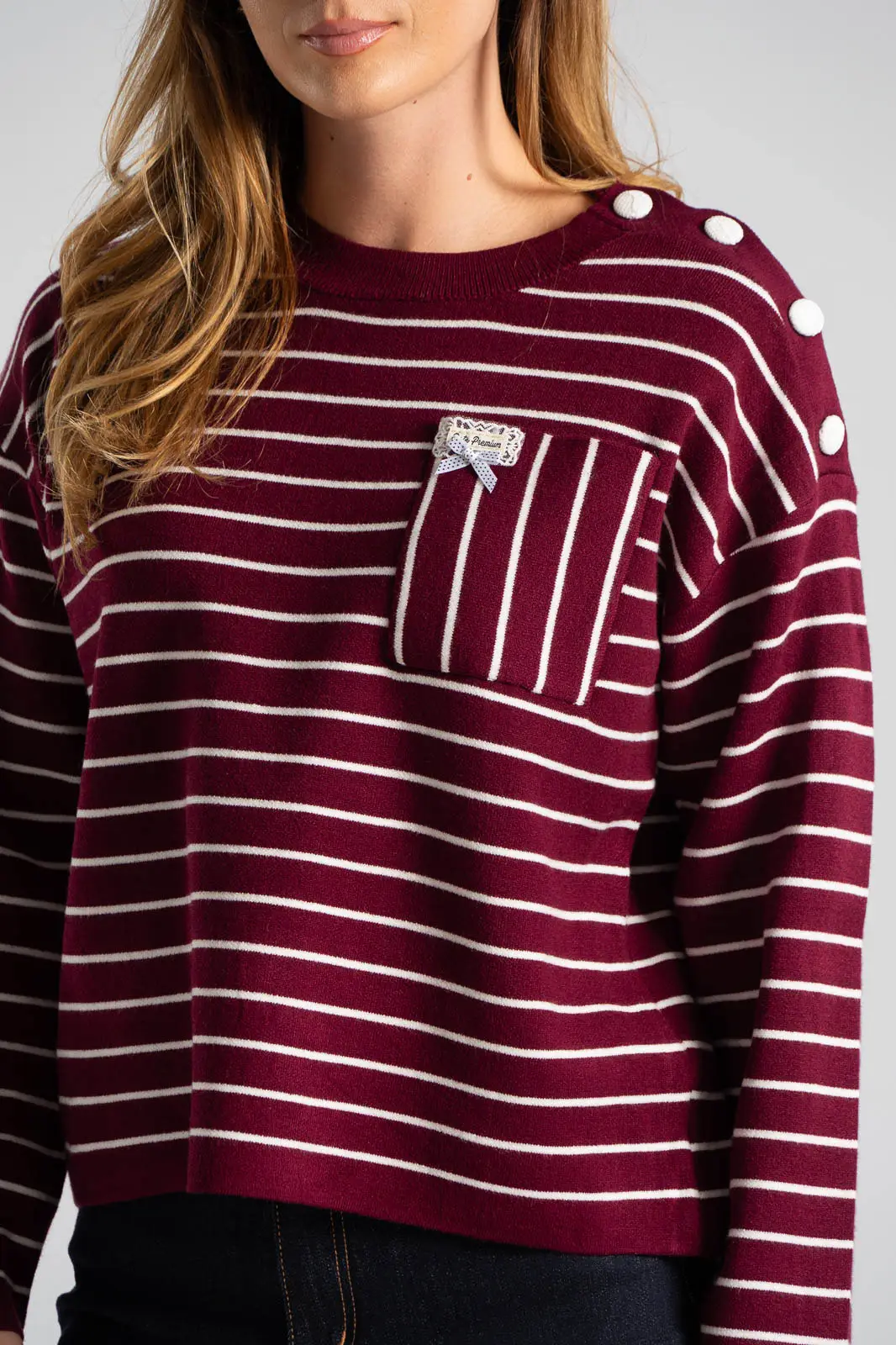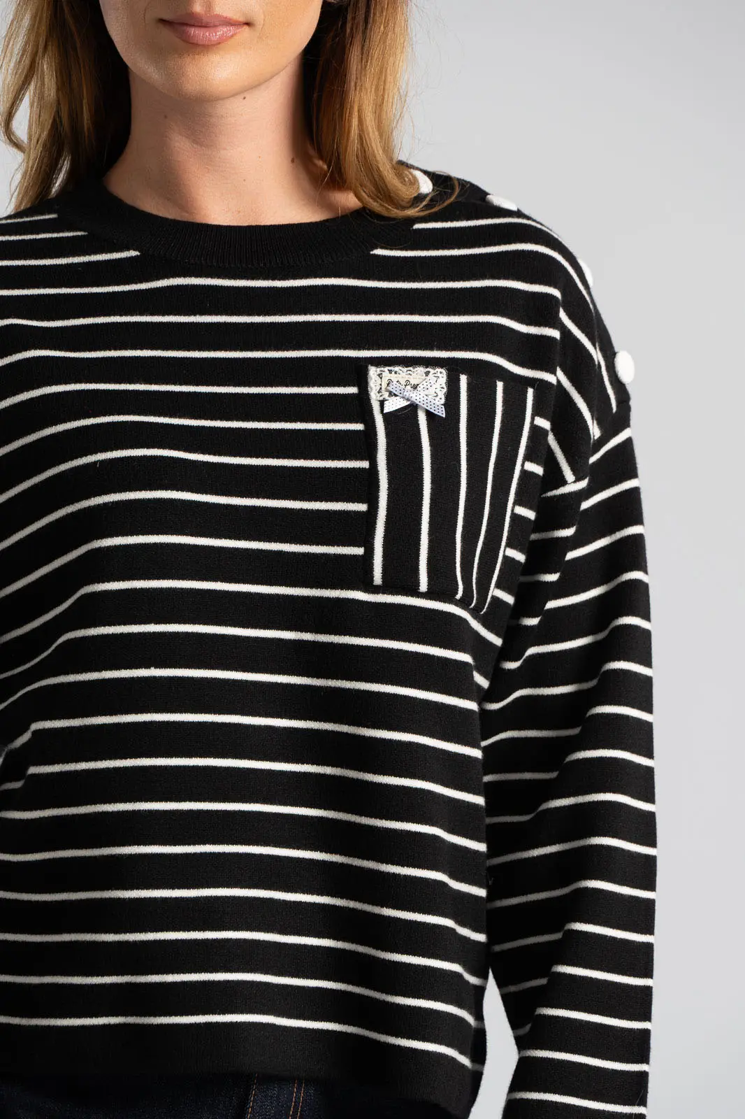 Μπλούζα νημάτινη με συμπαγή πλέξη. Έχει μακριά μανίκια και στον ώμο έχει διακοσμητικά κουμπιά. Έχει στρογγυλή λαιμόκοψη με rib ύφανση. Έχει ίσια γραμμή και σε όλη την επιφάνεια της έχει ρίγες. Διαθέτει τσέπη στο ύψος του στήθους. Οι μετρήσεις του πίνακα είναι αντιπροσωπευτικές για κάθε κωδικό. 40% polyester, 38% wool, 20% polyamide, 2% elastan.