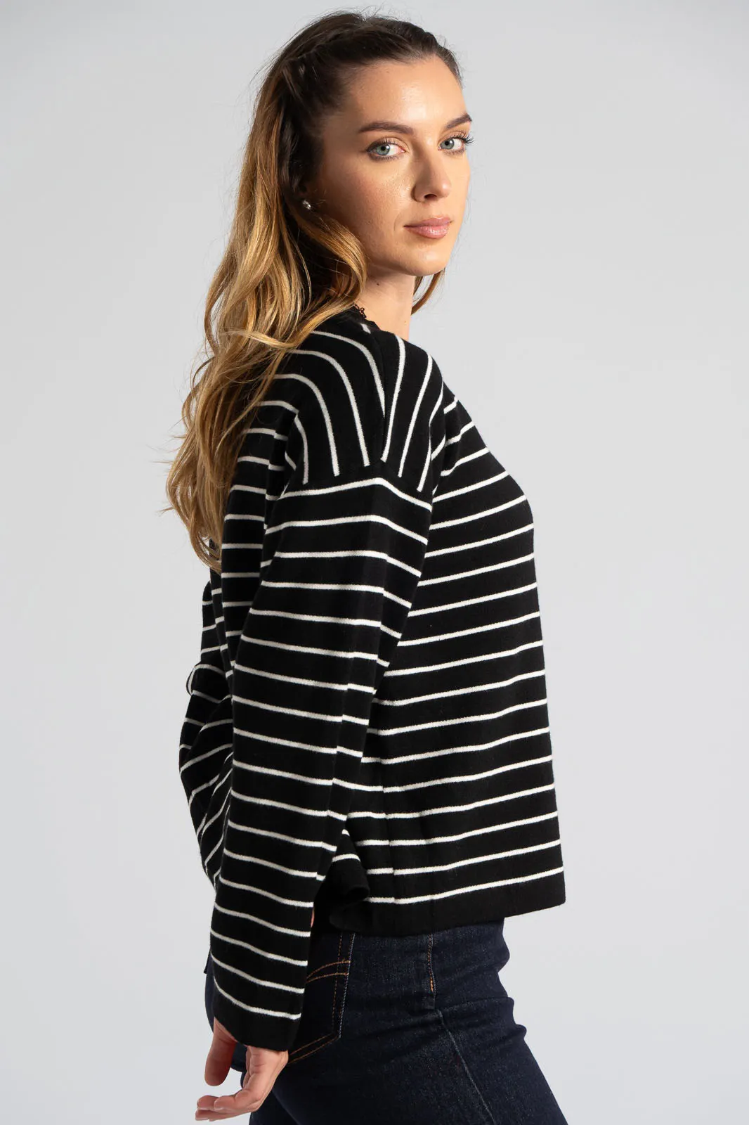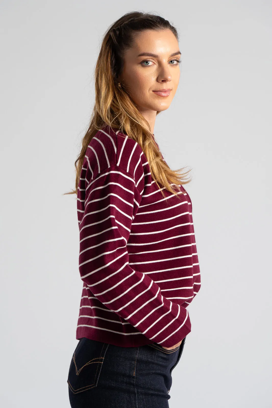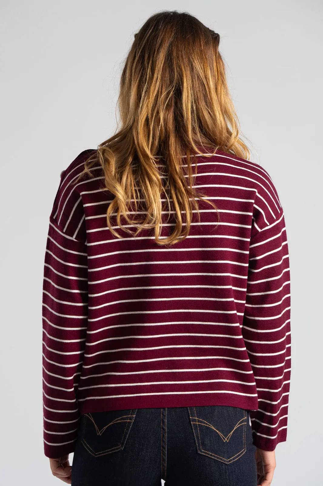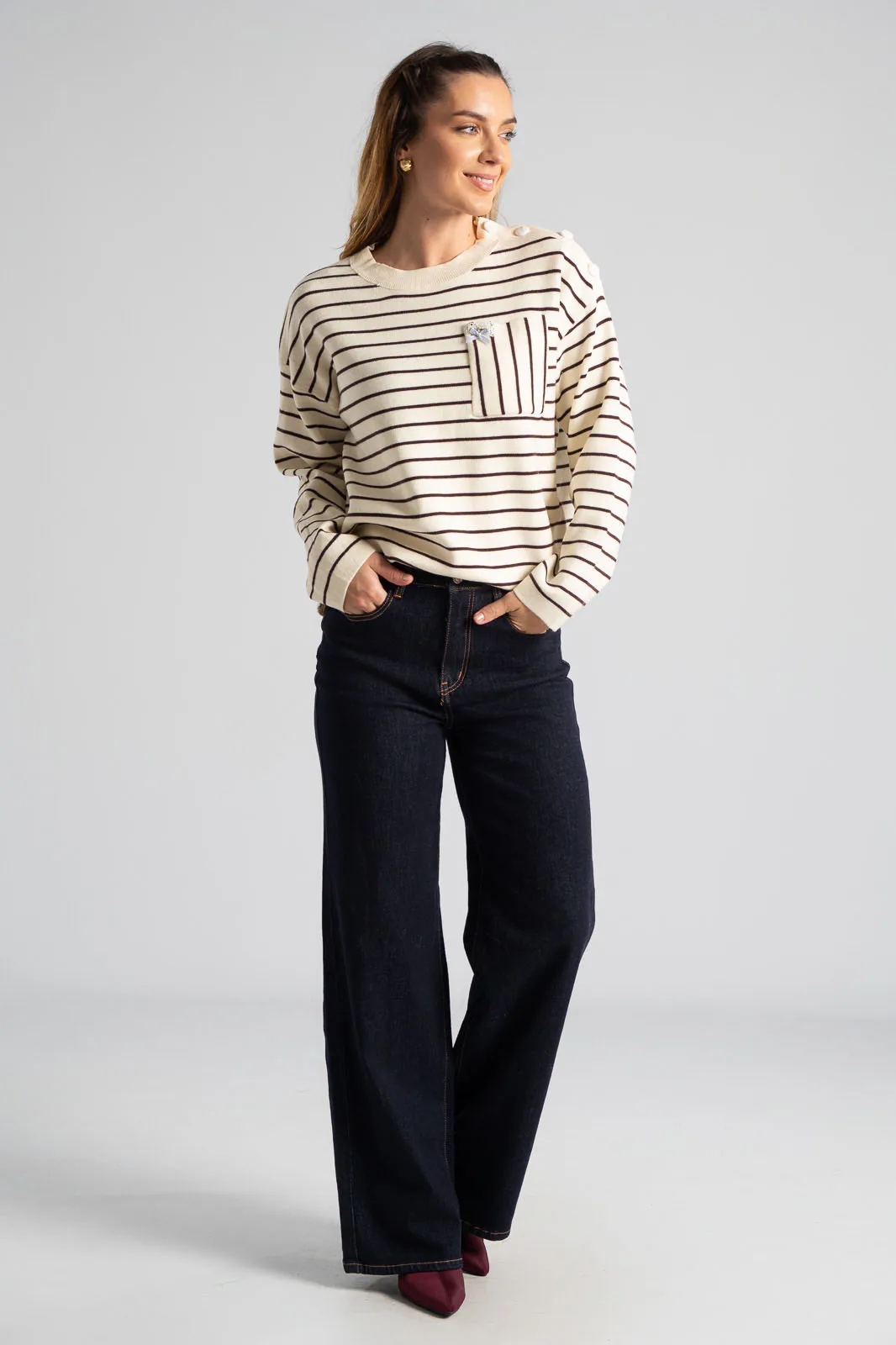 Μπλούζα νημάτινη με συμπαγή πλέξη. Έχει μακριά μανίκια και στον ώμο έχει διακοσμητικά κουμπιά. Έχει στρογγυλή λαιμόκοψη με rib ύφανση. Έχει ίσια γραμμή και σε όλη την επιφάνεια της έχει ρίγες. Διαθέτει τσέπη στο ύψος του στήθους. Οι μετρήσεις του πίνακα είναι αντιπροσωπευτικές για κάθε κωδικό. 40% polyester, 38% wool, 20% polyamide, 2% elastan.