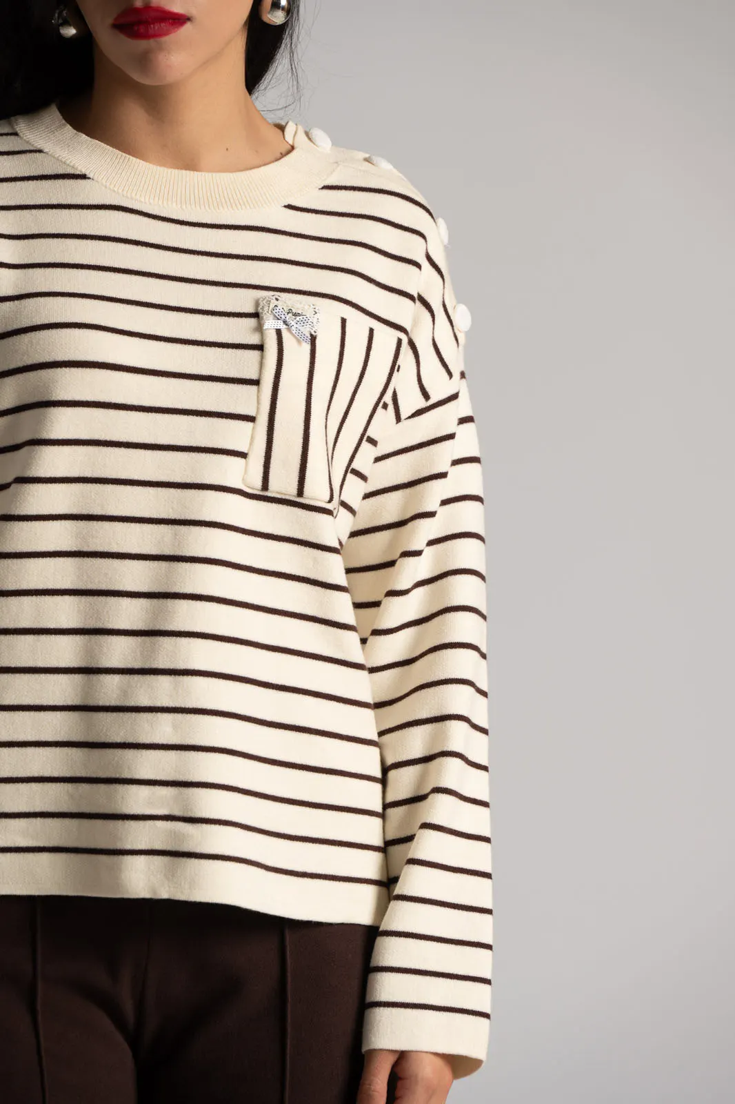 Blouse with compact knit. It has long sleeves and decorative buttons on the shoulder. It has a round neckline with ribbed fabric. It has a straight cut and stripes all over. It has a pocket at chest height. The measurements in the table are representative for each code. 40% polyester, 38% wool, 20% polyamide, 2% elastane.