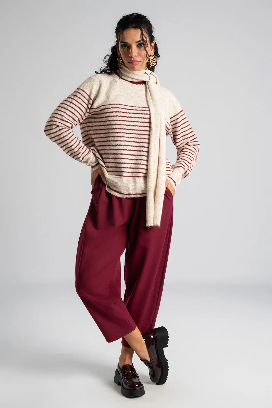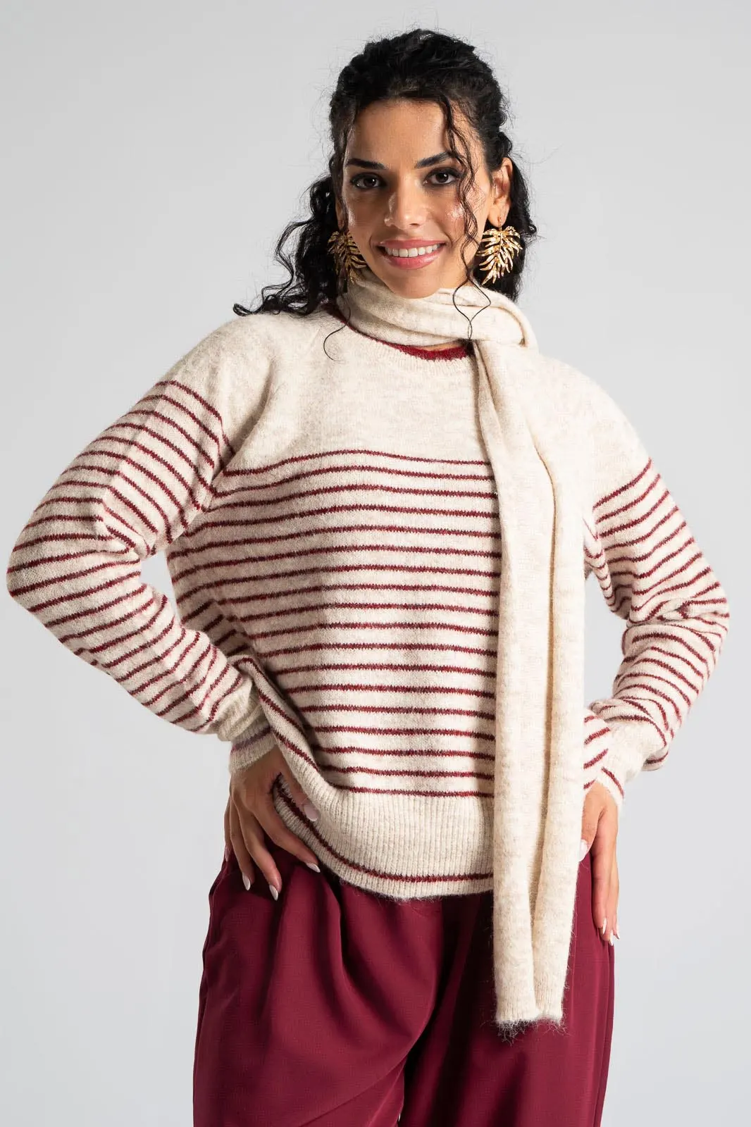 Blouse with loose knit fabric. It has a round neckline and long sleeves. It has horizontal stripes on the surface. It has its own scarf in the same shade and texture. The measurements in the table are representative for each code. 29% polyamide, 50% viscose, 20% polyester, 1% elastane.