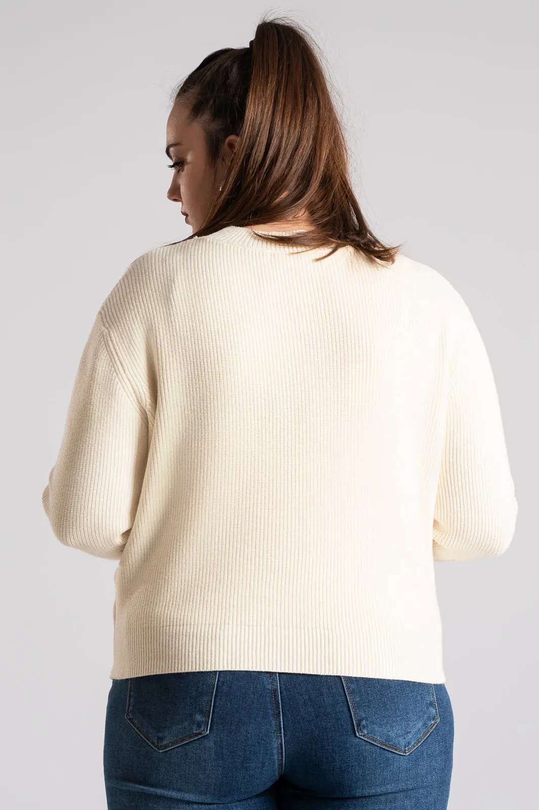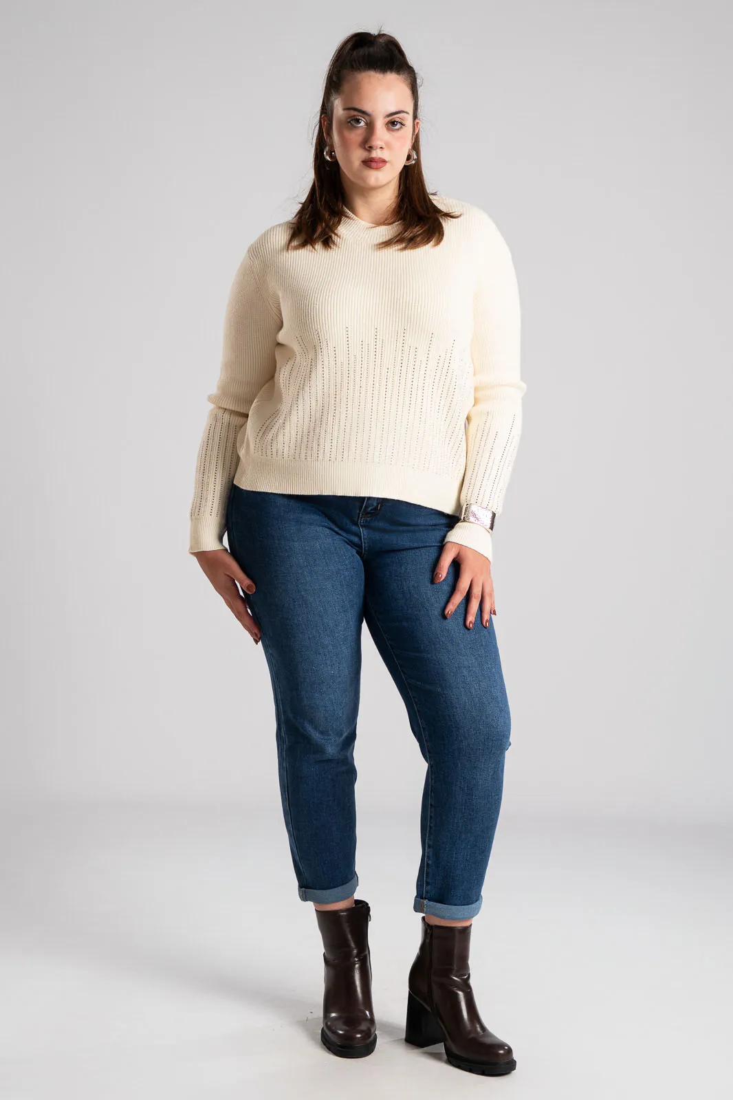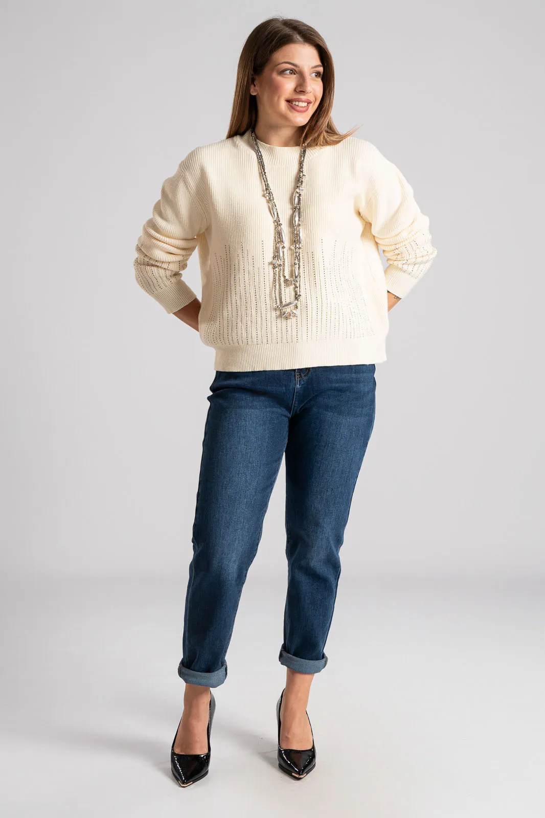 Blouse with compact yarn knit. It has a round neckline and long sleeves. The hem of the blouse and the cuffs are decorated with vertical rhinestones. The measurements in the table are representative for each code. 65% viscose, 35% nylon.
